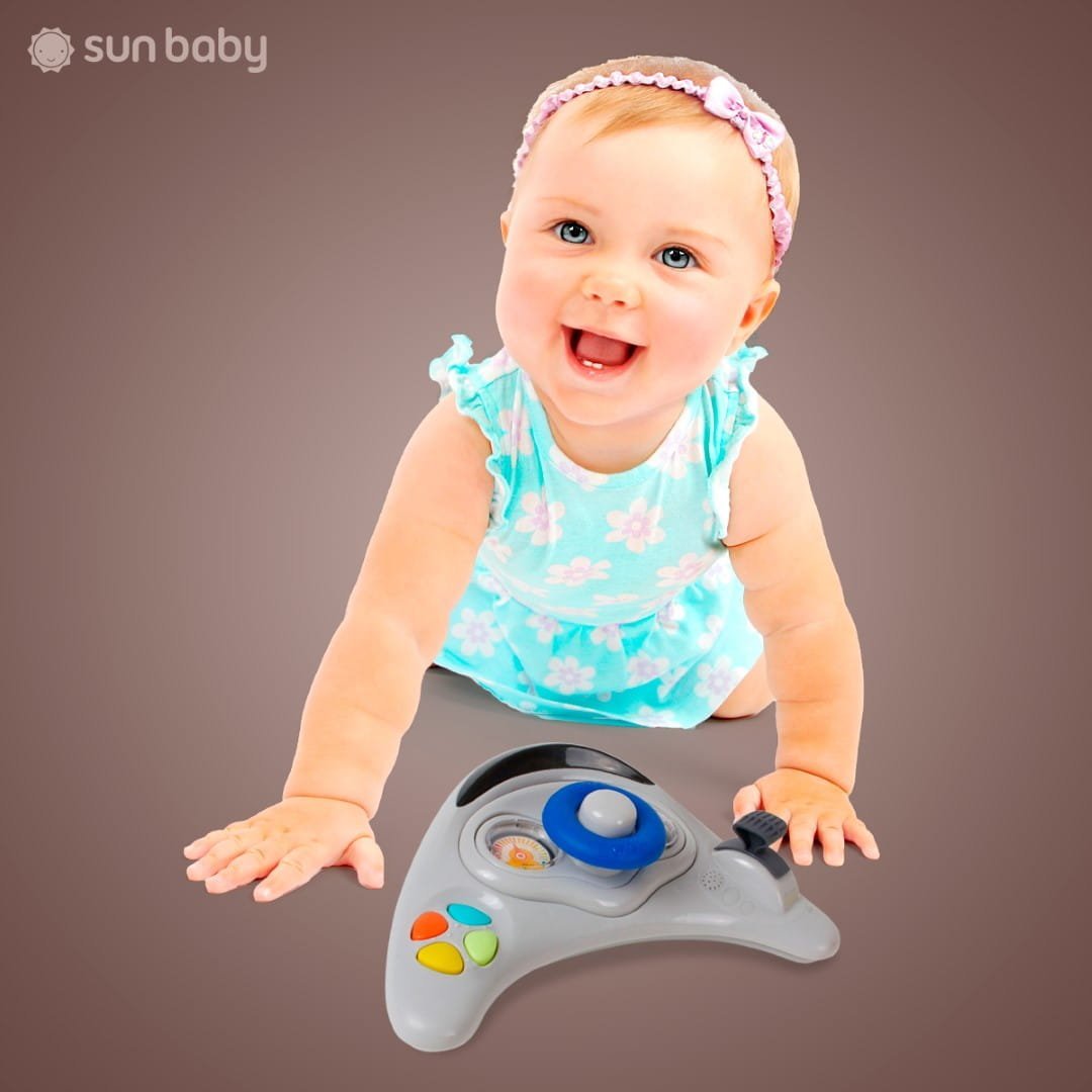 Das Bedienfeld mit Knöpfen, Lenkrad und Spiegeln weckt die Aufmerksamkeit des Kindes und regt zum Spielen an.