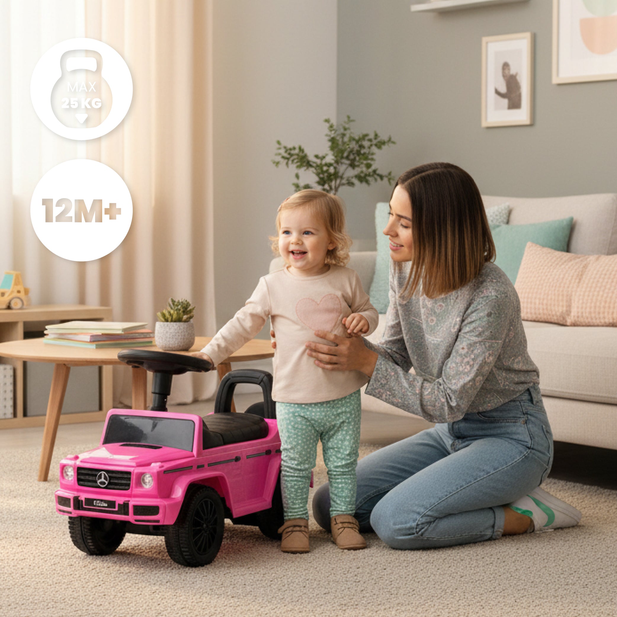Der lizenzierte Mercedes-Benz G350d Rutschwagen in Rosa ist ein elegantes und robustes Fahrzeug für die Kleinsten. Er vereint die Funktionen von Rutschauto, Schiebewagen und Lauflernhilfe, fördert die kindliche Entwicklung und sorgt für sicheren und spaßigen Spielspaß – jeden Tag. Er ist das perfekte Rutschauto für einjährige Kinder und wird jeden kleinen Autofan begeistern.