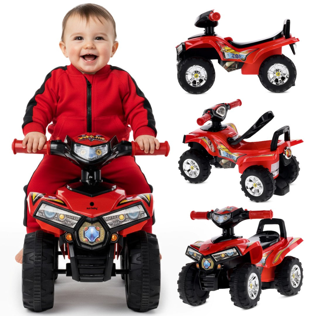 Sun Baby Quad-Fahrzeug für einjährige Babys, Rot – Kinderfahrzeug für Jungen mit Geräuschen, Lichtern und Stauraum