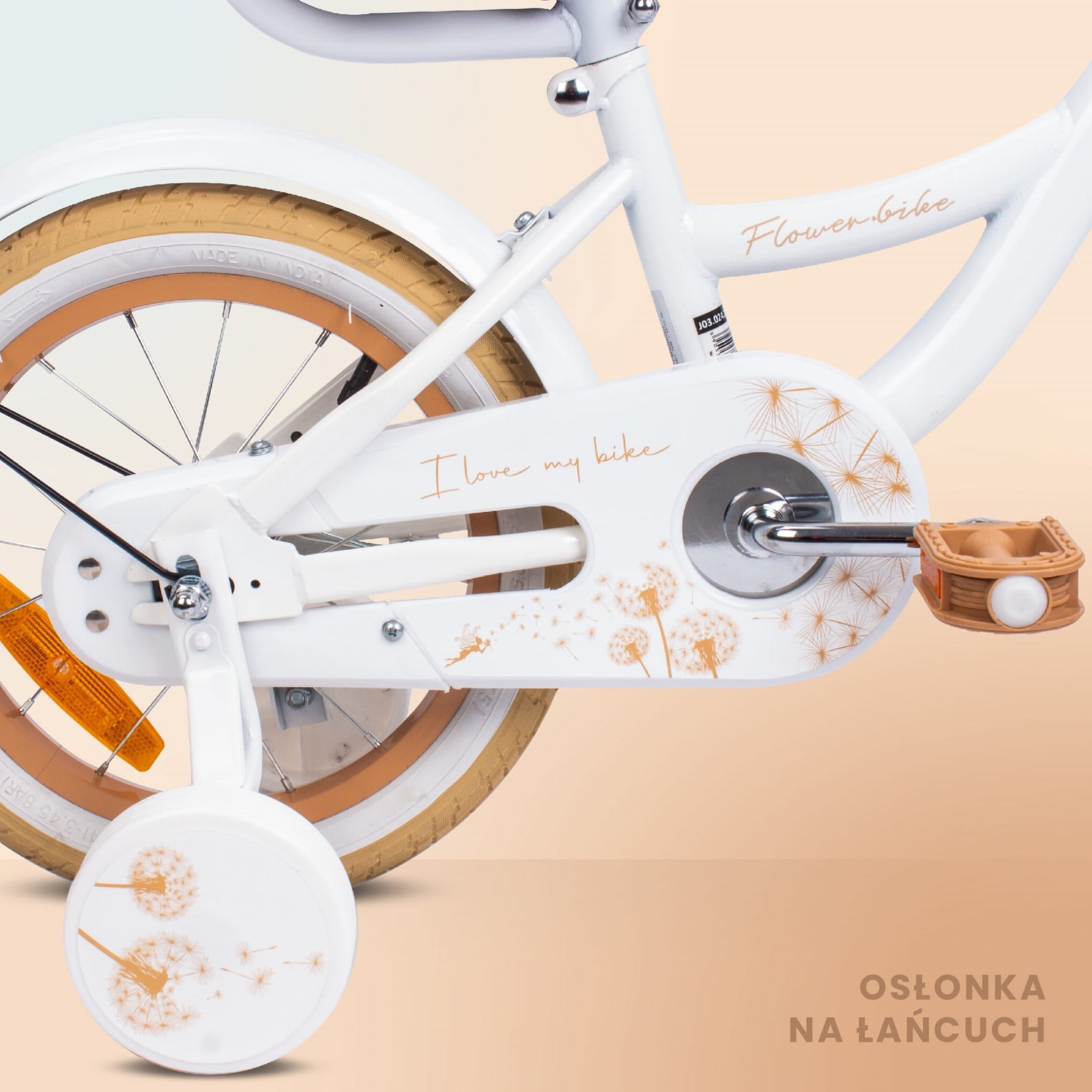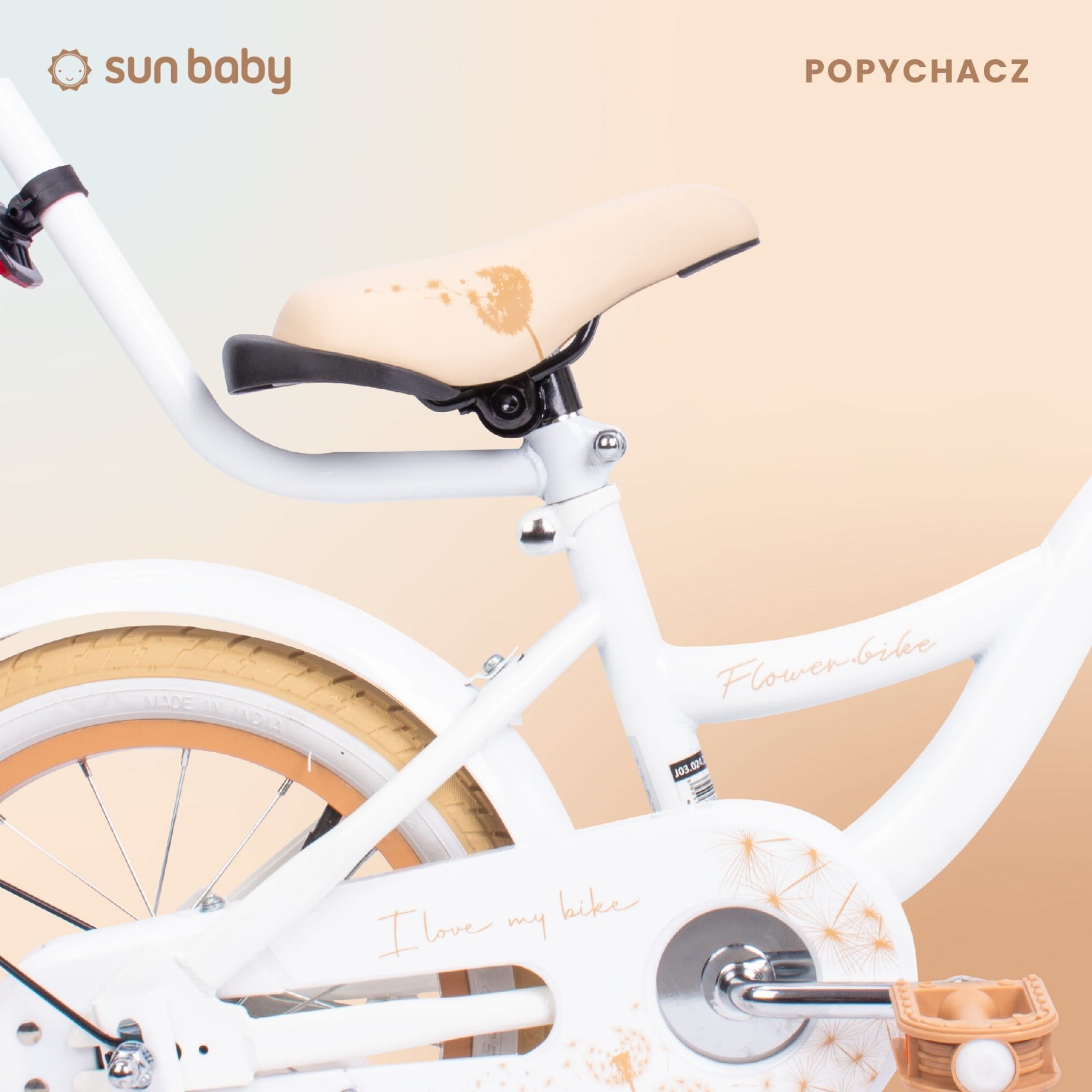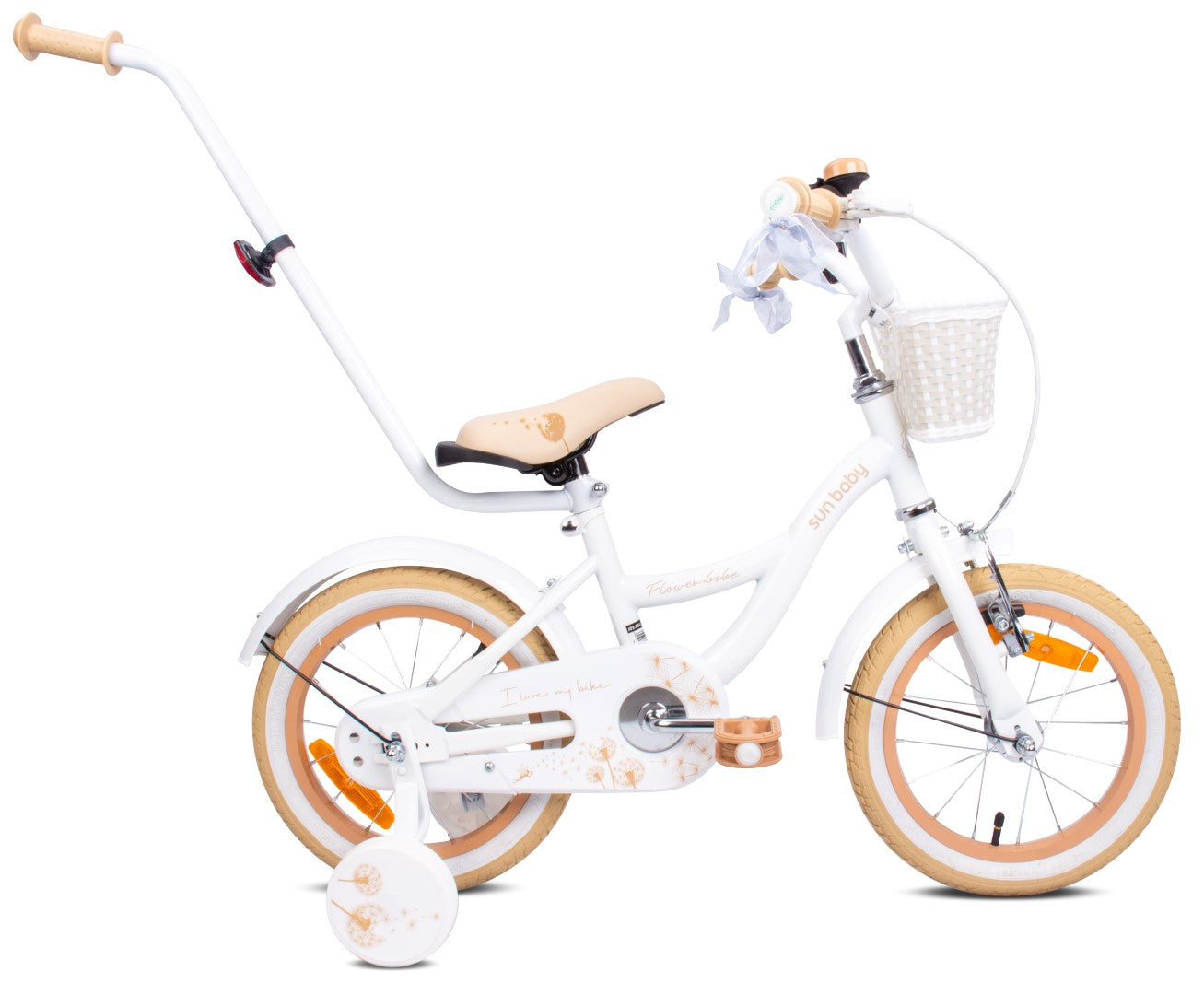 14-Zoll-Mädchenfahrrad mit Schieber, Seitenrädern, Korb, Blumenmotiv, Löwenzahn, weiß-beige, Sonnenbaby