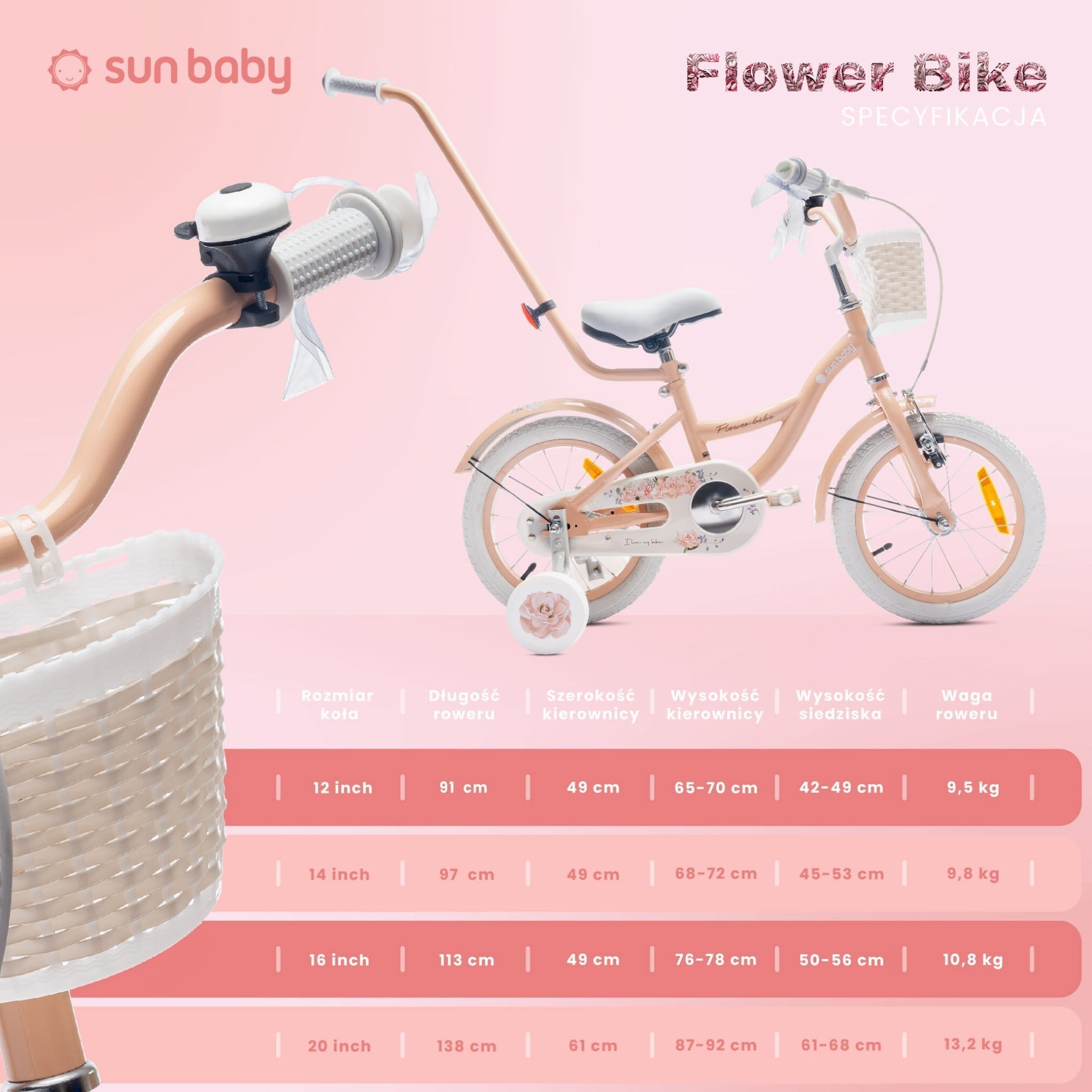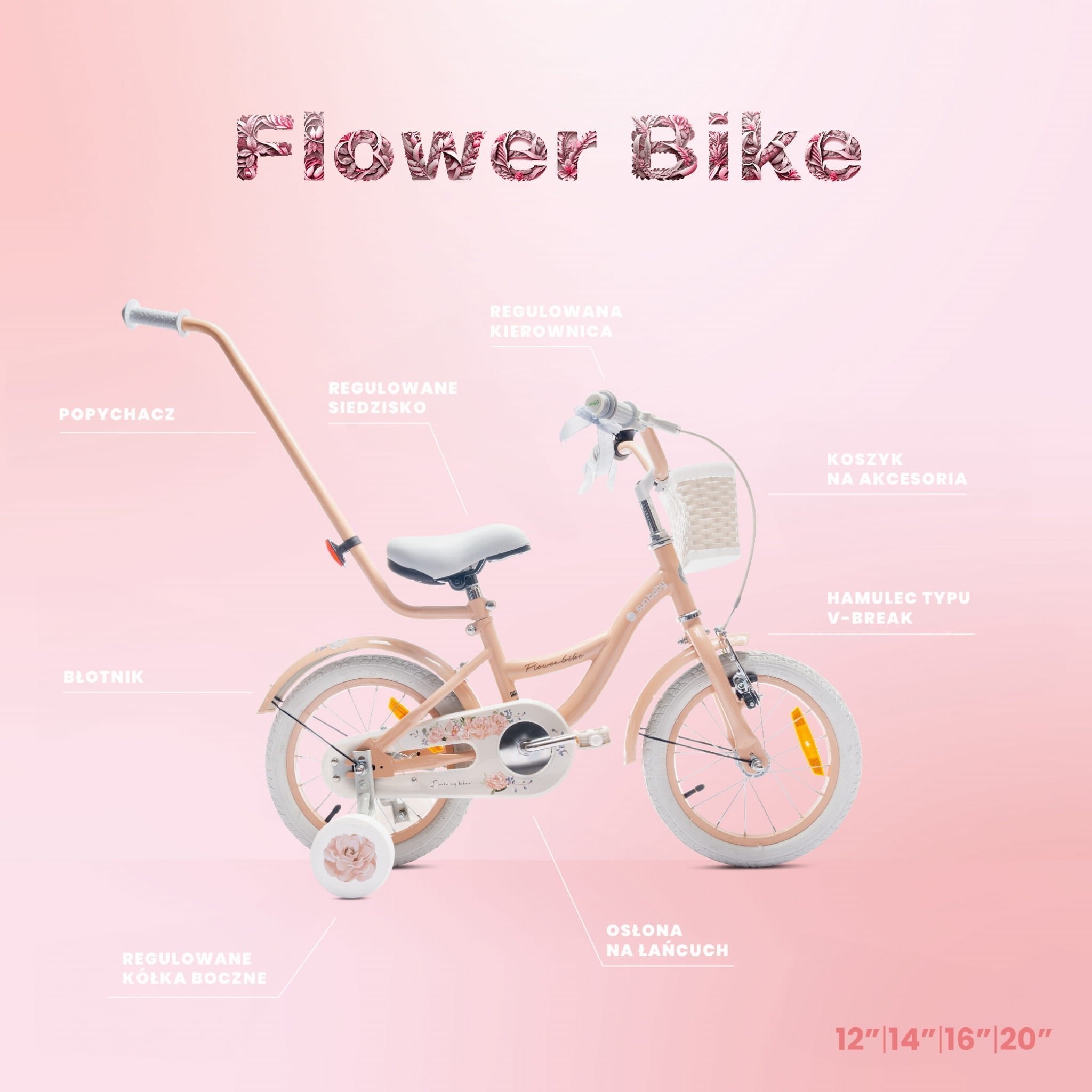 Das Flower Bike ist ein bezauberndes Fahrrad für Mädchen, das klassisches Design mit Funktionalität vereint. Dezente Details machen jede Fahrt zu einem fröhlichen Abenteuer. Perfekt für kleine Radfahrerinnen, die sicher und stilvoll Radfahren lernen möchten. Die leichte und robuste Konstruktion sorgt für Stabilität, während der verstellbare Sitz und Lenker eine Anpassung an die Körpergröße des Kindes ermöglichen. Seitliche Räder unterstützen erste Fahrversuche, und der Korb bietet Platz für Lieblingsspielzeug oder kleine Gegenstände. Zusätzlich erleichtert der Lenker der Begleitperson die Kontrolle und sorgt so für Sicherheit bei Spaziergängen. Produktmerkmale: