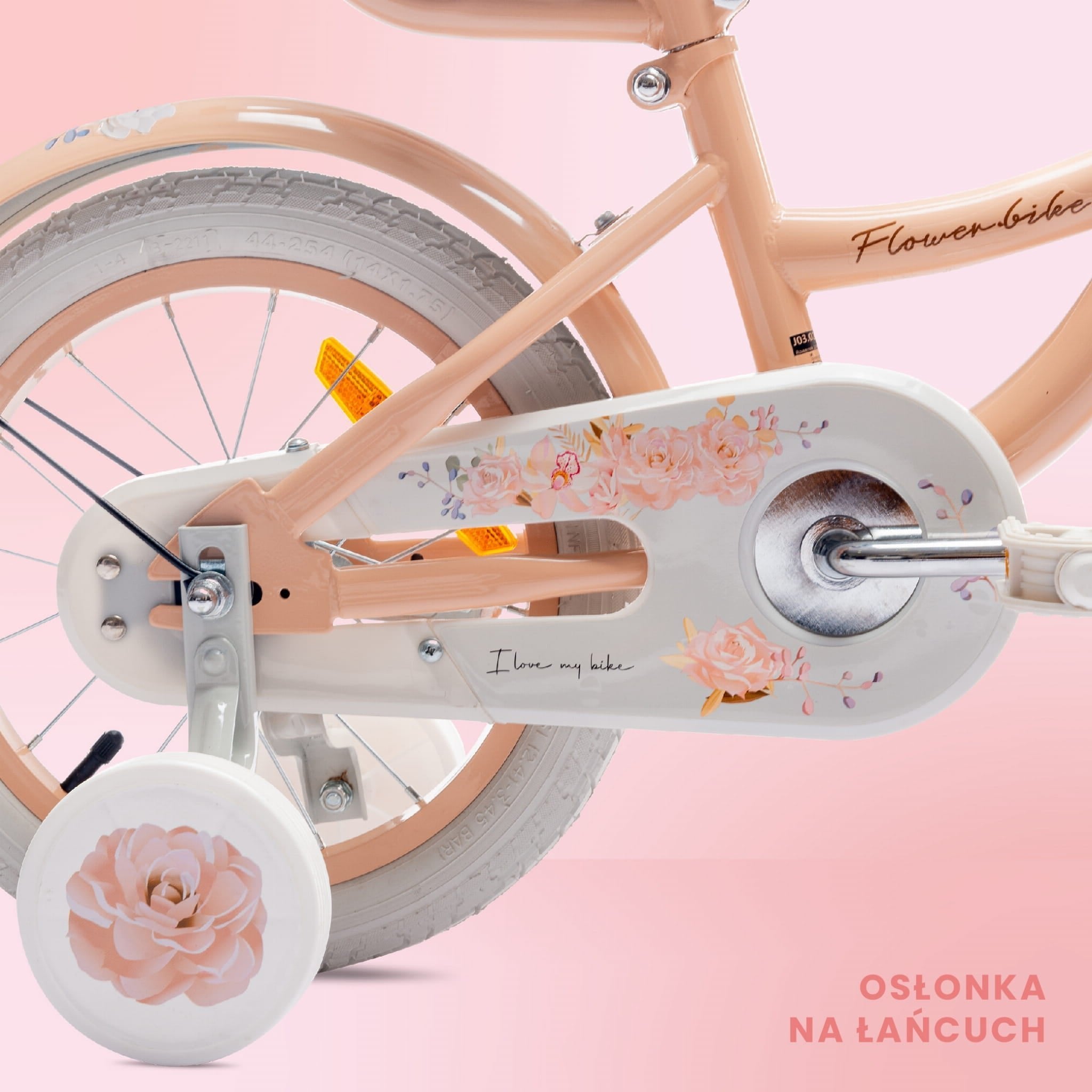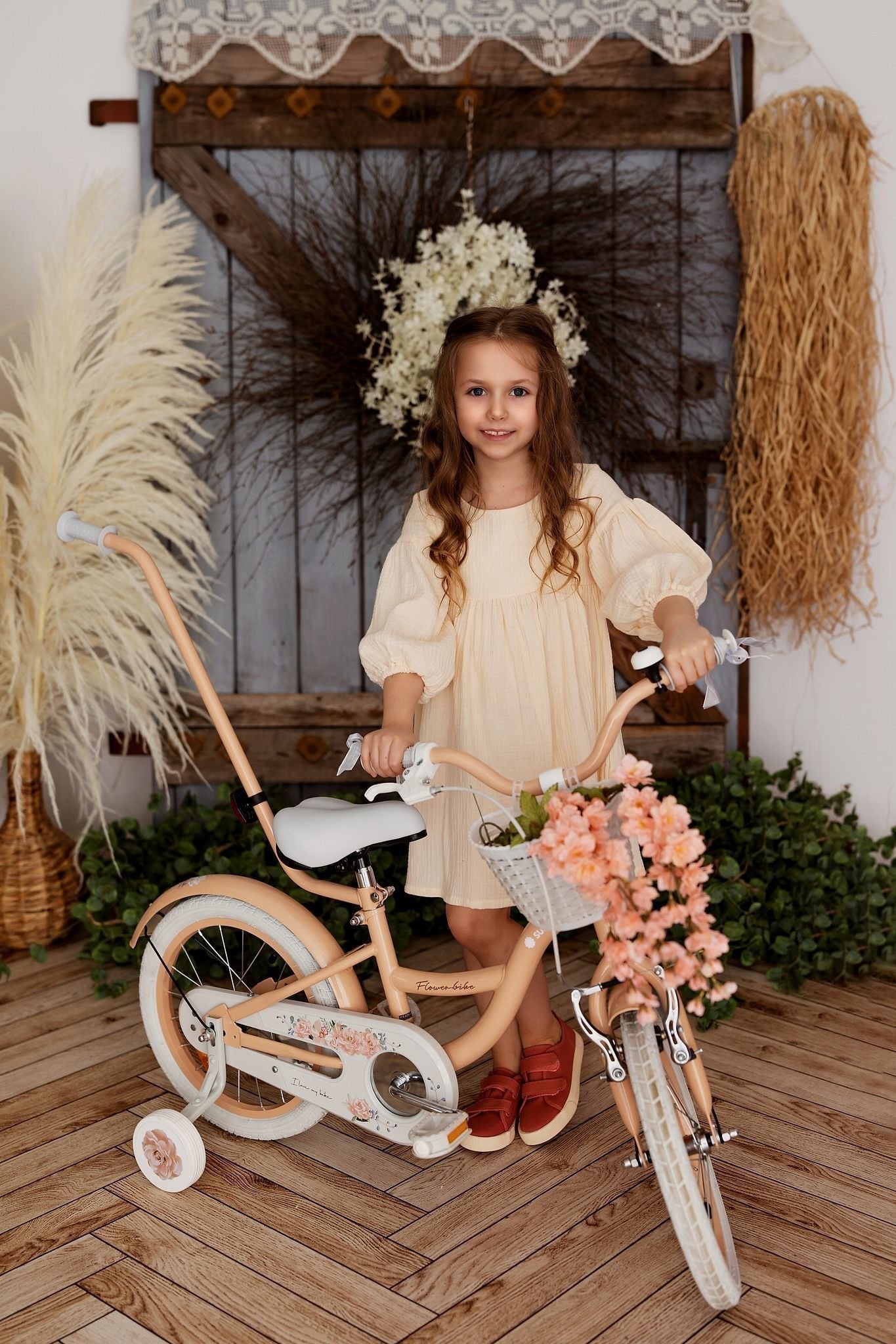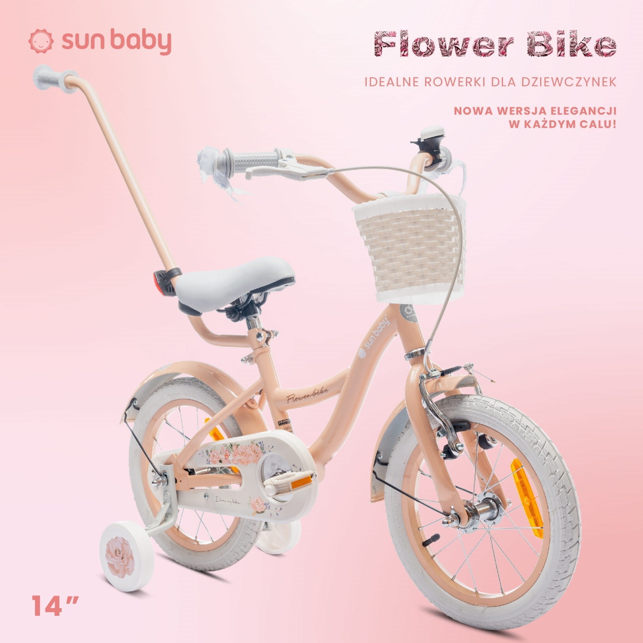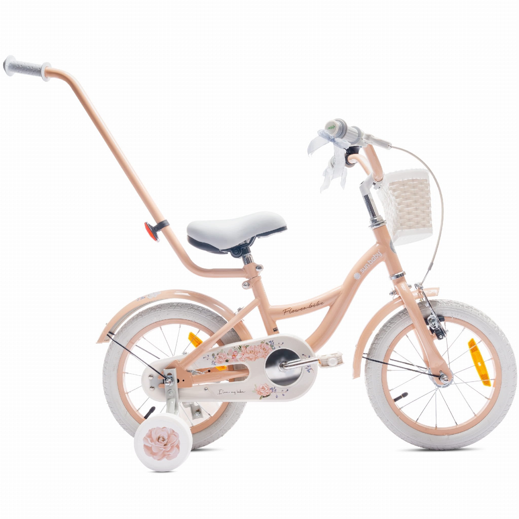 14-Zoll-Mädchenfahrrad mit Schieber, Seitenrädern und Korb, Blumenfahrrad, aprikosenfarben