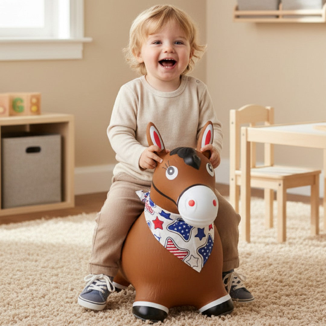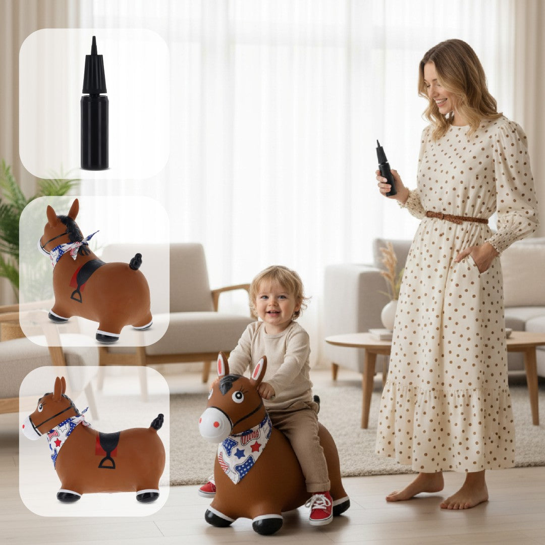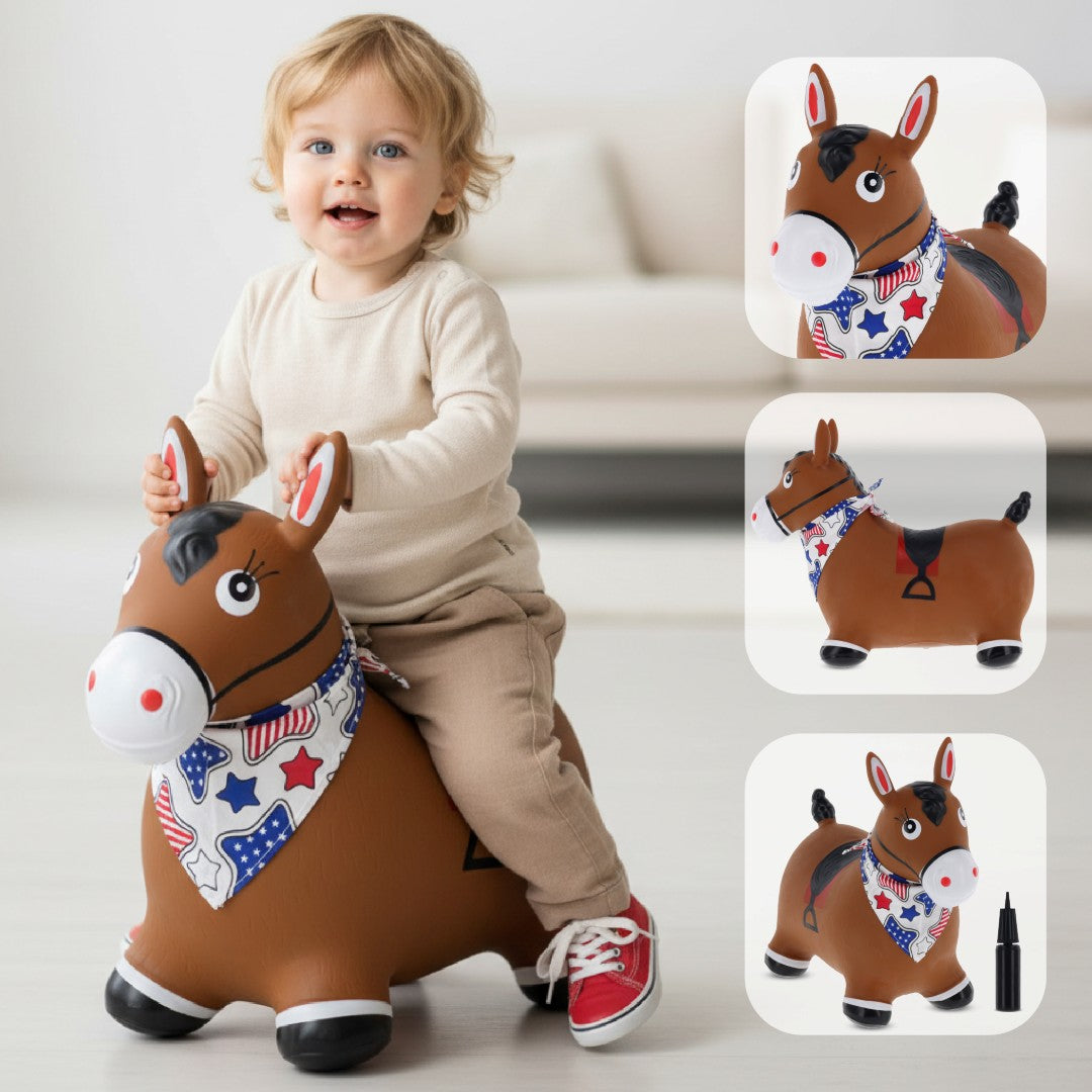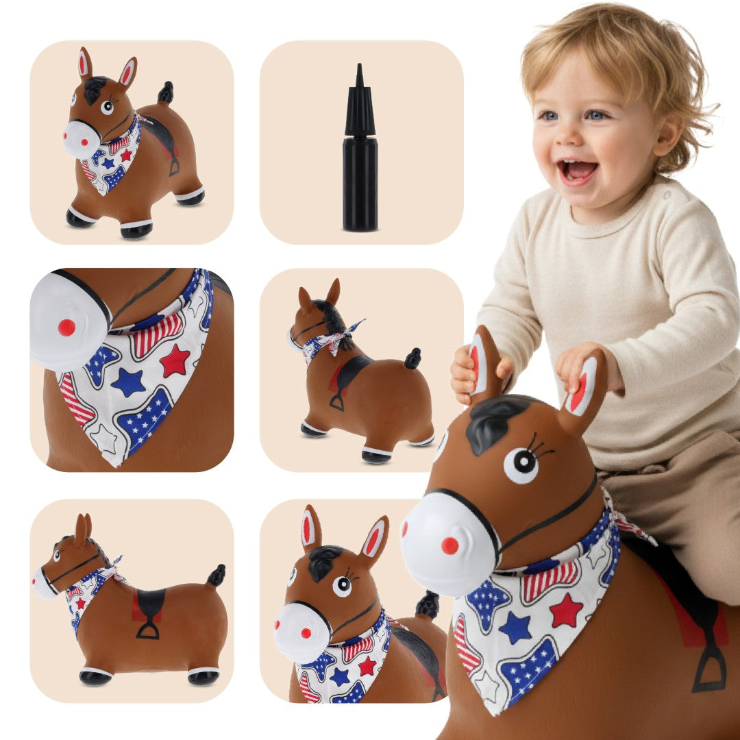 Kinder-Hüpfhammel mit Pumpe, braunes Pferd mit Sonnenbaby-Bandana