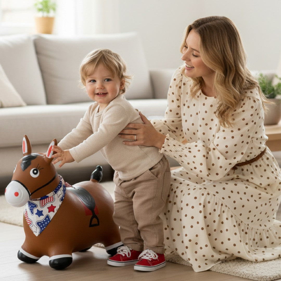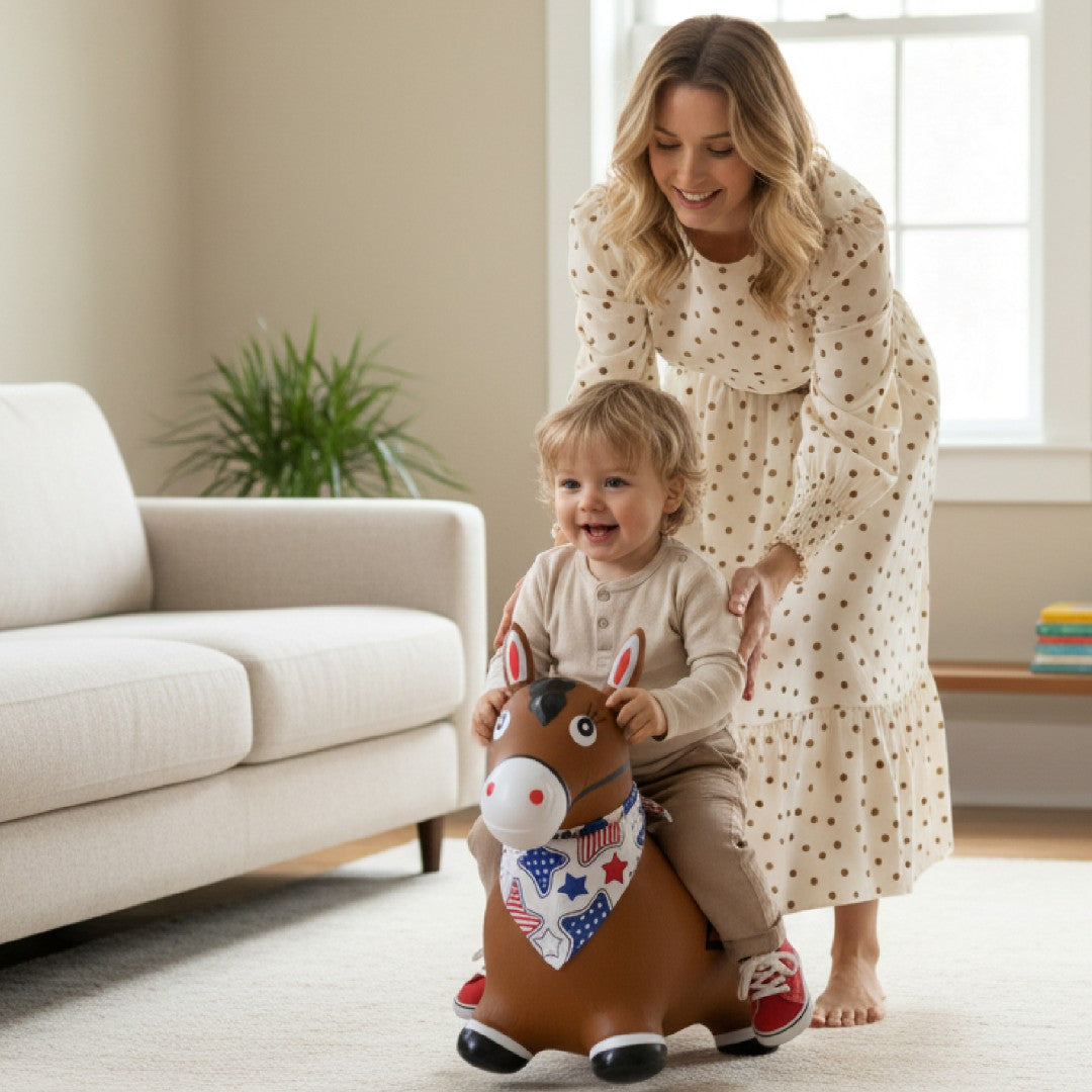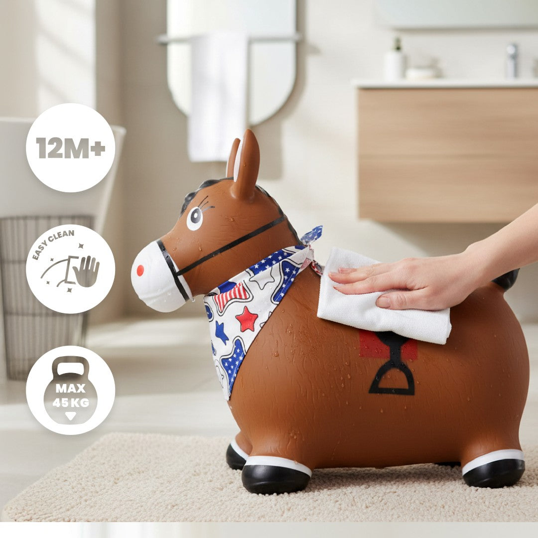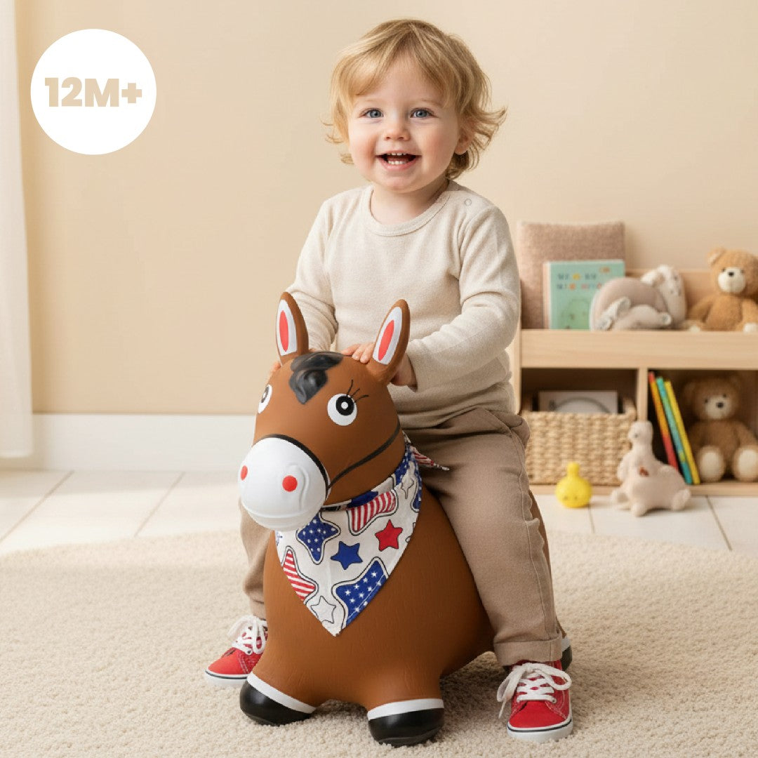 Kinder-Hüpfhammel mit Pumpe, braunes Pferd mit Sonnenbaby-Bandana