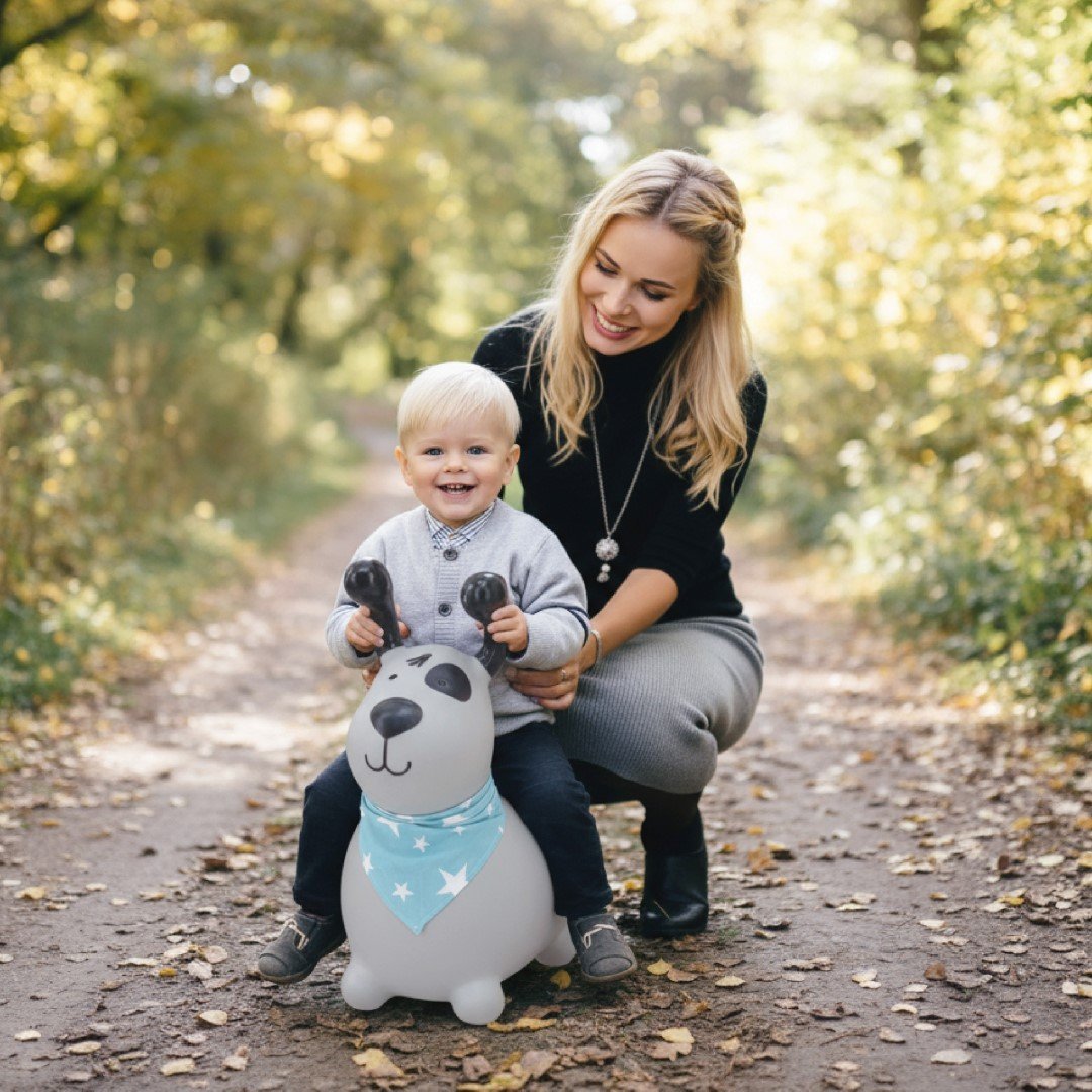 Das Spielen auf einem Hüpfball unterstützt die Entwicklung der motorischen Fähigkeiten – es verbessert die Koordination von Armen und Beinen, stärkt die Muskulatur und lehrt, das Gleichgewicht zu halten.