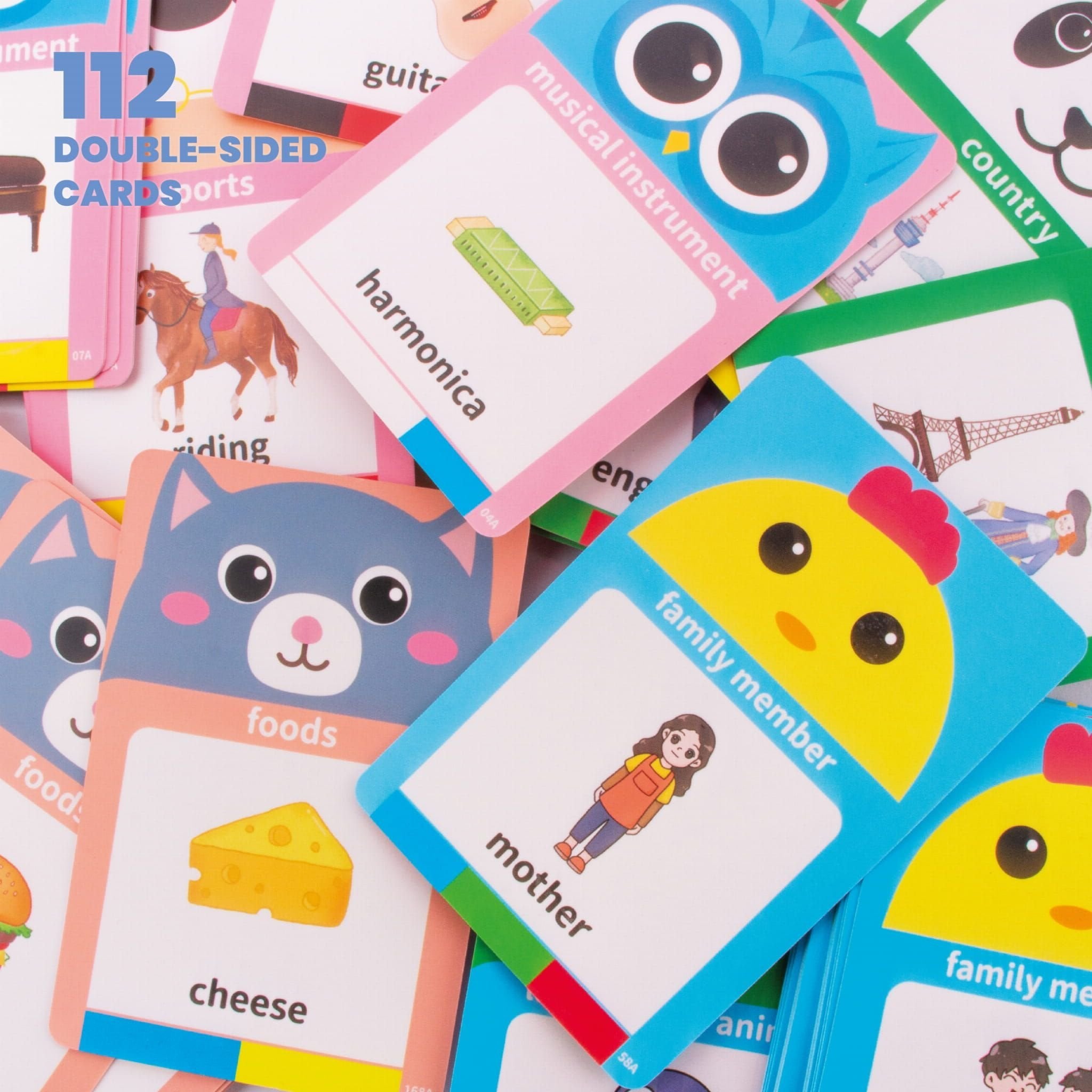 ✔️ Das Set enthält Karten mit vielfältigem Vokabular , das ein breites Spektrum an Themen und Sprachkategorien abdeckt, darunter: Essen, Familie, Musikinstrumente, Länder, prähistorische Dinosaurier, Farben und Körper.