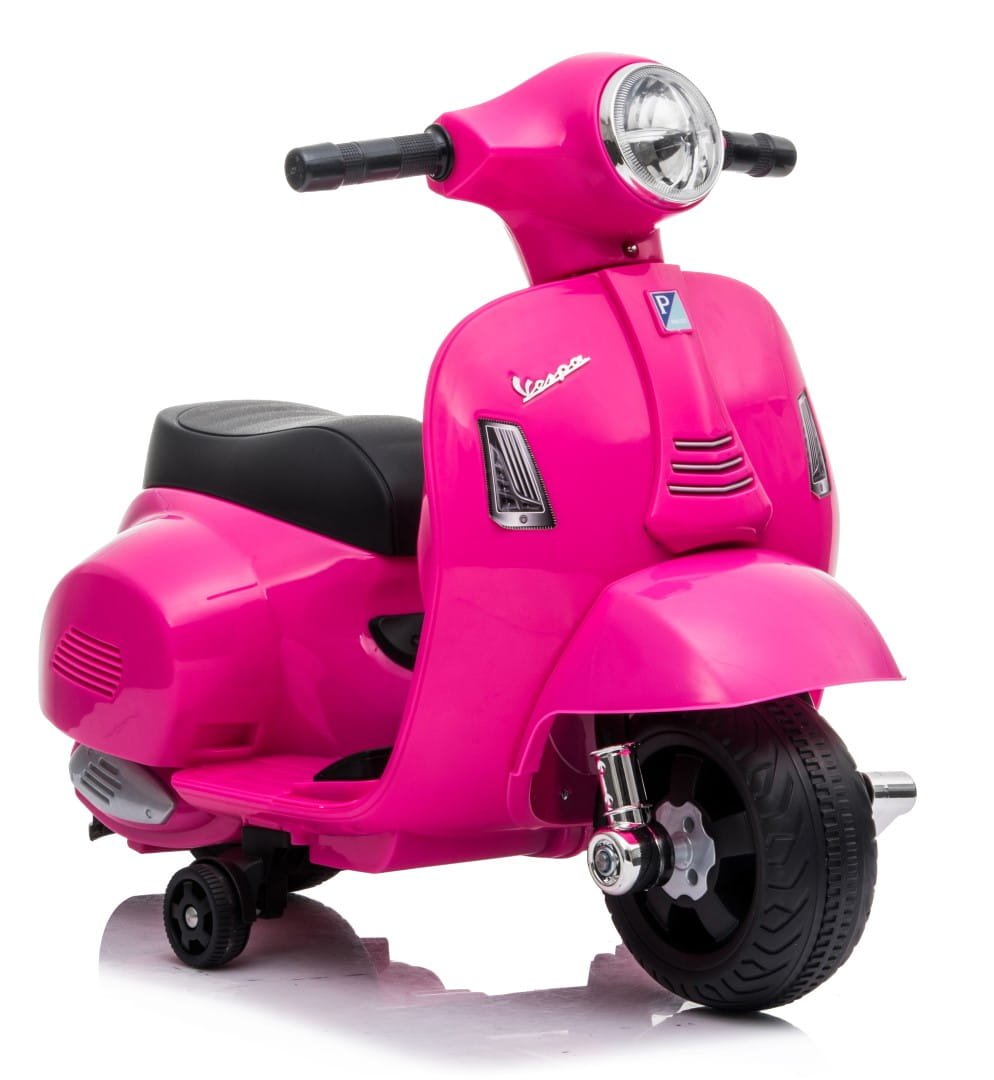 The Vespa scooter is a ride-on device. It's powered by a battery and equipped with a motor appropriate for its size. It features LED lights on both the front and rear. The entire unit is finished in powder pink.