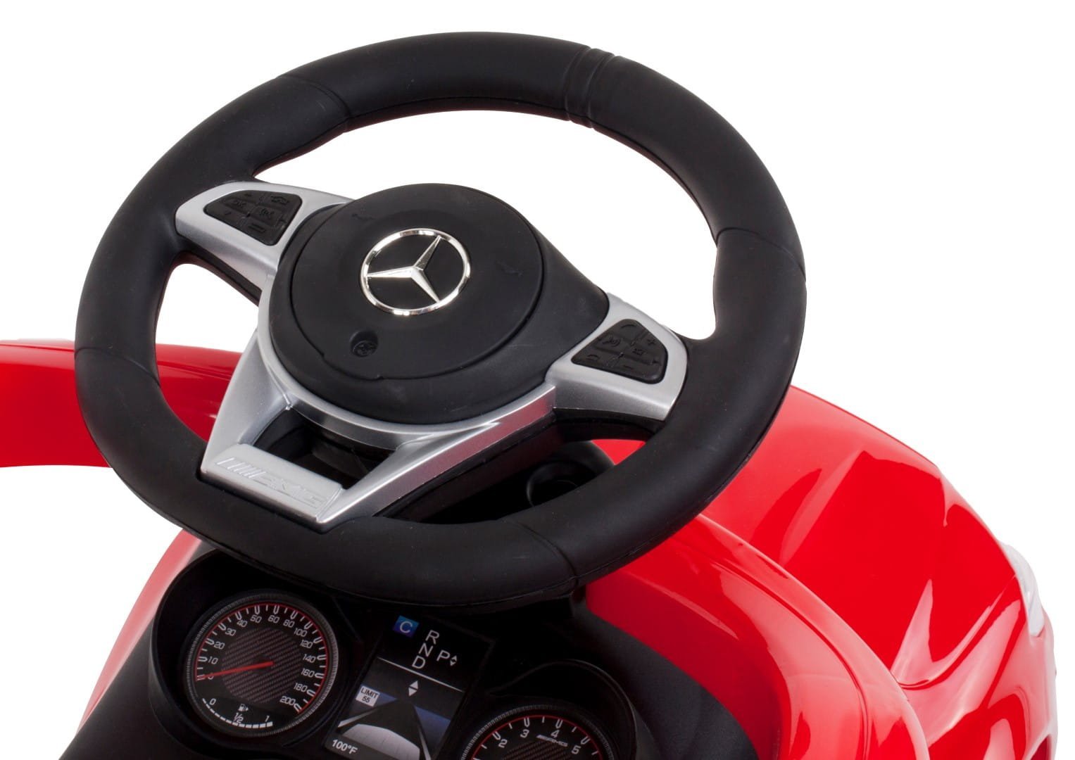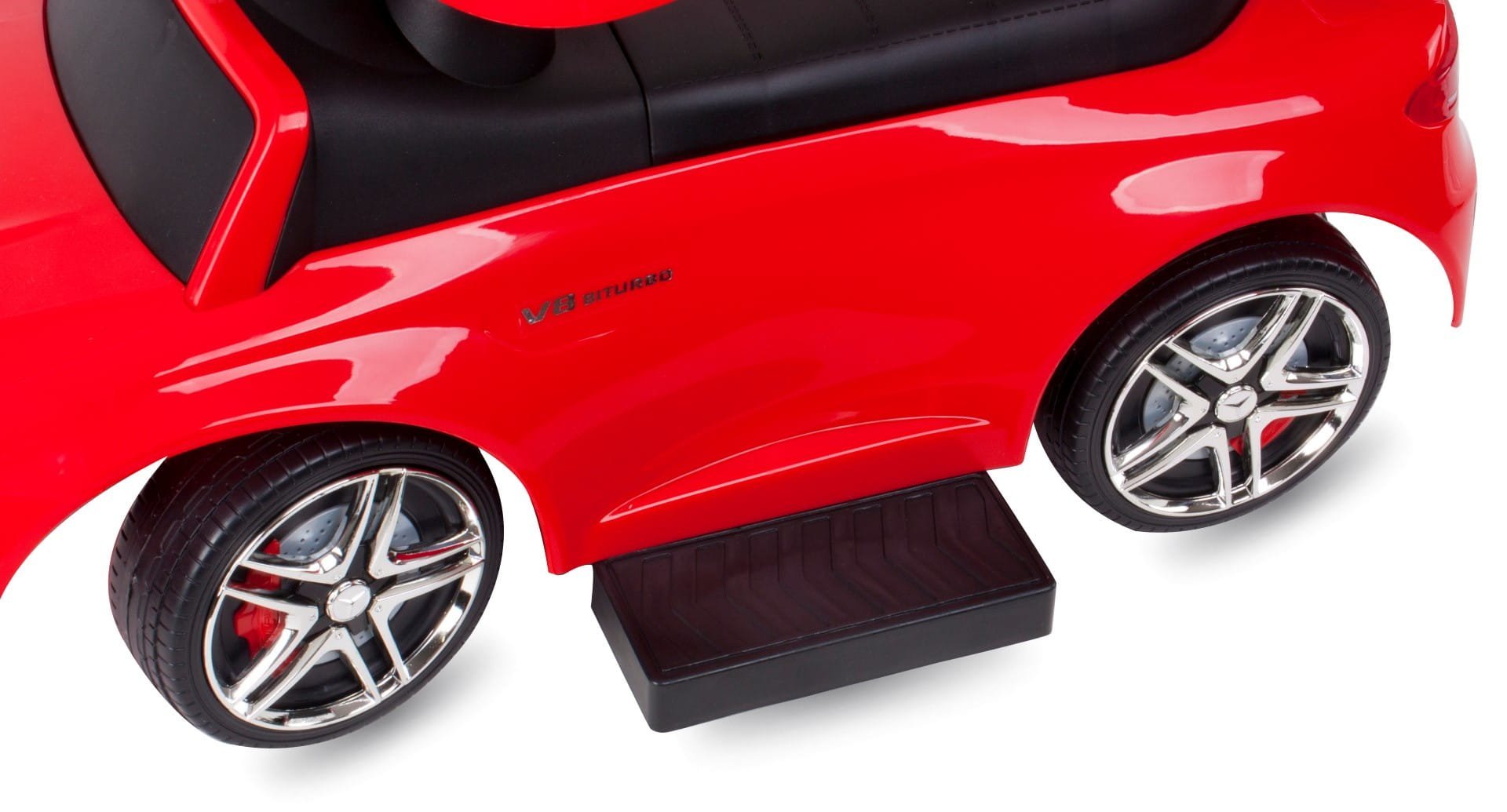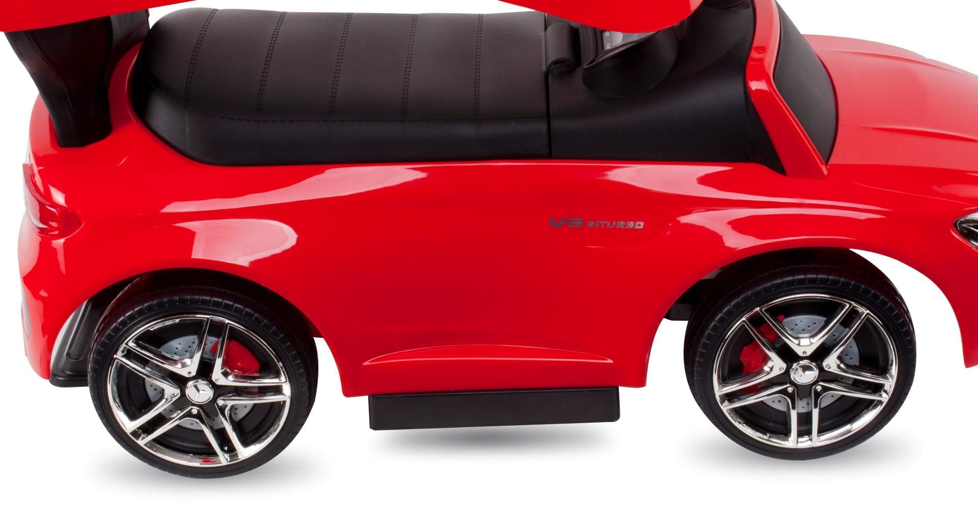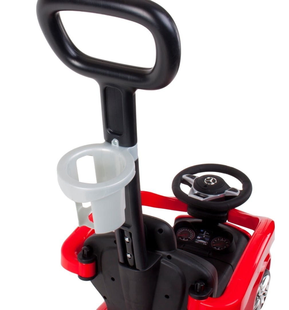 Pchacz ze sterowaniem (odłączany): Pchacz w jeździku marki Mercedes AMG oferuje wszechstronność, umożliwiając rodzicom prowadzenie go za pomocą wygodnej rączki. Jednak istnieje także opcja odłączenia pchacza, co daje starszemu dziecku możliwość samodzielnego poruszania się, rozwijając jego umiejętności motoryczne.