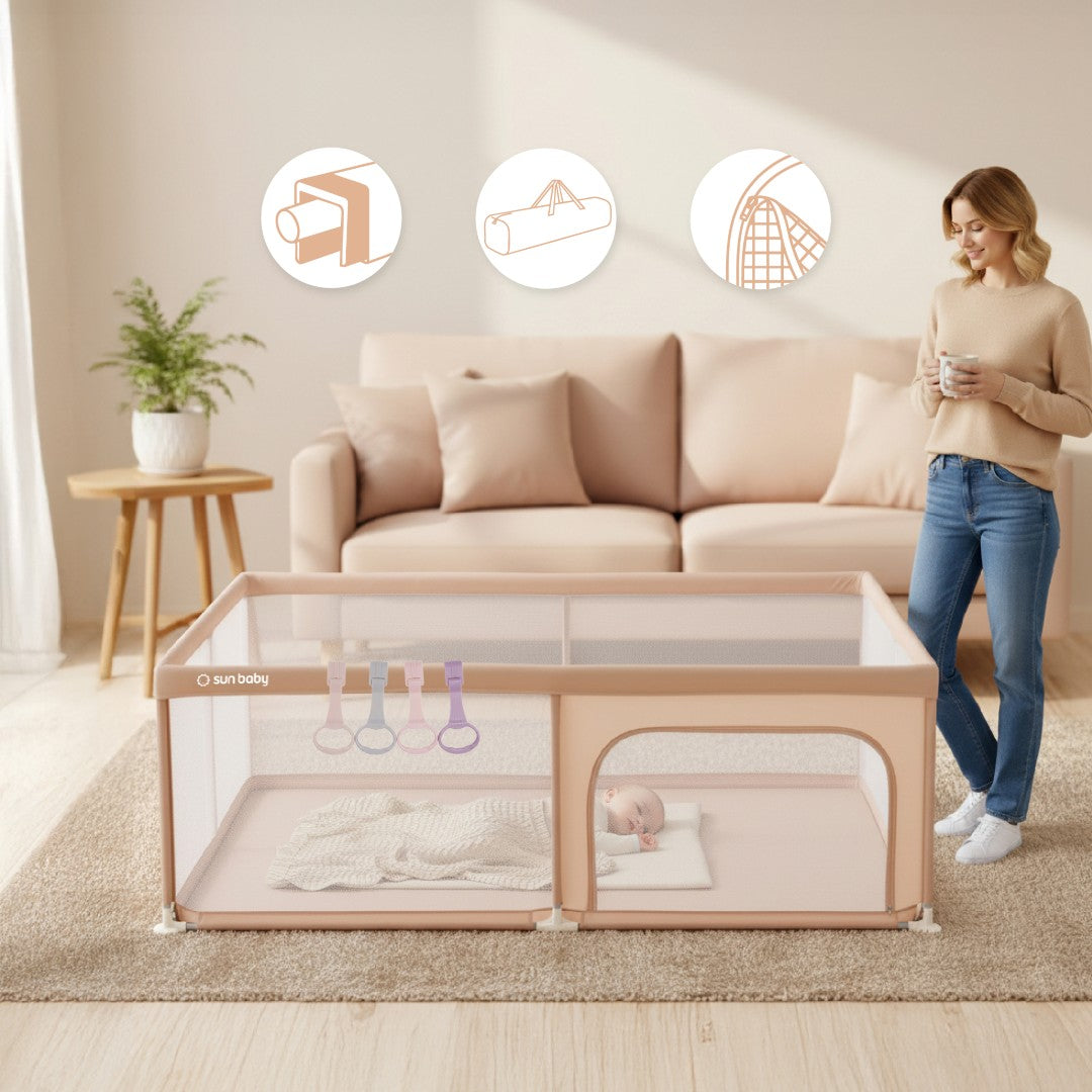 Stwórz swojemu maluchowi bezpieczną i komfortową przestrzeń do zabawy, odpoczynku i nauki nowych umiejętności dzięki dużemu kojcowi Sun Baby! Ten praktyczny zestaw łączy funkcje łóżeczka, placu zabaw i suchego basenu, a dołączone uchwyty pomagają dziecku pewnie wstawać i rozwijać motorykę. Solidna konstrukcja, przewiewne ścianki i przemyślane zabezpieczenia dają rodzicom spokój ducha, a dziecku – mnóstwo radości i swobody w bezpiecznym otoczeniu.