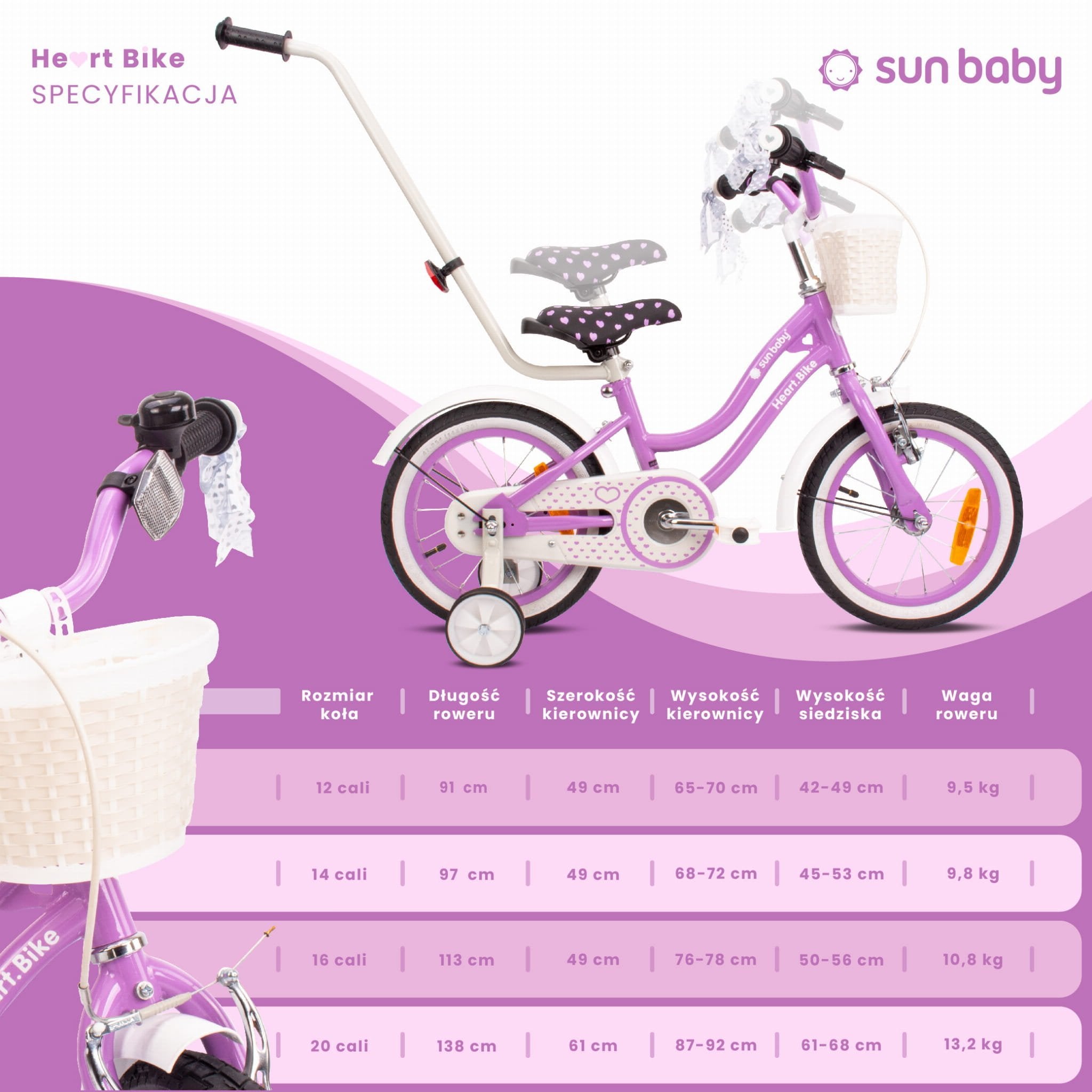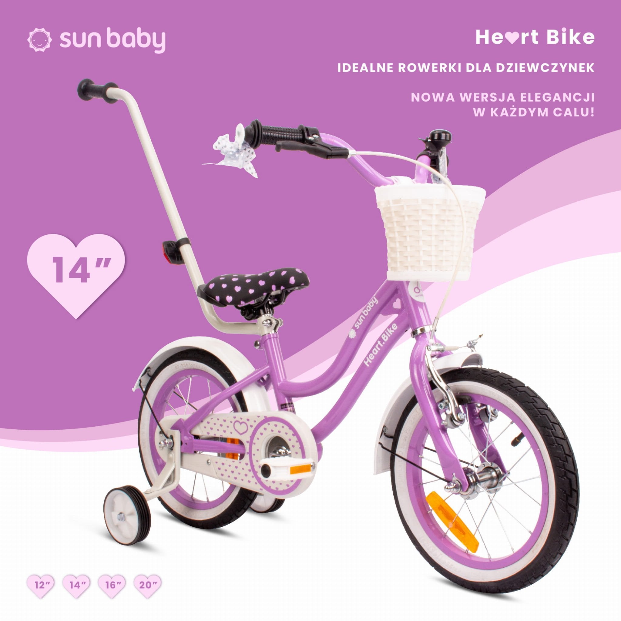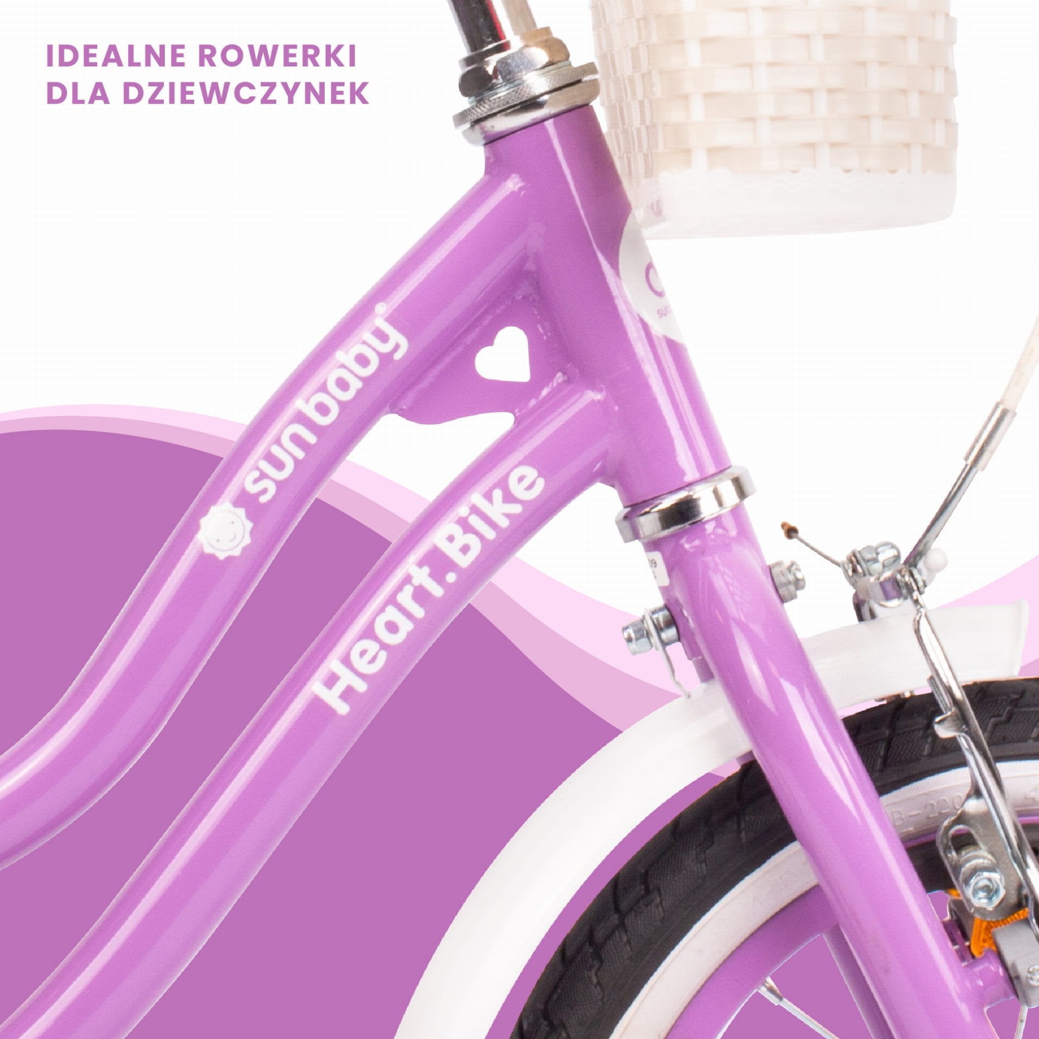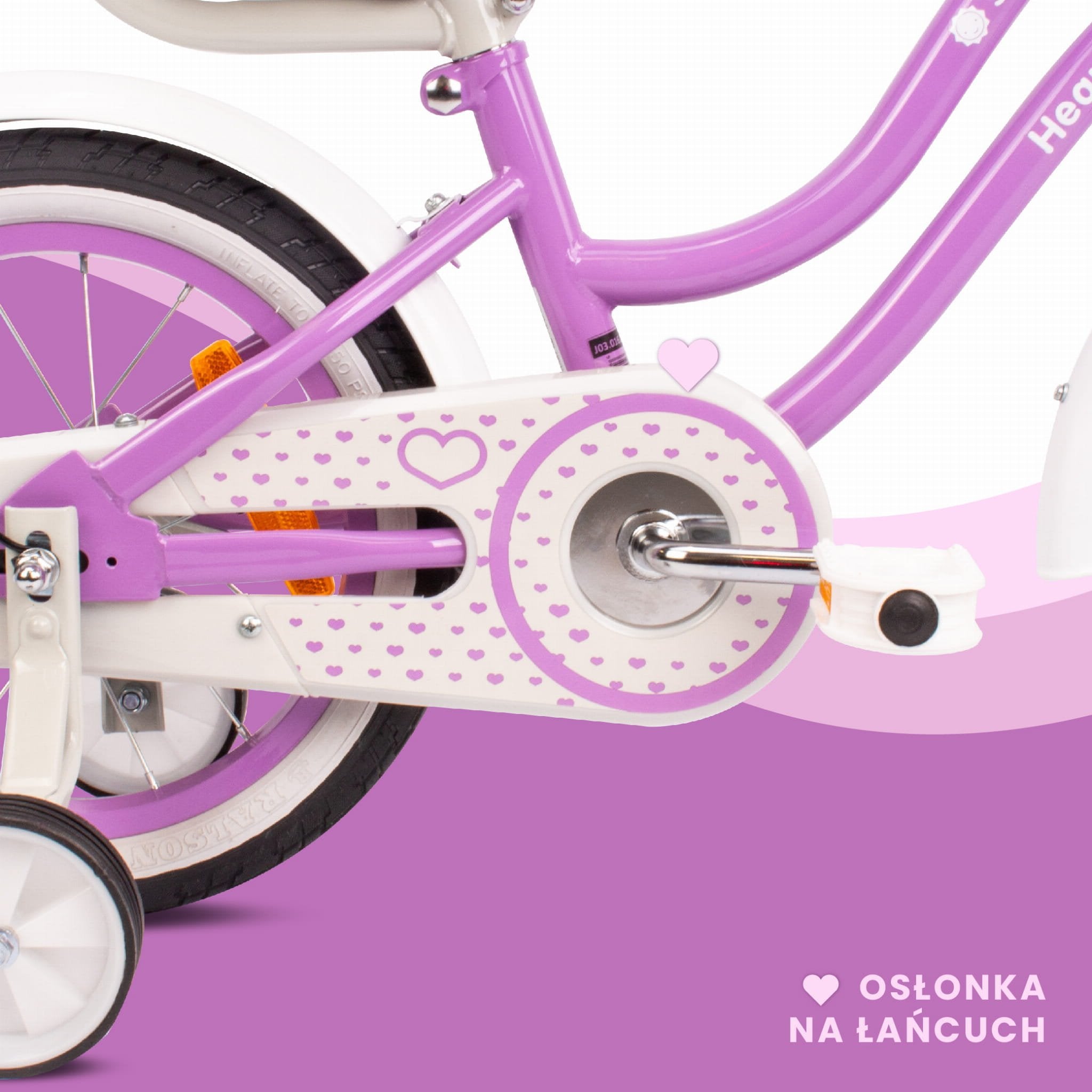 Heart Bike – a 14-inch children's bike in purple. Equipped with training wheels, a push bar, a basket, and a bell, it's the perfect model for girls aged 3-5. The sturdy steel frame, adjustable saddle and handlebars, and full fenders ensure comfort and safety while learning to ride.