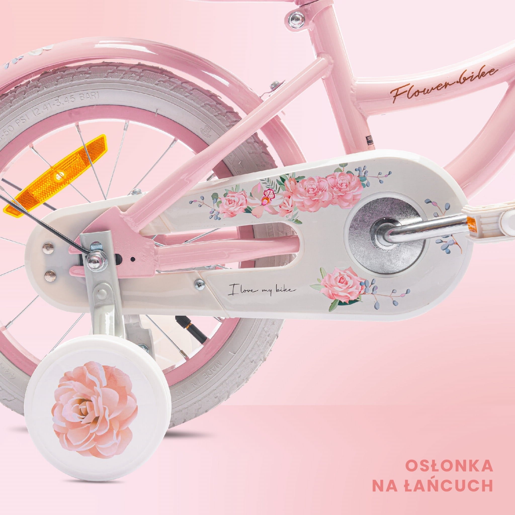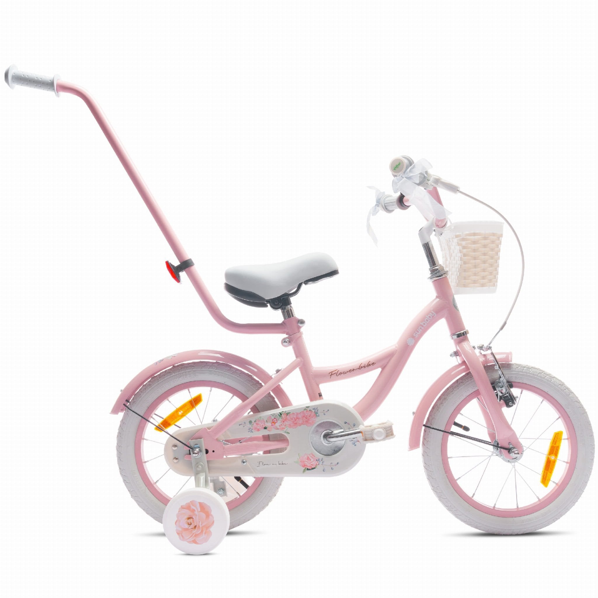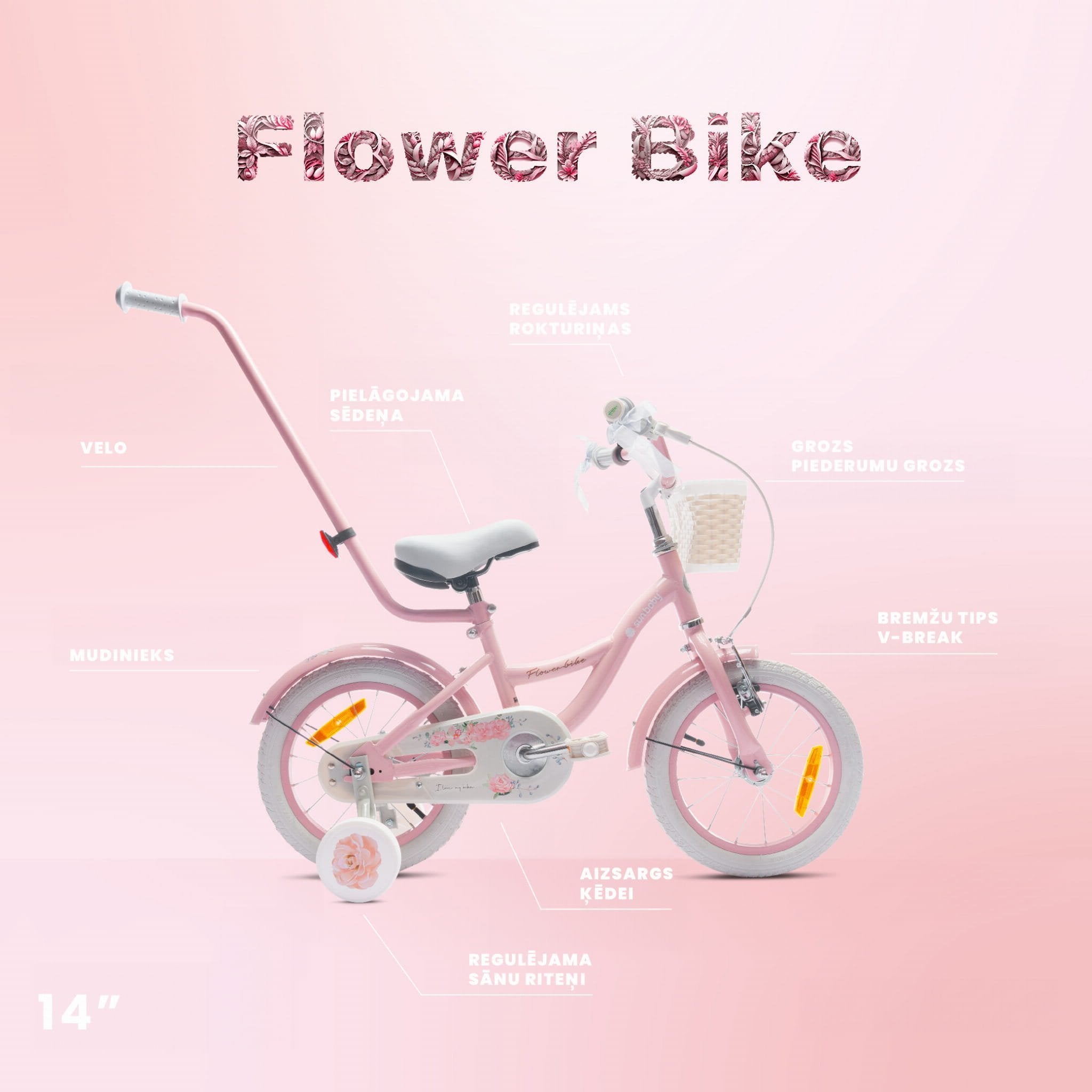 Flower Bike – a children's bike with training wheels, a push bar, metal fenders, a basket, and a bell. Equipped with a large chain guard, a front V-brake, and reflectors.