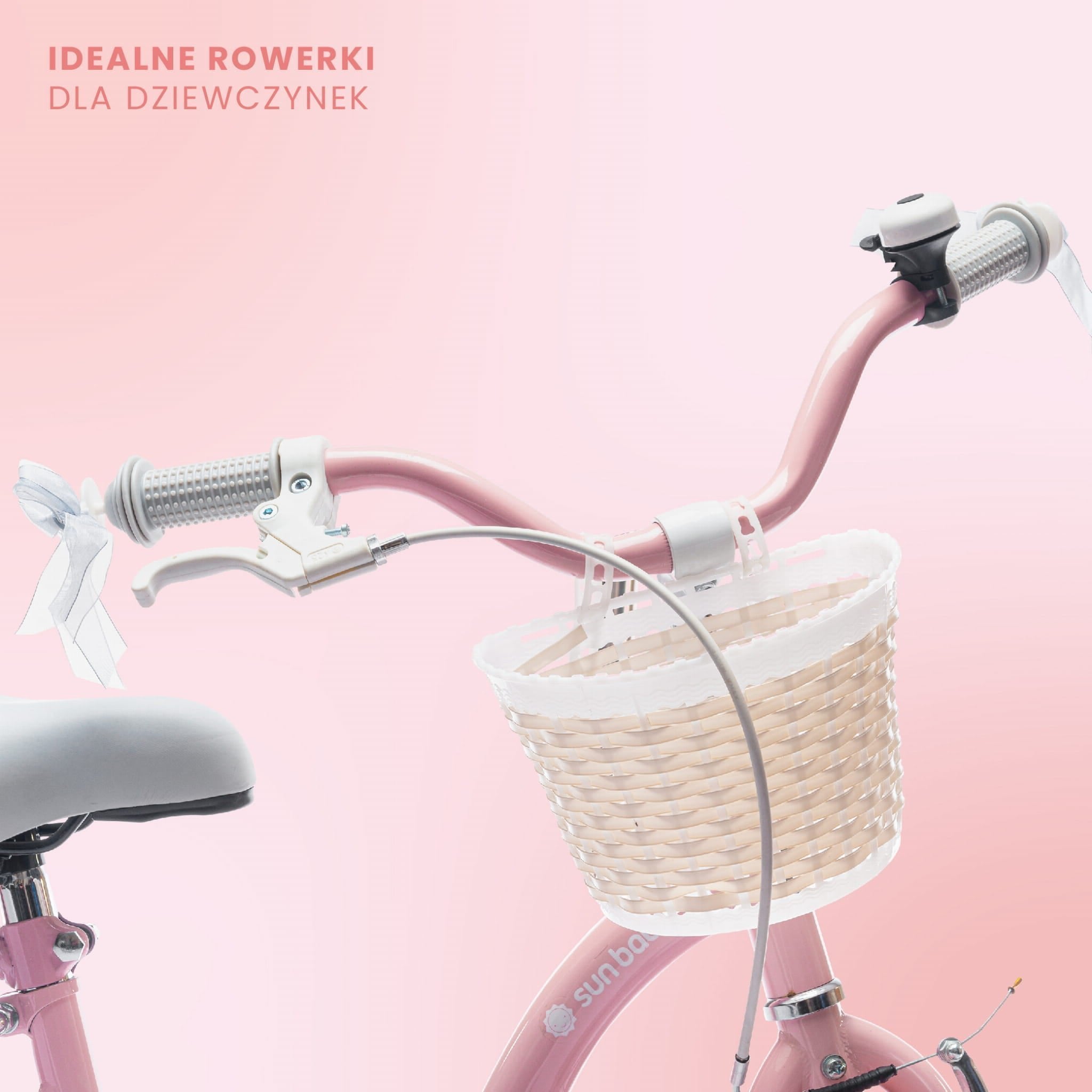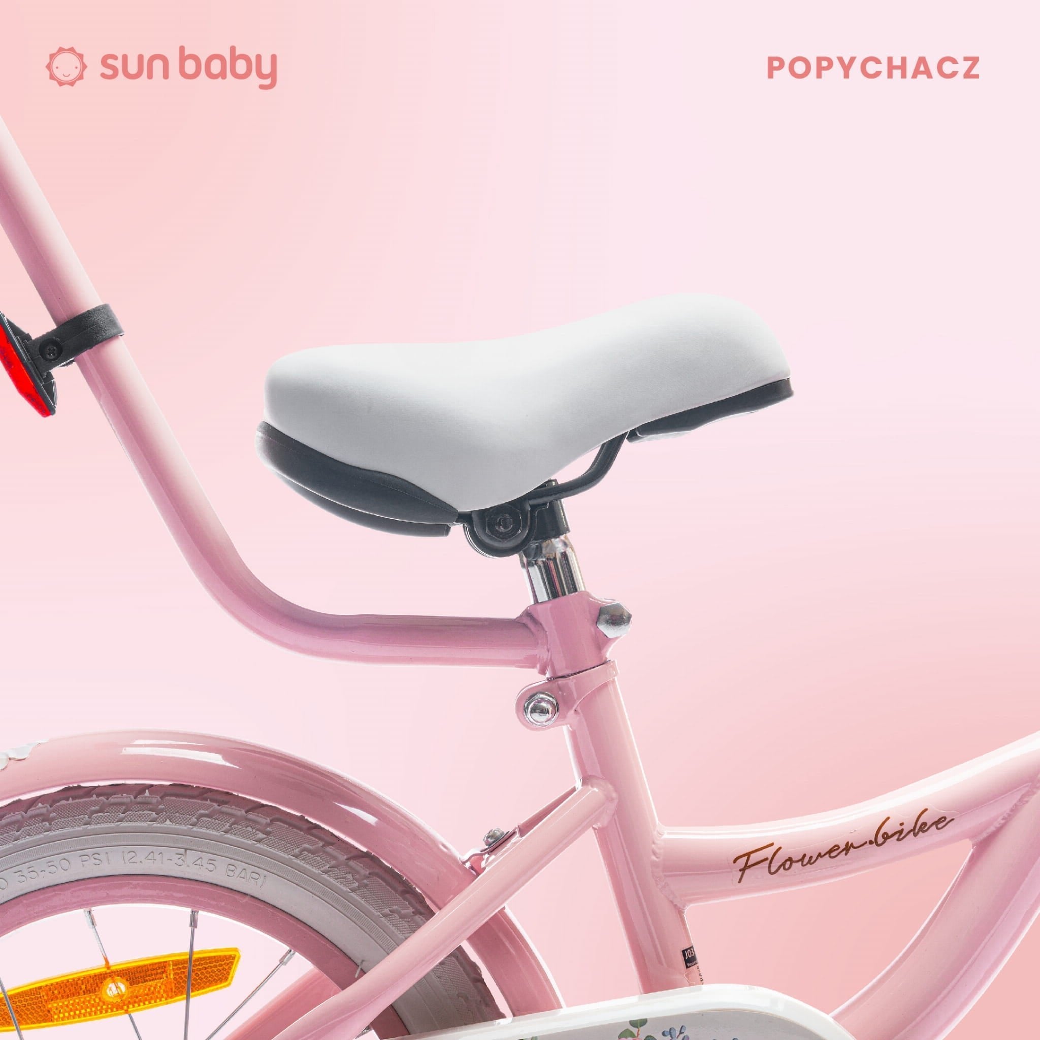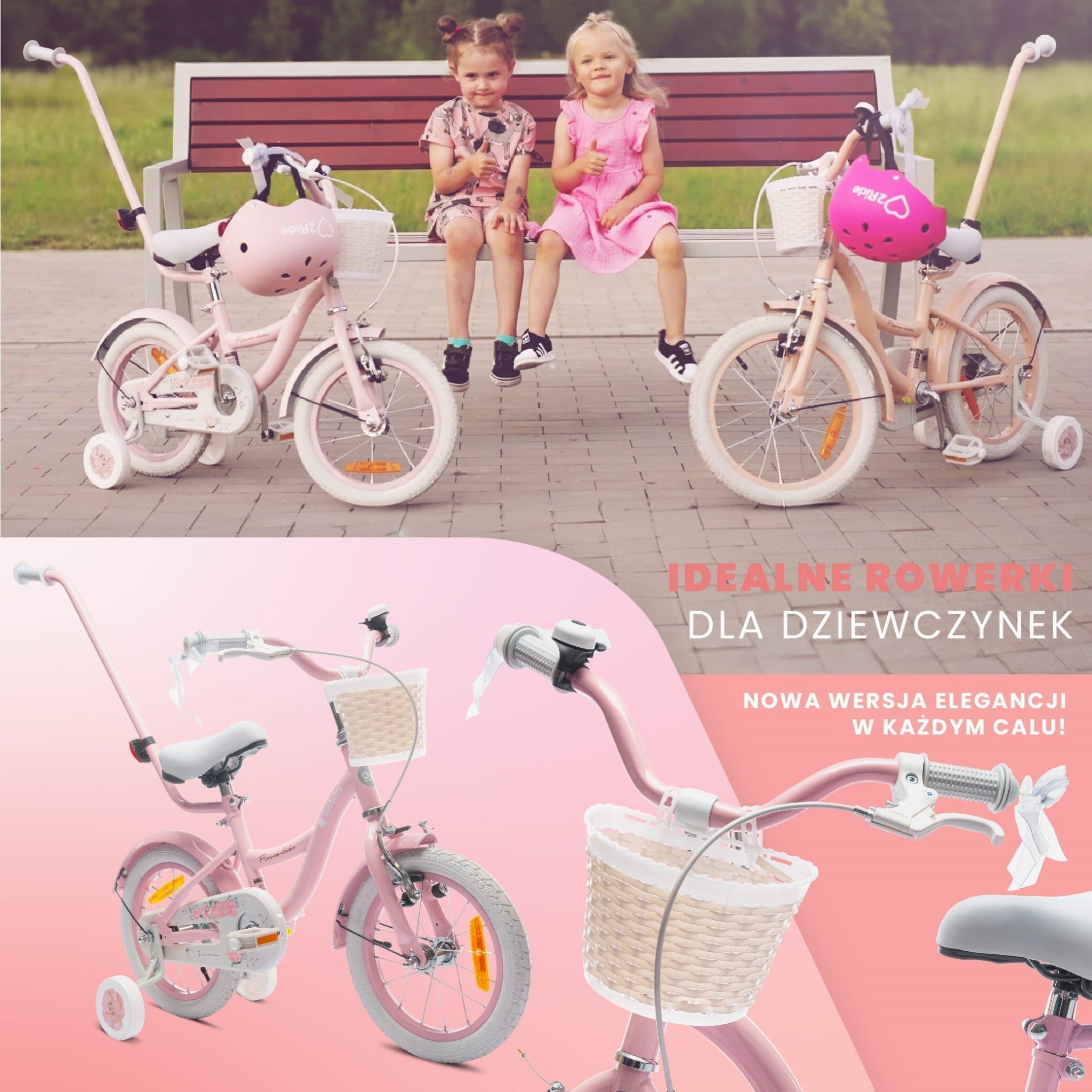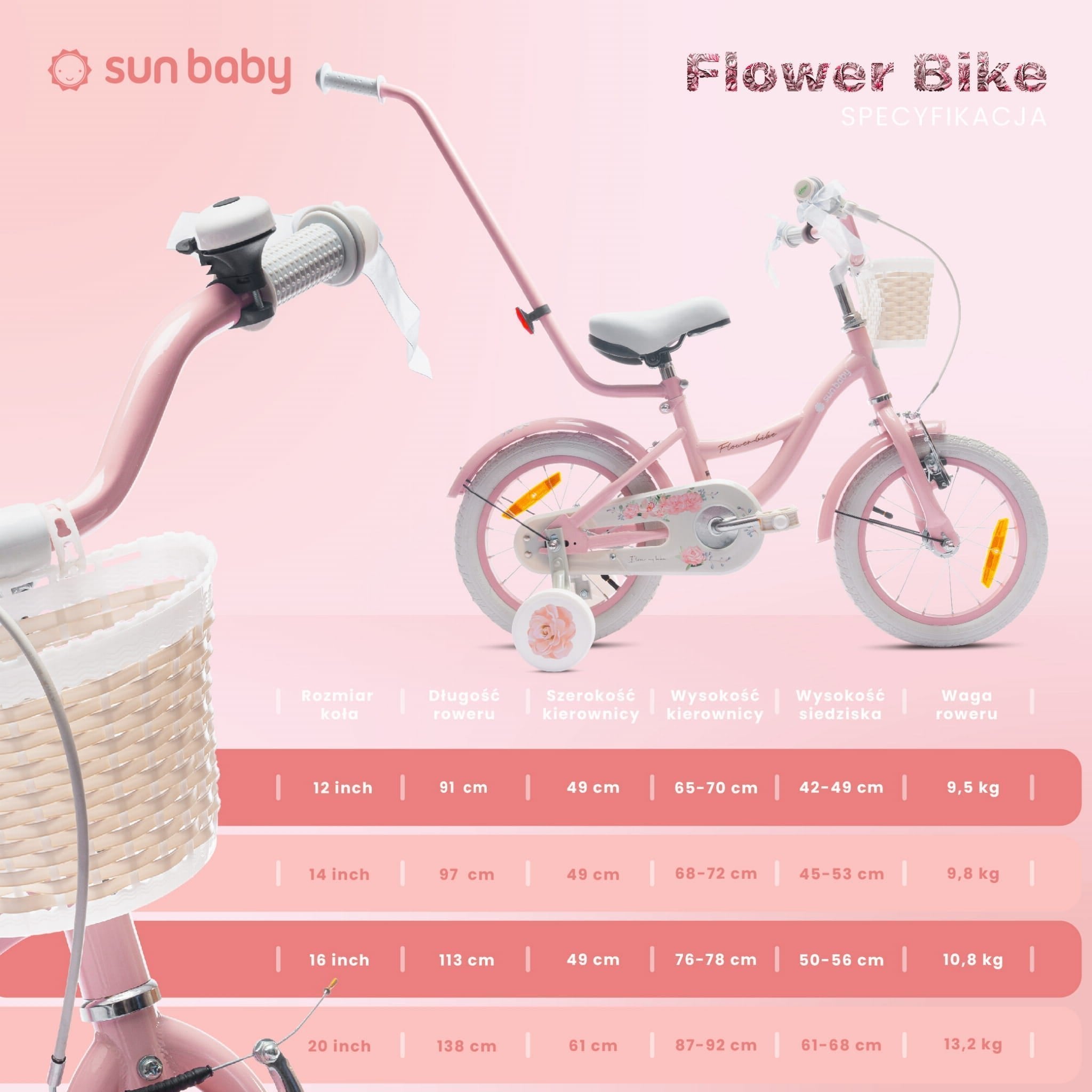 Flower Bike – a children's bike with training wheels, a push bar, metal fenders, a basket, and a bell. Equipped with a large chain guard, a front V-brake, and reflectors.
