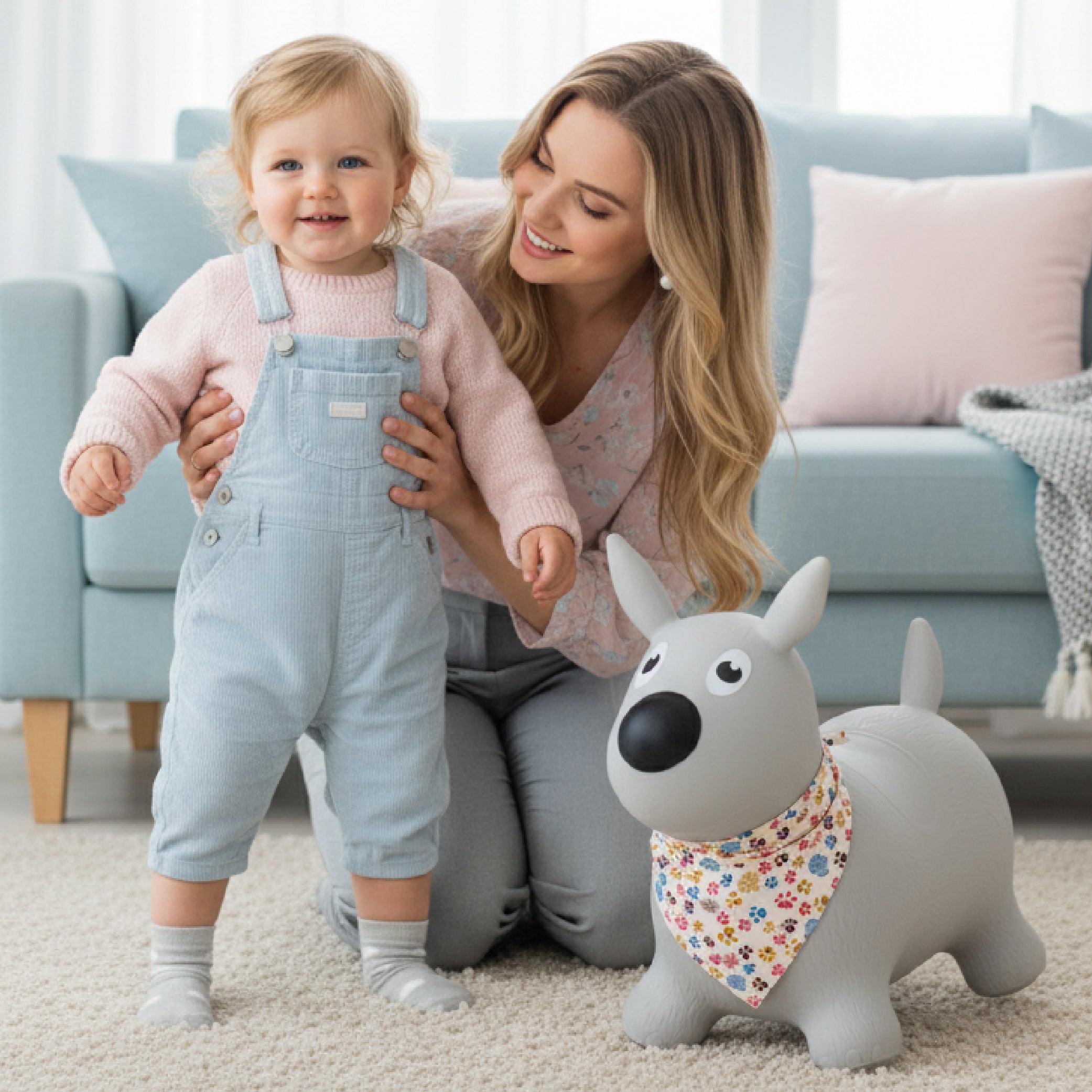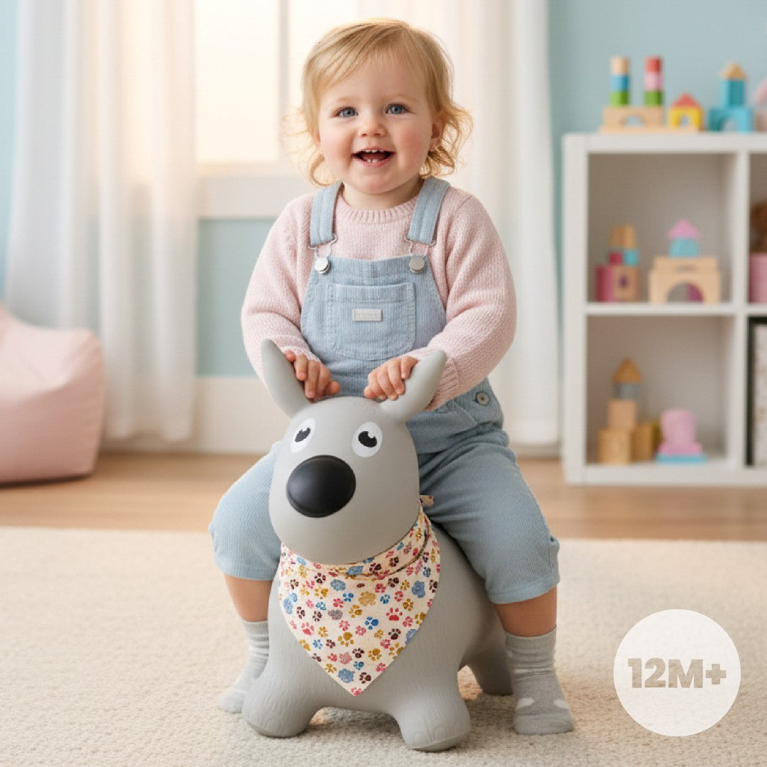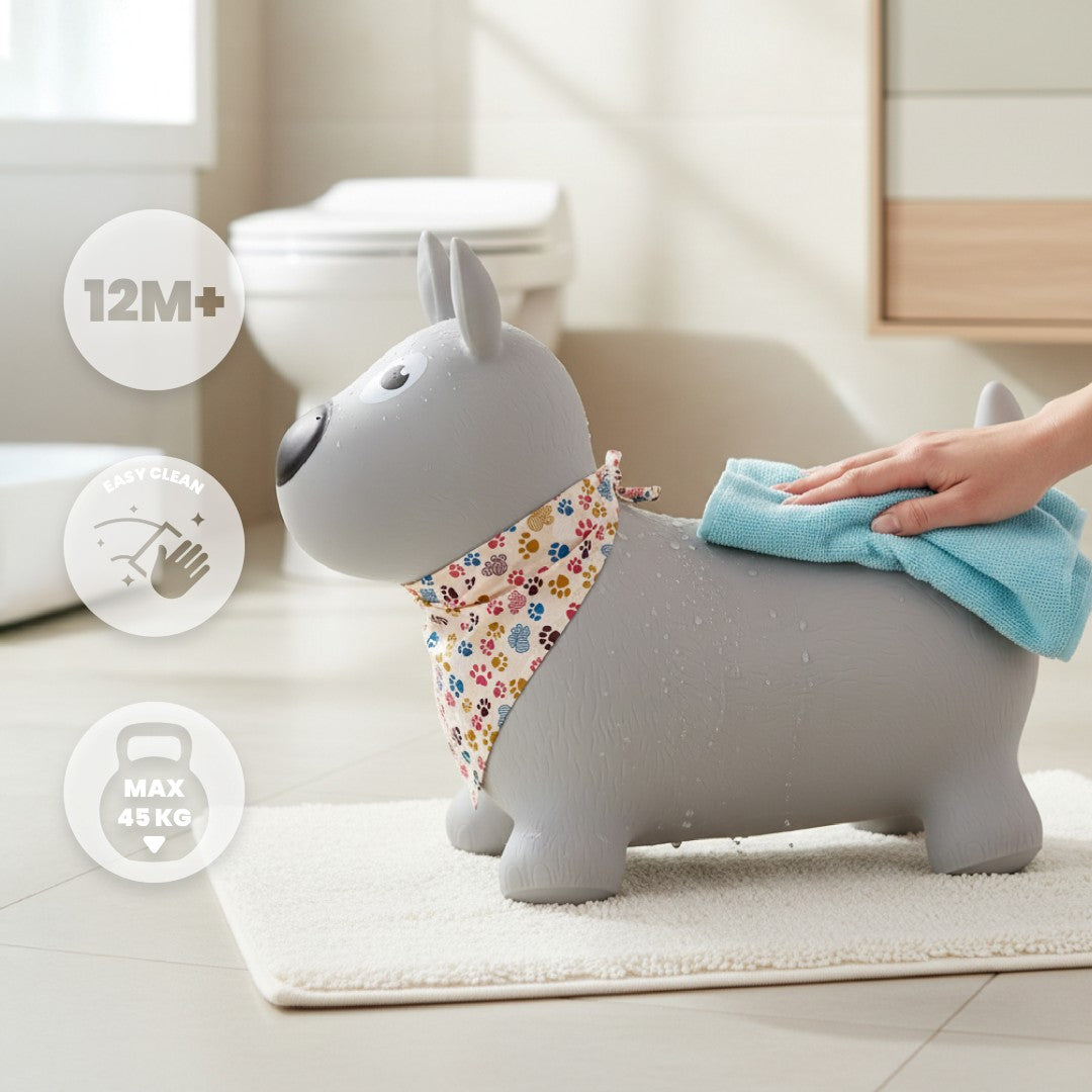 The bouncer is made of non-toxic rubber that meets European safety standards. Its ergonomic profile ensures a stable and safe ride for children, while the material ensures durability and resistance to intense play.