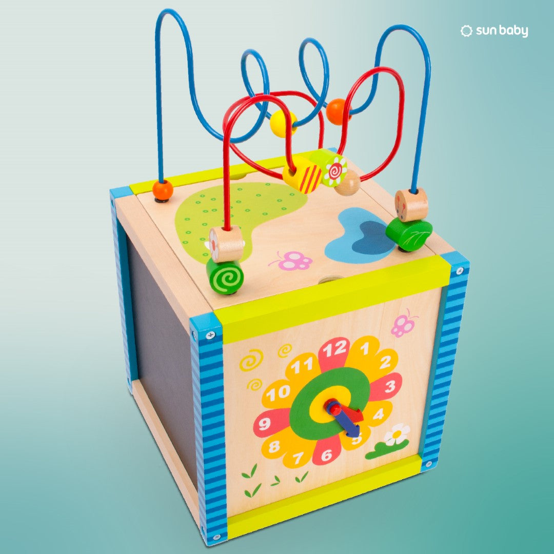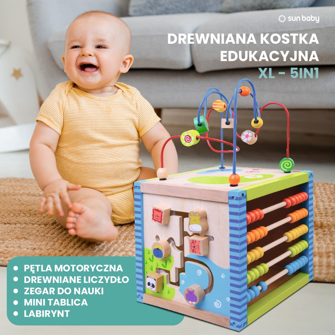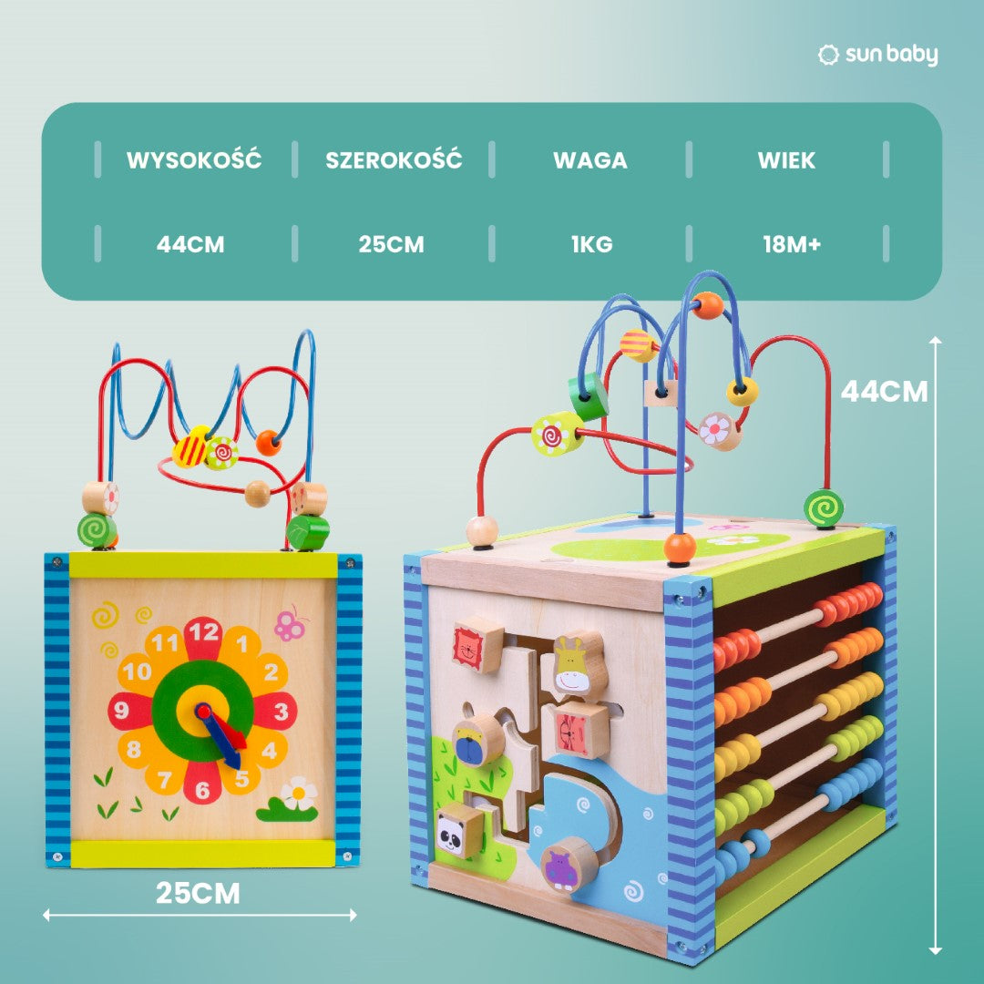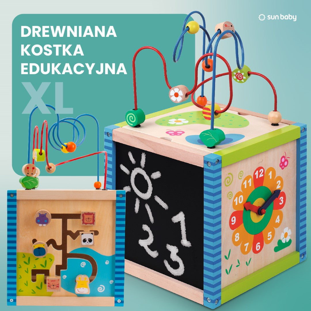 Sun Baby Drewniana kostka edukacyjna manipulacyjna XL – sorter, przeplatanka, liczydło