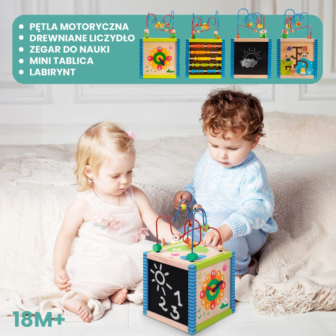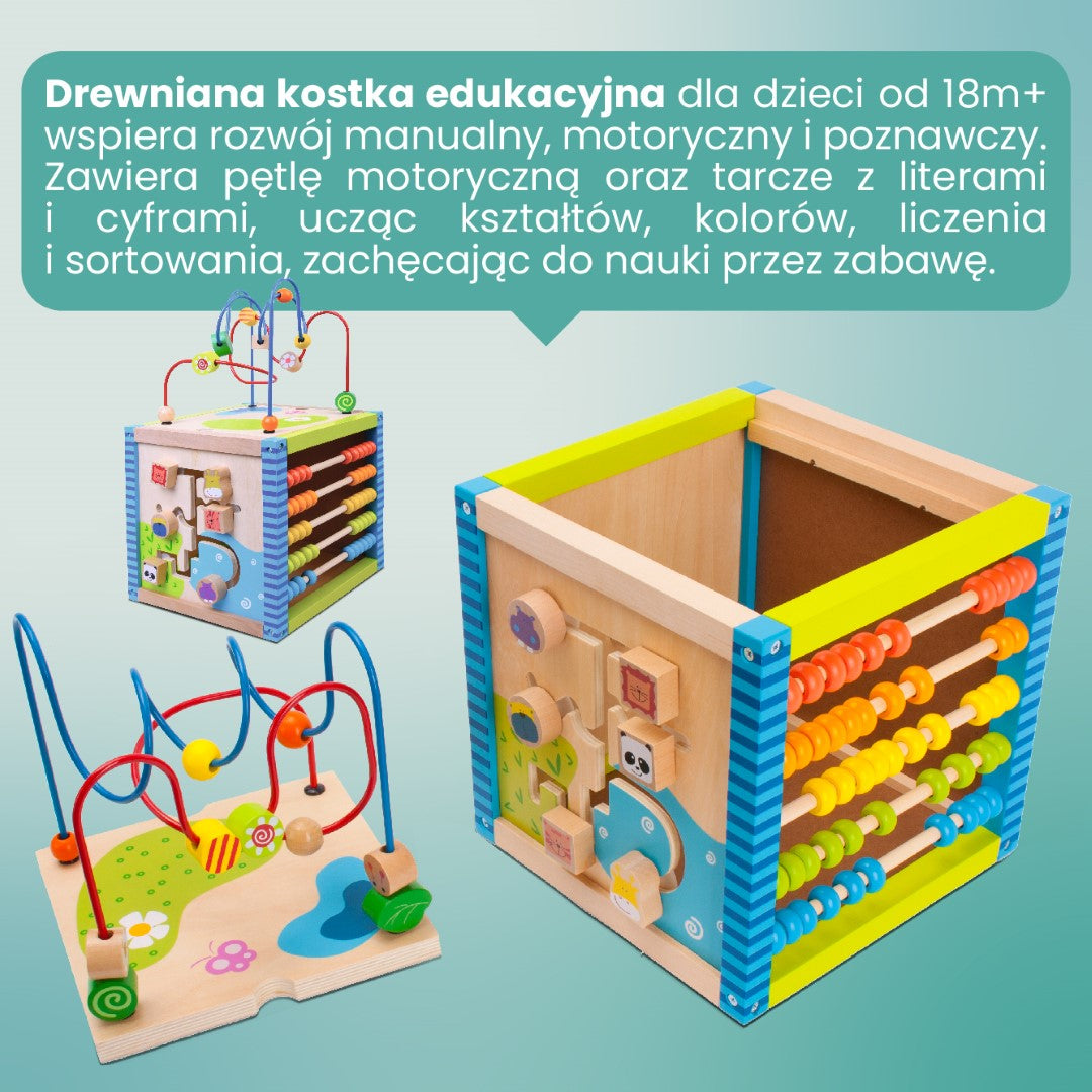 Kostka edukacyjna to zestaw różnorodnych aktywności, które uczą poprzez zabawę. Dziecko może przesuwać koraliki po metalowej pętli, dopasowywać klocki w sorterze, korzystać z liczydła czy uczyć się odczytywania godzin na kolorowym zegarze.