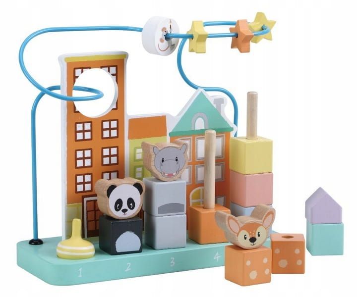 Każdy element jest precyzyjnie wykonany z solidnego drewna i pomalowany nietoksycznymi farbami, co zapewnia bezpieczeństwo małych użytkowników. Labirynt stanowi niepowtarzalną trasę, którą dzieci muszą pokonać, przenosząc kolorowe klocki przez różne zakręty i przejścia.
