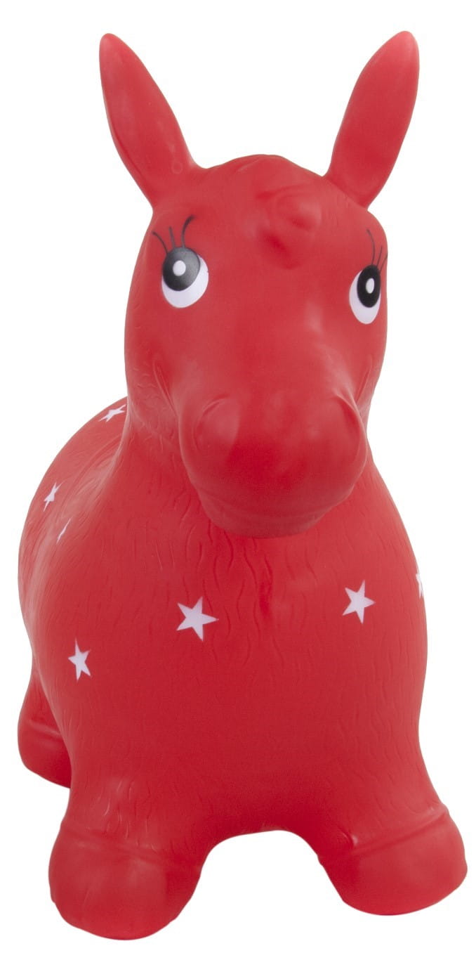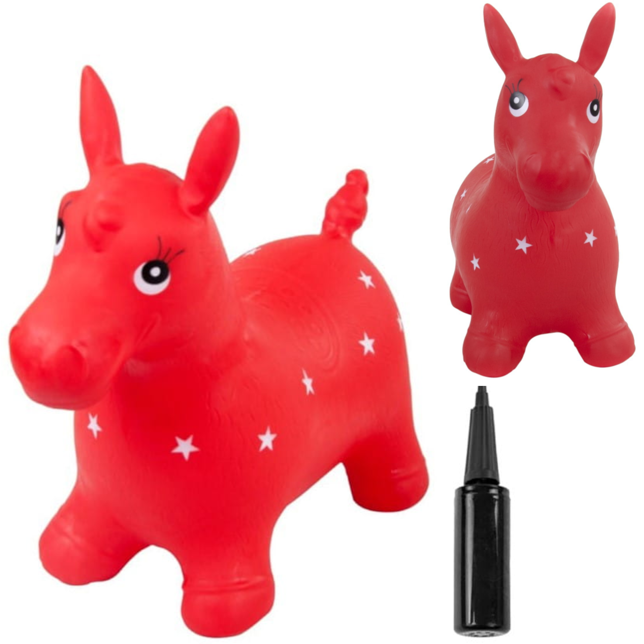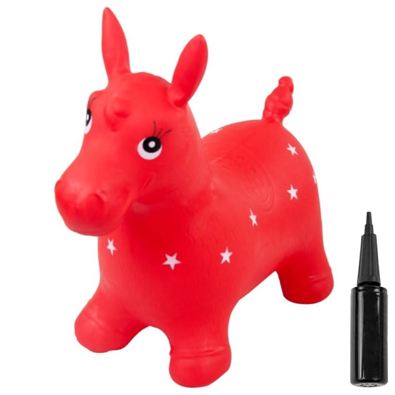 Duży gumowy skoczek dla dzieci Konik czerwony w białe gwiazdki do skakania z pompką, zabawka do skakania