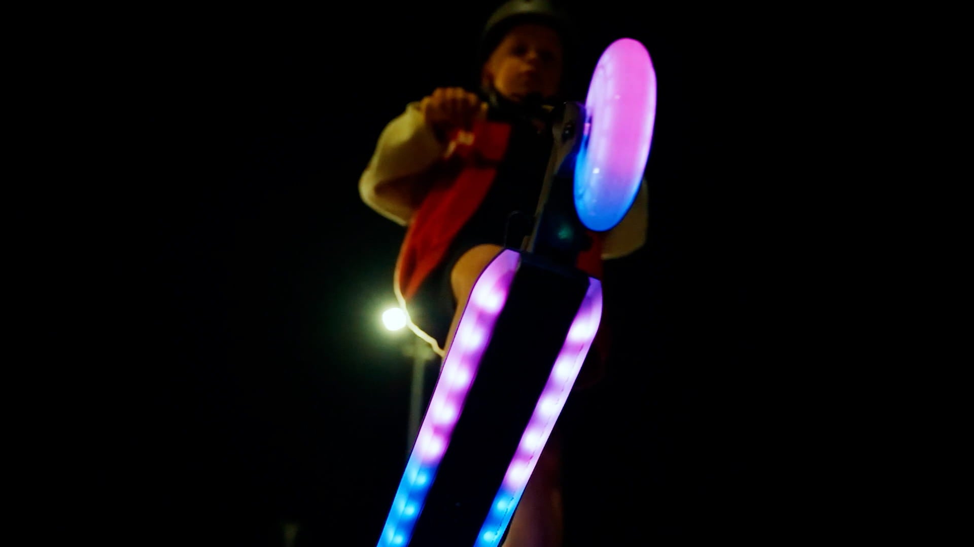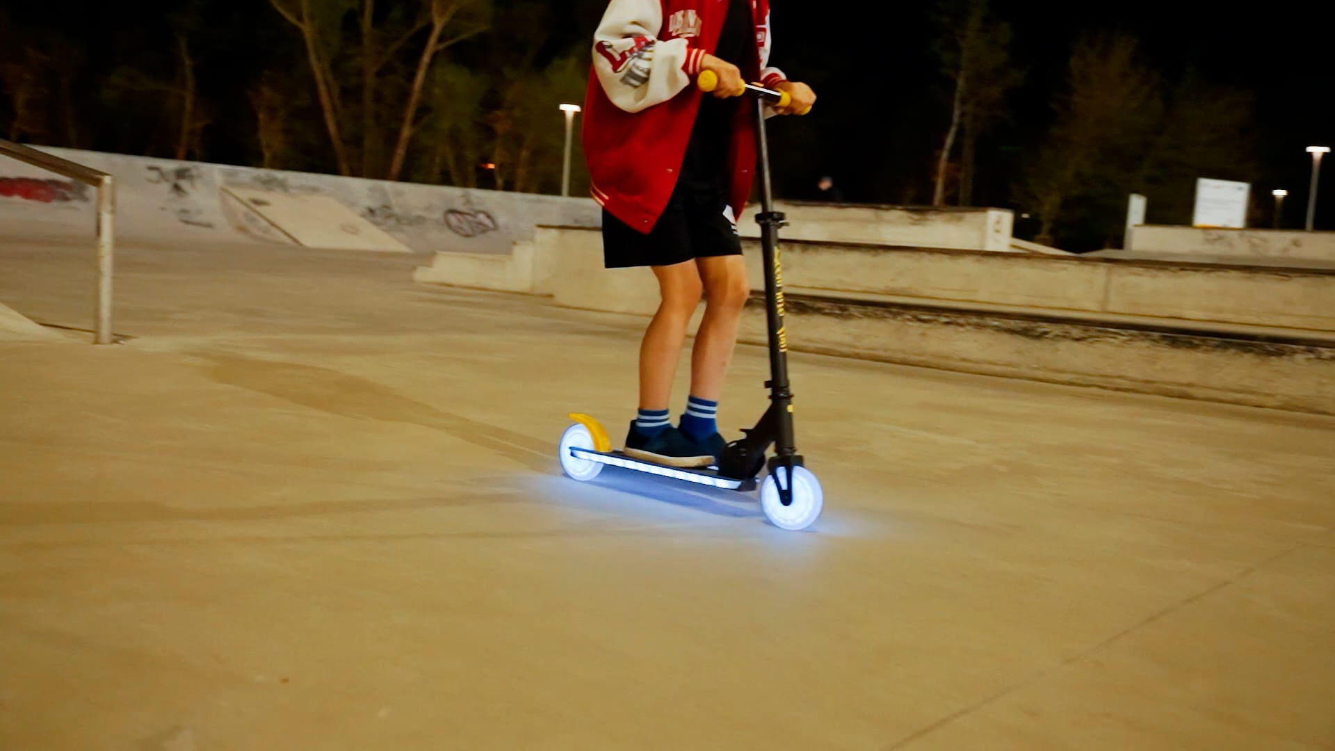 Hulajnoga została wyposażona w nowoczesny system sterowania oświetleniem LED, który działa w prosty i intuicyjny sposób. Aby włączyć światła, wystarczy jedno kliknięcie przycisku umieszczonego na kierownicy. Jeśli chcesz je wyłączyć, wystarczy przytrzymać przycisk przez kilka sekund.