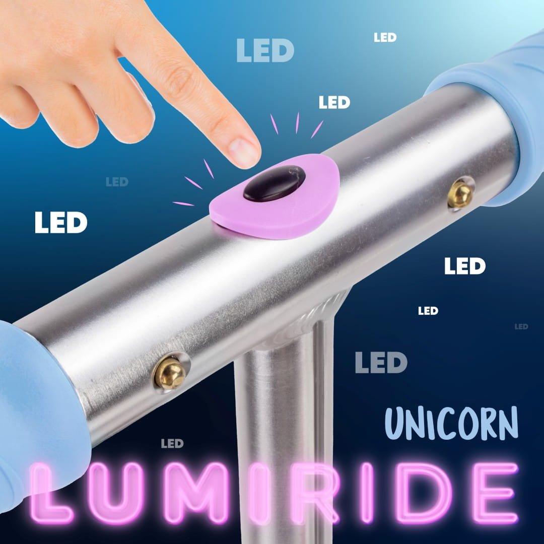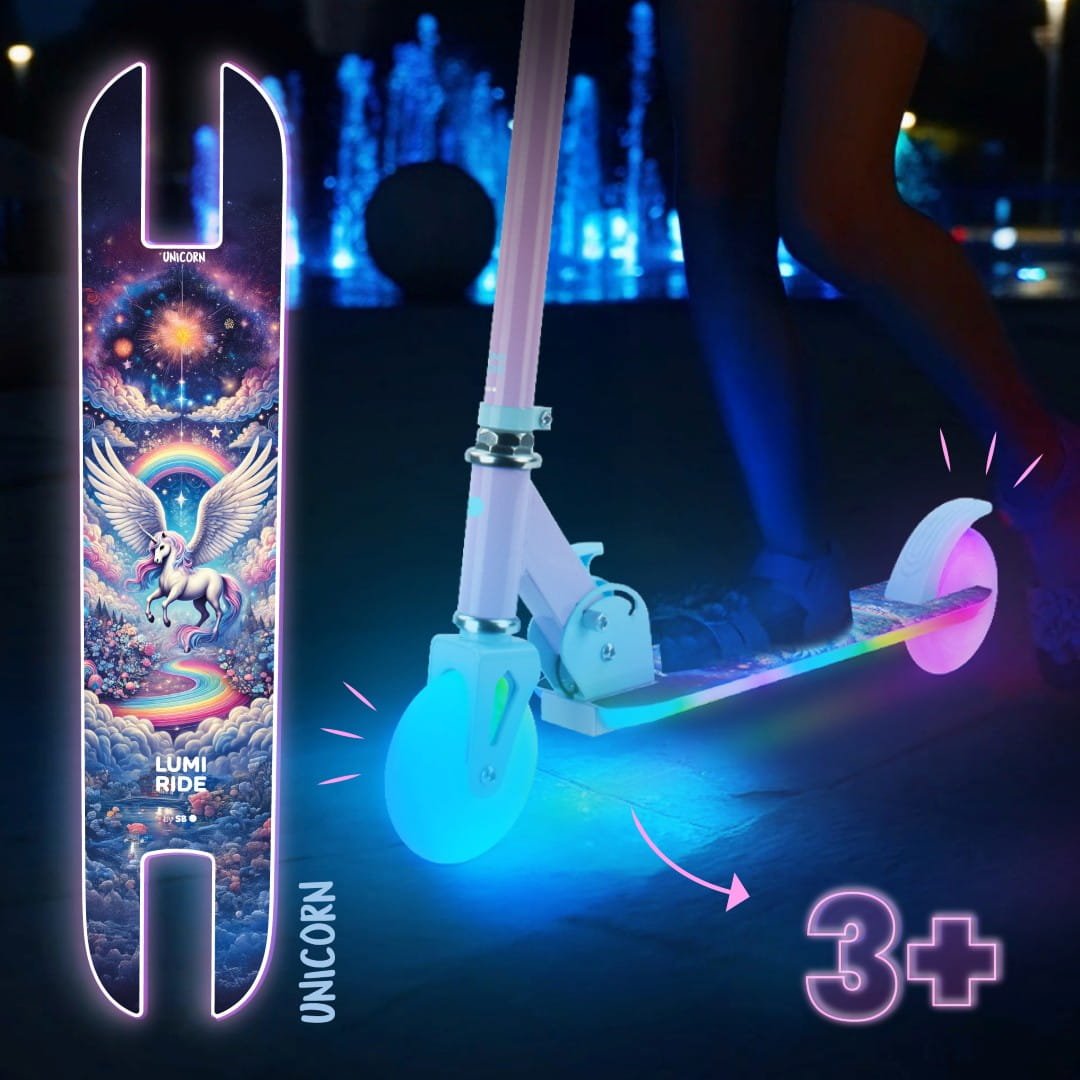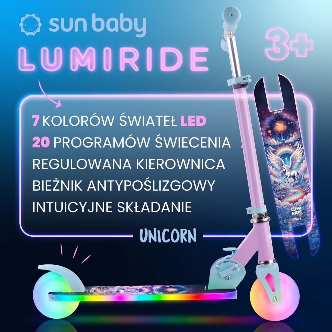 LUMI RIDE Hulajnoga dwukołowa dla dzieci składana regulowana LED 7 kolorów 20 programów Unicorn Sun Baby