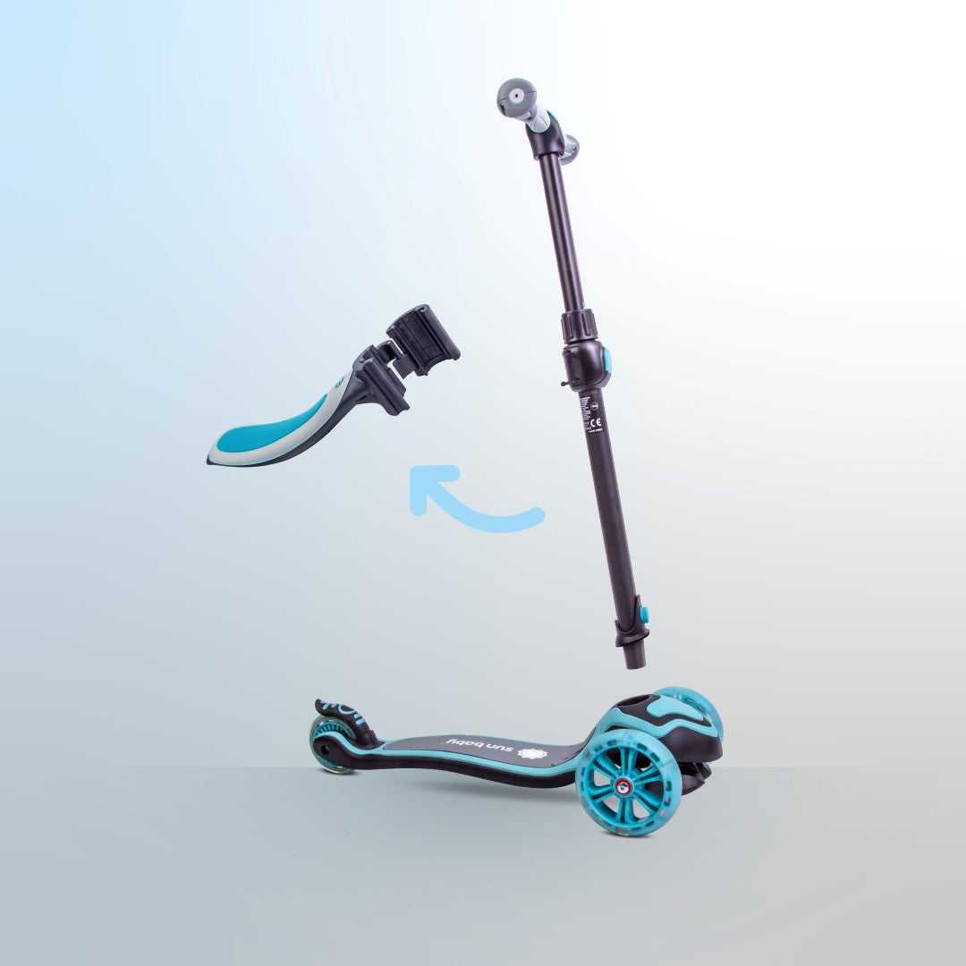 Jeśli twoje dziecko staje się coraz bardziej zaawansowane, hulajnoga może stać się deskorolką w jednym ruchu. Naciśnij guzik, odłącz kierownicę i ruszaj na deskorolce!