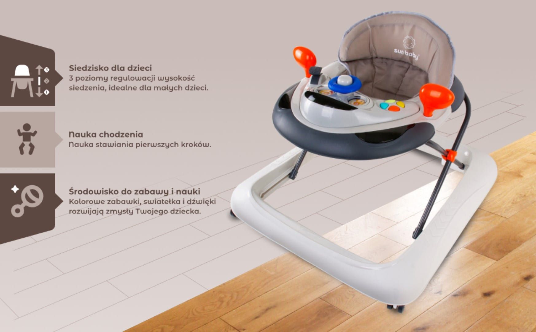 Sun Baby Chodzik dla dzieci interaktywny do nauki chodzenia regulacja wysokości kierownica stopery szary