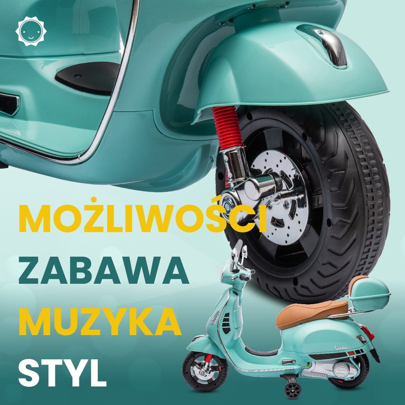 Sun Baby jeździk skuter Vespa turkusowy na akumulator z kuferkiem i MP3 dla dzieci 3–6 lat