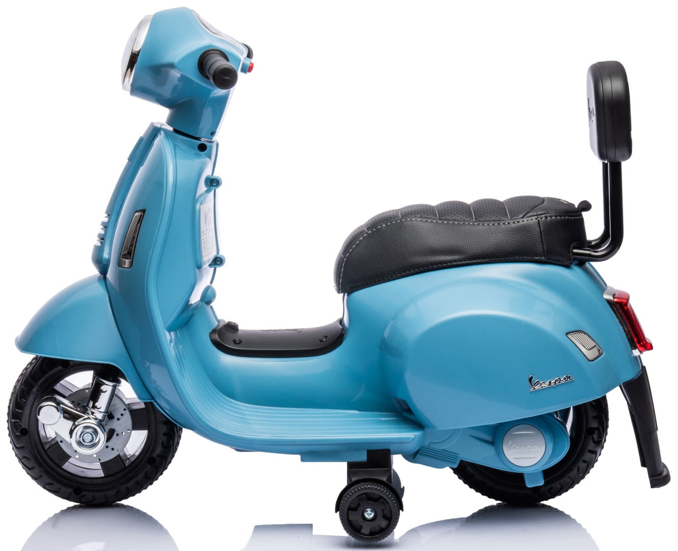 Jeździk dla dziecka skuter Vespa niebieski na akumulator z oparciem – pojazd elektryczny 18m+