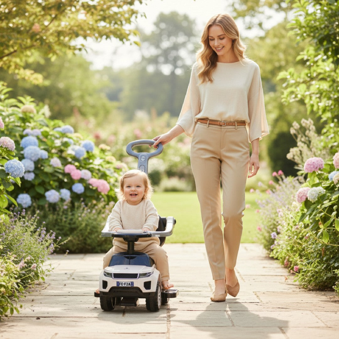 Jeździk może służyć na wielu etapach rozwoju dziecka. Na początku można używać jeździka z podnóżkiem, obejmą oraz pchaczem. Gdy dziecko podrośnie, możemy sukcesywnie demontować takie elementy jak podnóżek, obejmę oraz rączką do pchania. Dzięki temu dziecko będzie samo w stanie używać zabawki.
