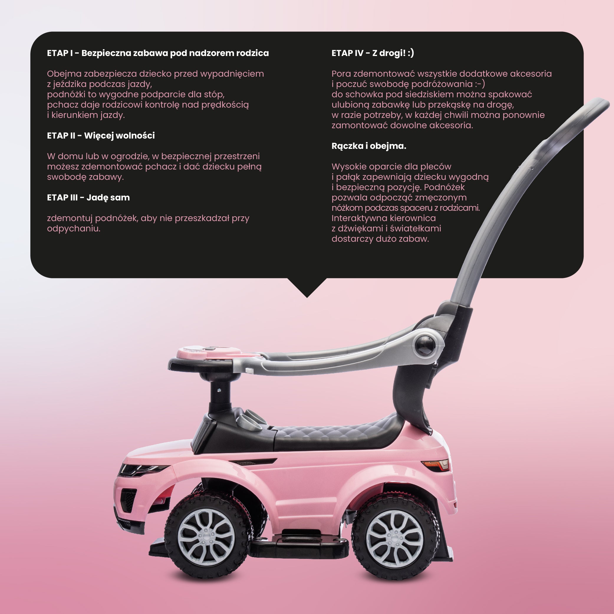 ✔️ pałąk bezpieczeństwa, pchacz oraz podnóżek można zdemontować