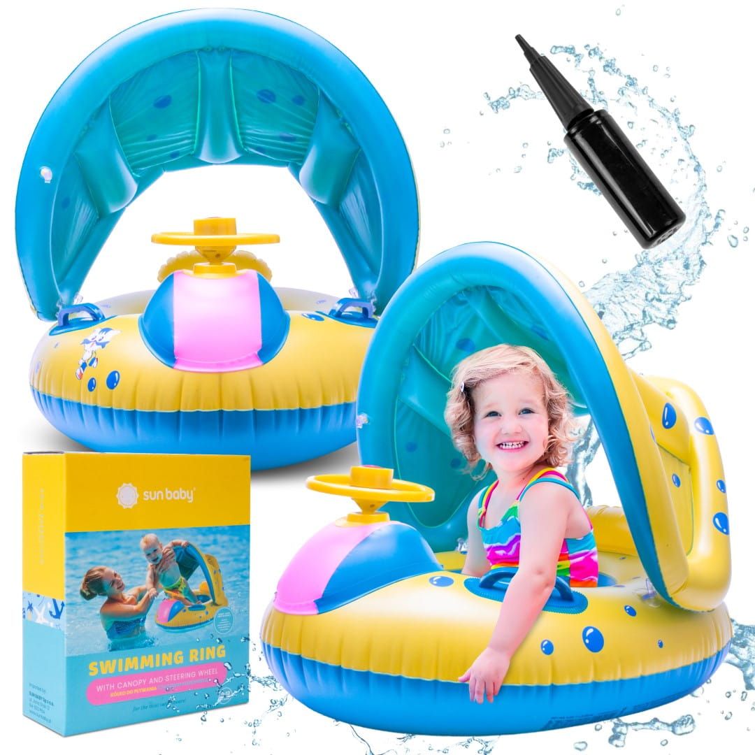 Sun Baby Koło do pływania Materac dmuchany Pontonik dla dzieci z daszkiem z kierownicą Pompka ręczna