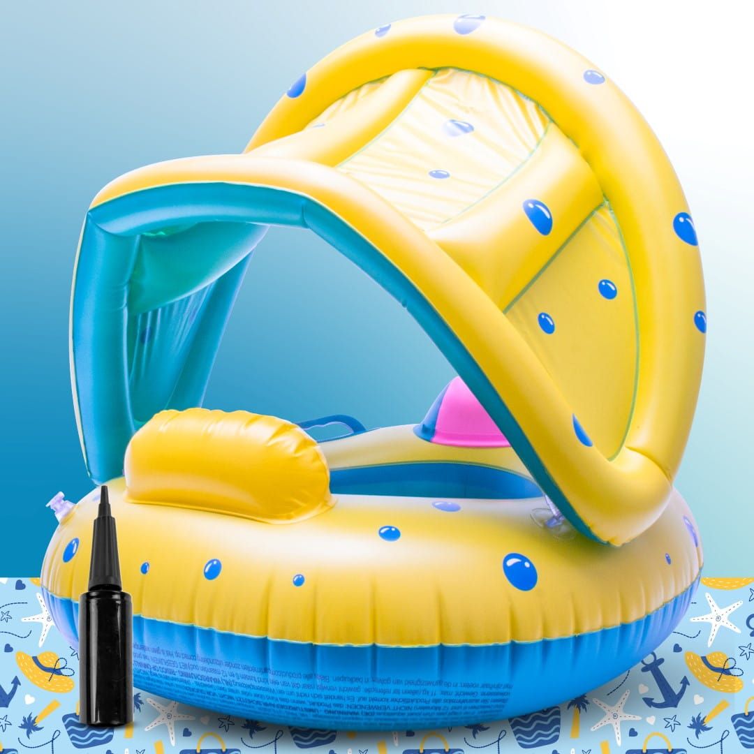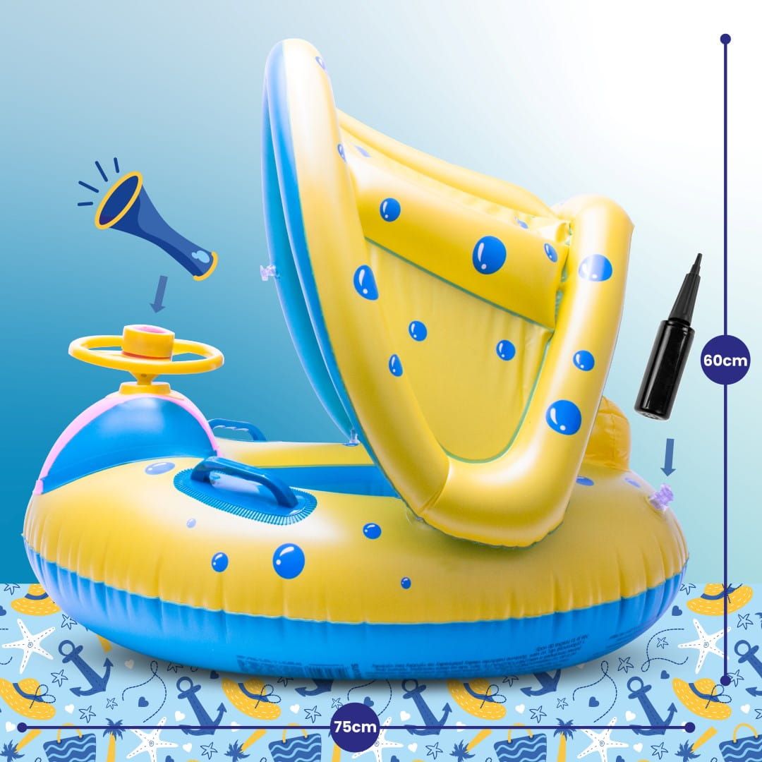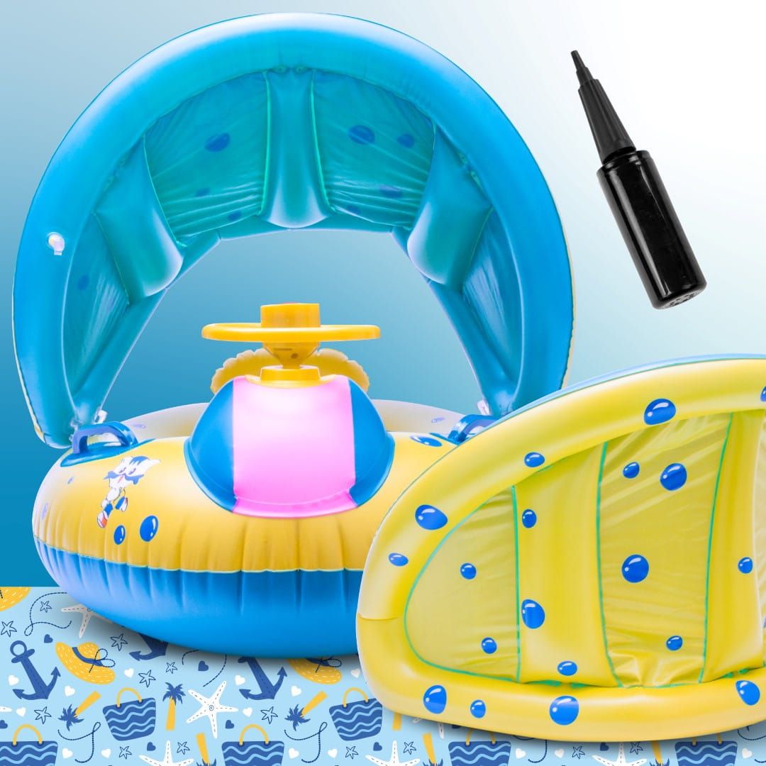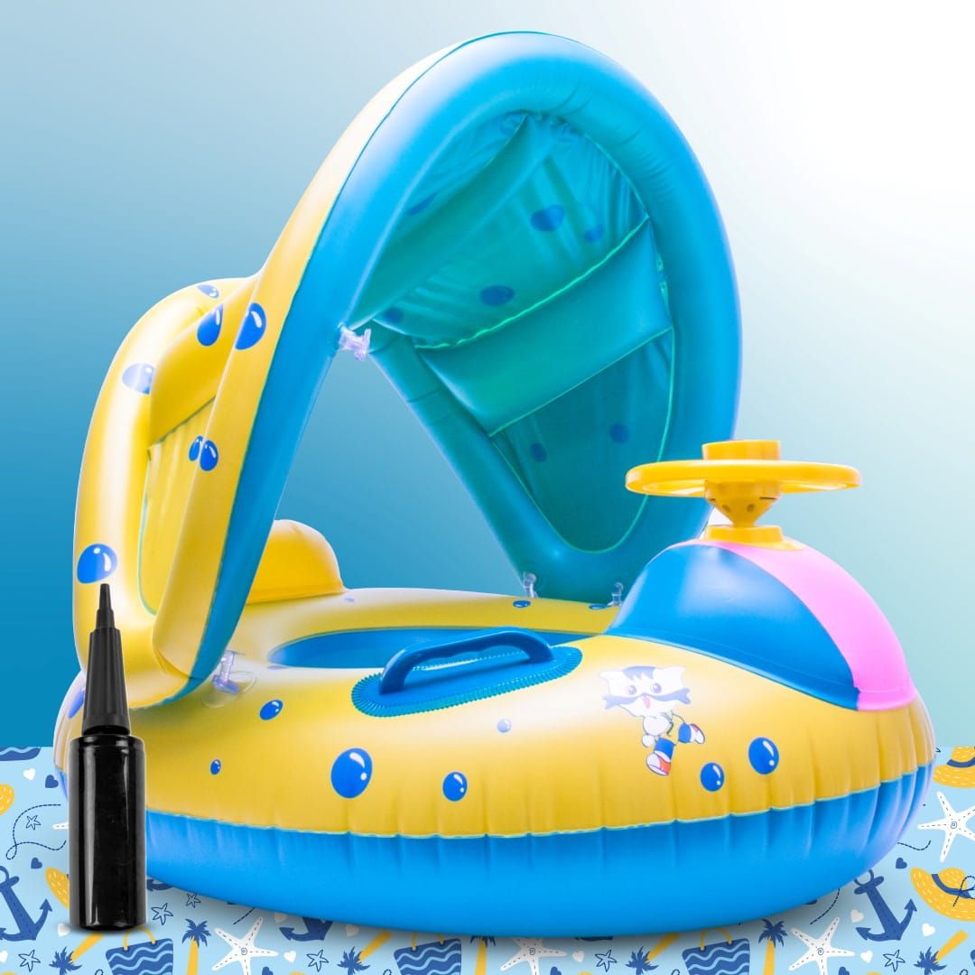 Czy Twoje dziecko kocha wodę? Jeżeli tak to mamy dla Ciebie idealne rozwiązanie na ciepłe, letnie dni – Koło do pływania Materac dmuchany Pontonik dla dzieci z daszkiem i kierownicą!