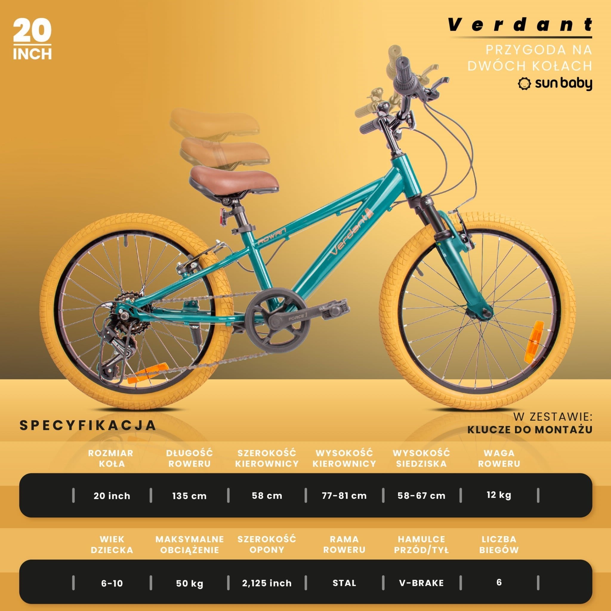 Sun Baby Rower dziecięcy 20 cali górski MTB Verdant Rowan – Shimano 6 biegów, amortyzator, hamulce V-brake