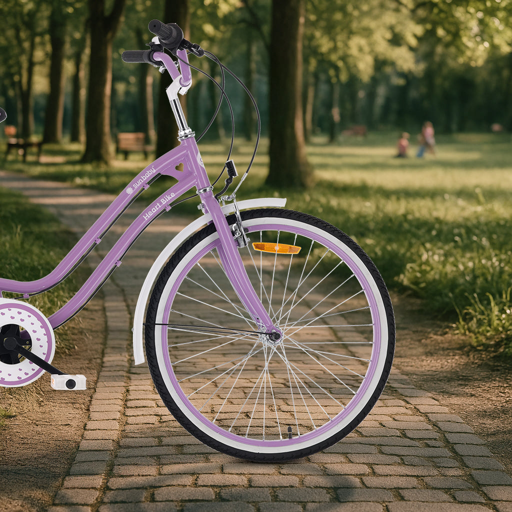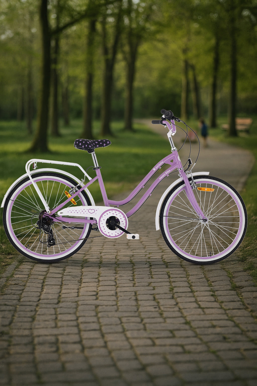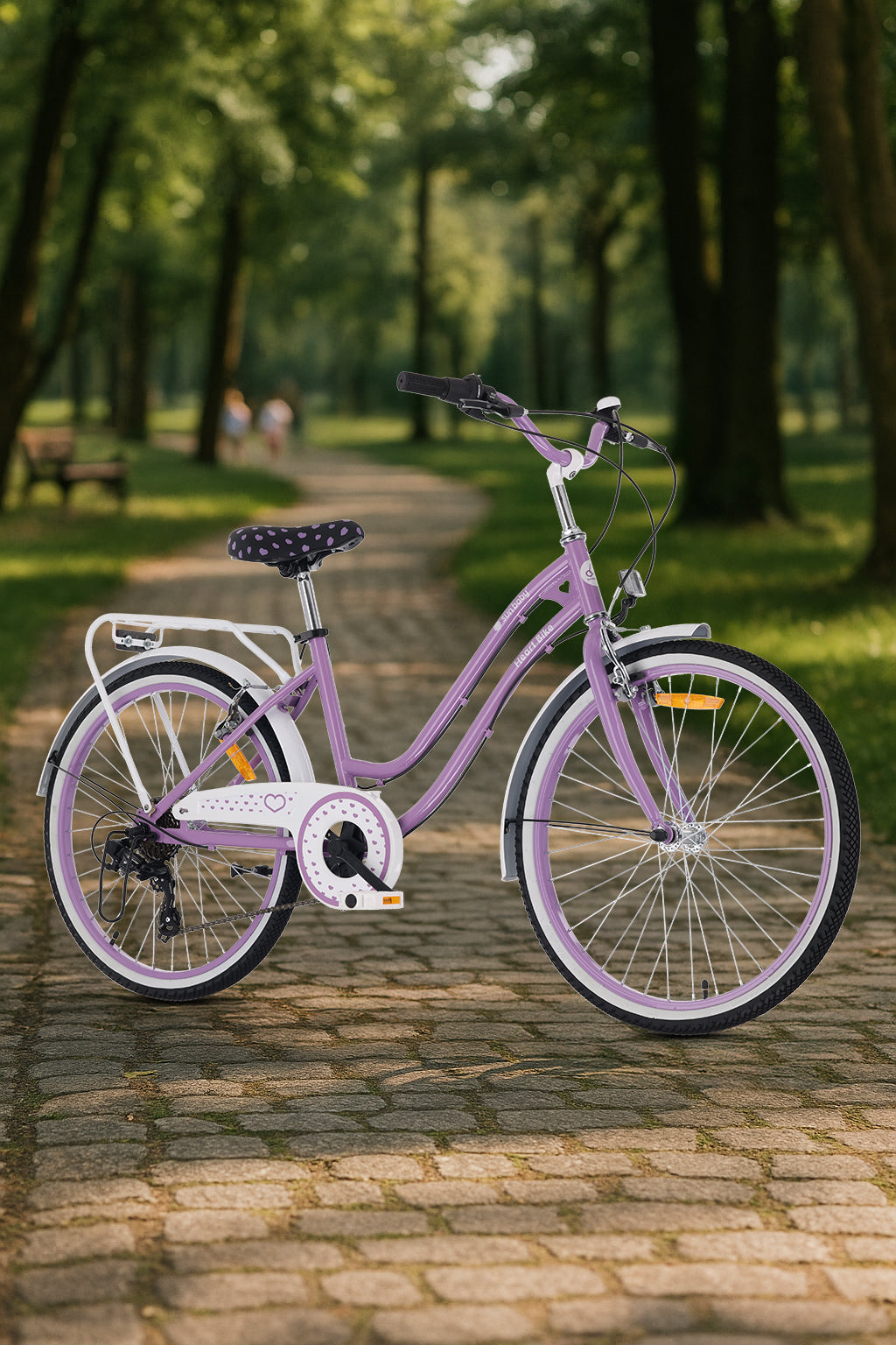 Rower młodzieżowy 24 cale dla dziewczynki miejski na komunię Shimano 7 biegów Heart Bike fioletowy