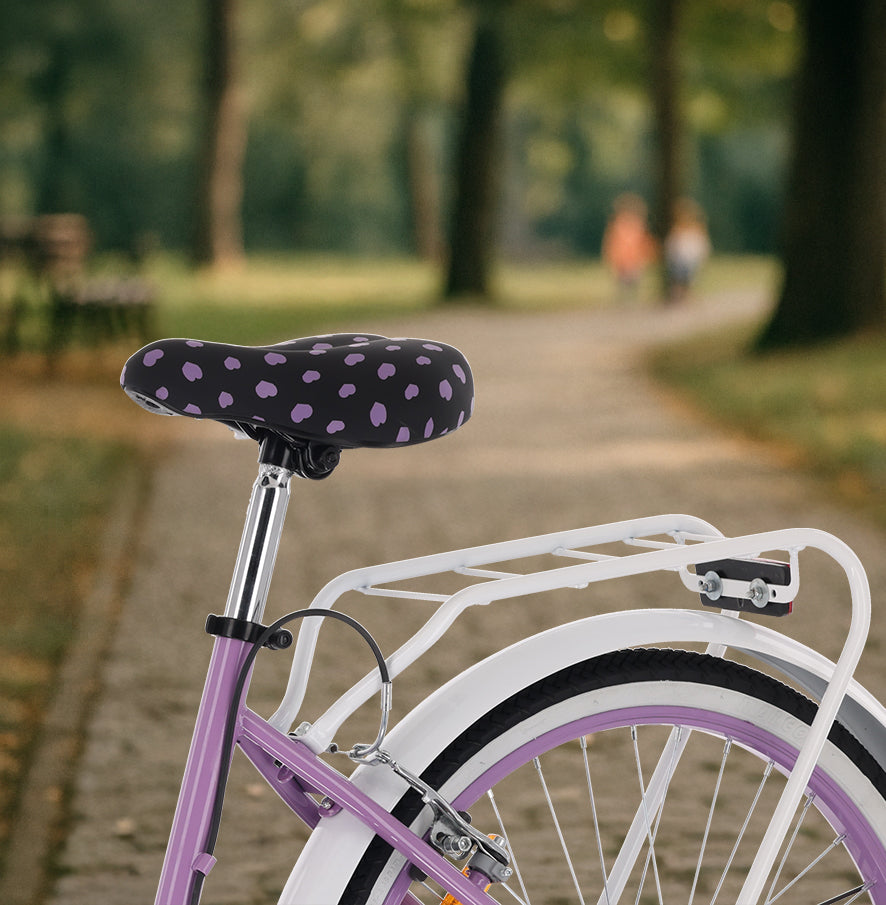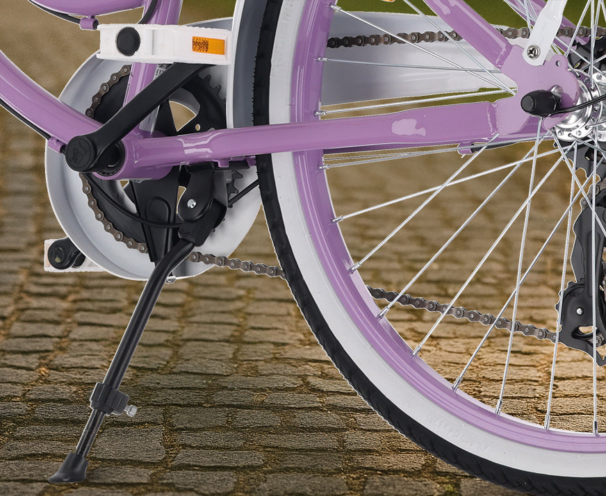 - W zestawie: błotniki, osłona łańcucha, odblaski, dzwonek, bagażnik, stopka boczna, przerzutka Shimano