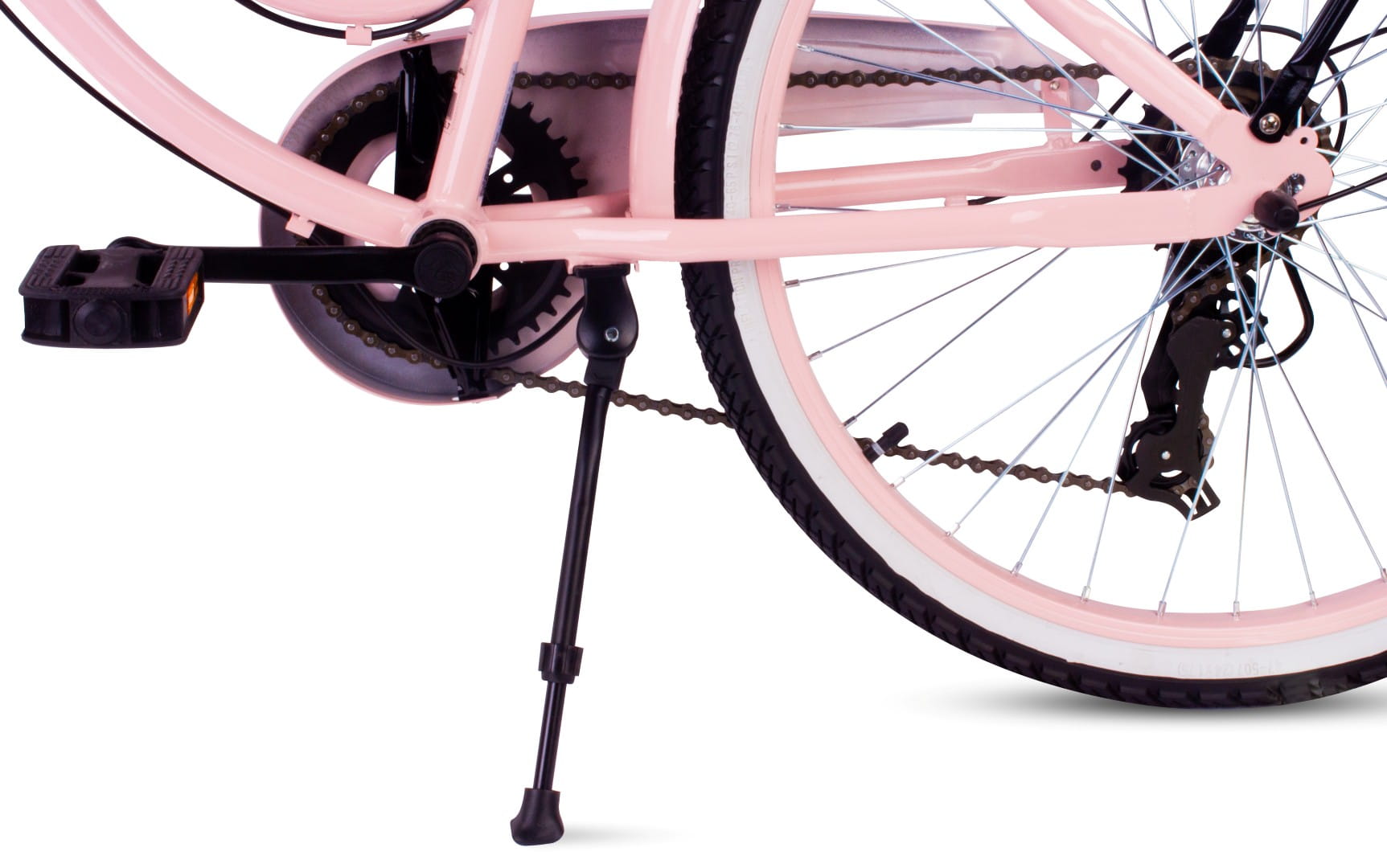 - W zestawie: hamulce V-brake, błotniki, osłona łańcucha, odblaski, dzwonek, bagażnik, stopka boczna, przerzutka Shimano