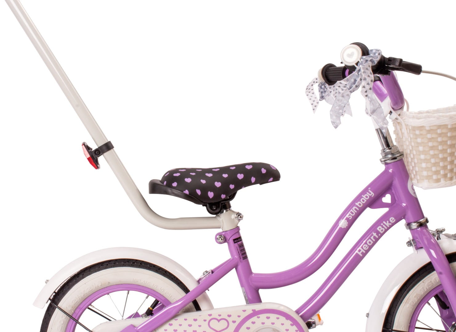 Sun Baby Rowerek dziecięcy 12 cali Heart Bike fioletowy z koszykiem, pchaczem i kółkami bocznymi