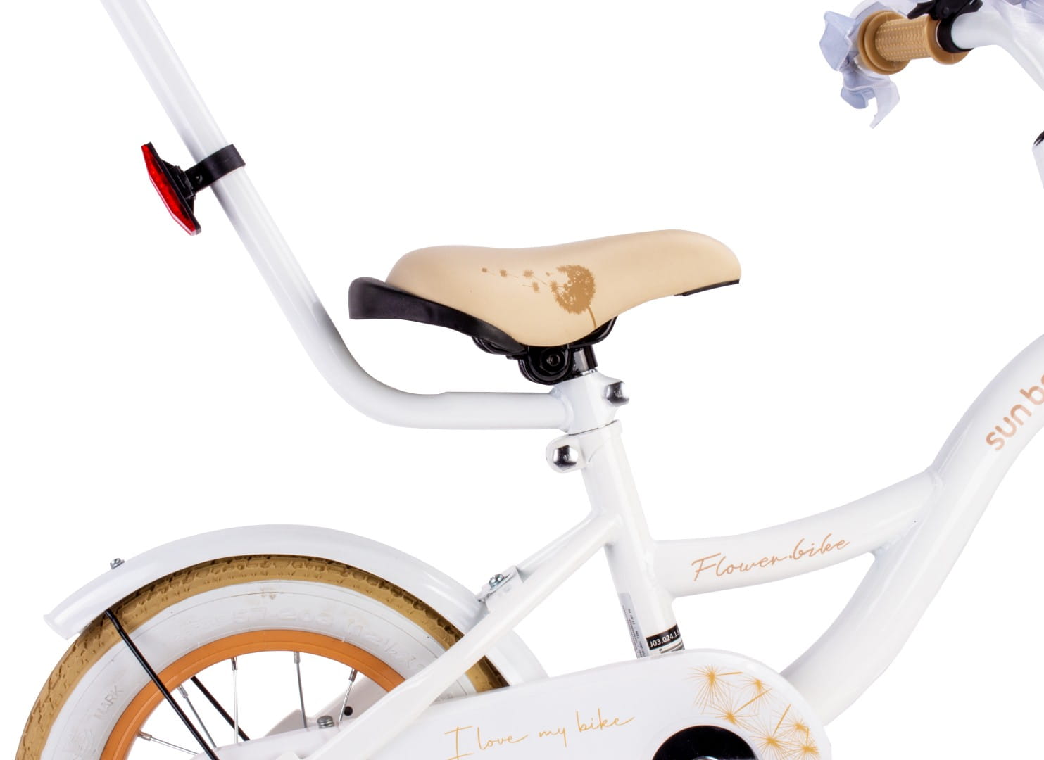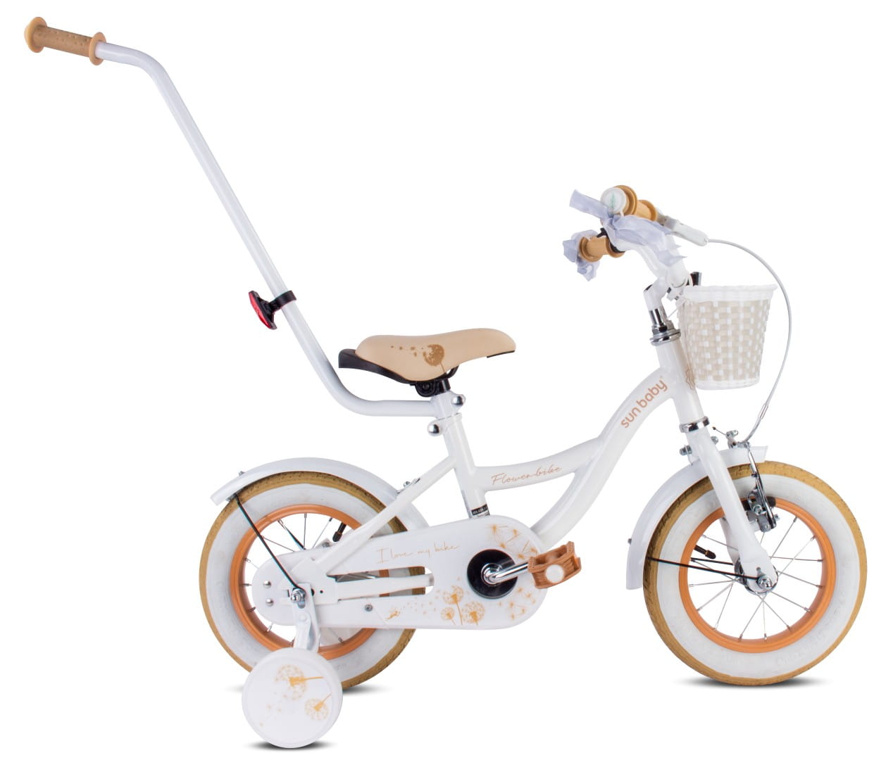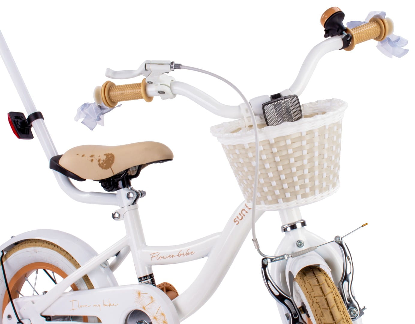 Sun Baby Rowerek dziecięcy 12 cali Flower Bike Dmuchawiec biało-beżowy z koszykiem, pchaczem i kółkami bocznymi