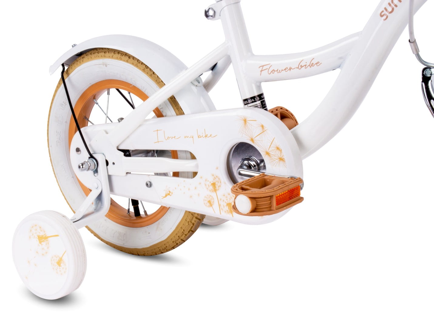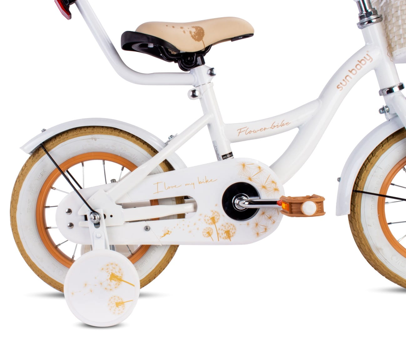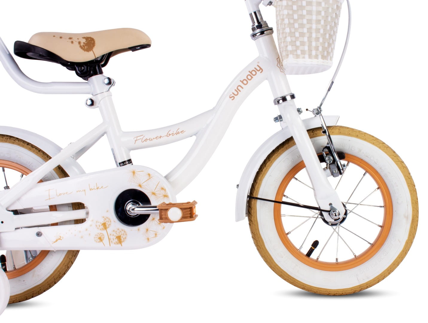 Sun Baby Rowerek dziecięcy 12 cali Flower Bike Dmuchawiec biało-beżowy z koszykiem, pchaczem i kółkami bocznymi