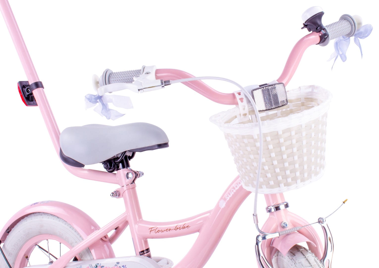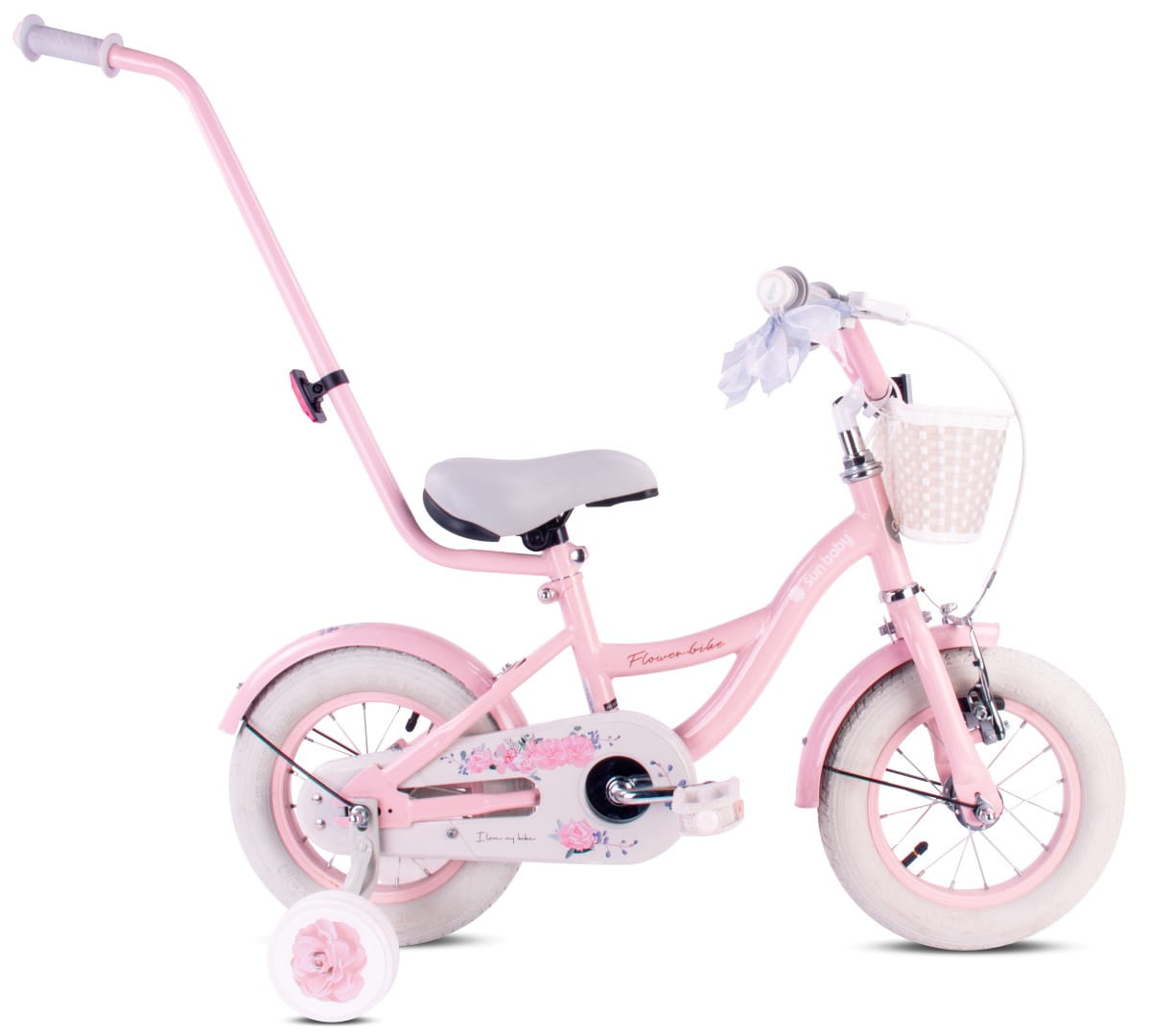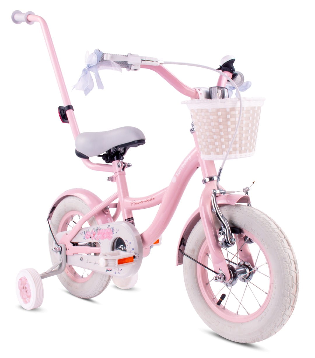 Sun Baby Rowerek dziecięcy 12 cali Flower Bike różowy z koszykiem, pchaczem i kółkami bocznymi