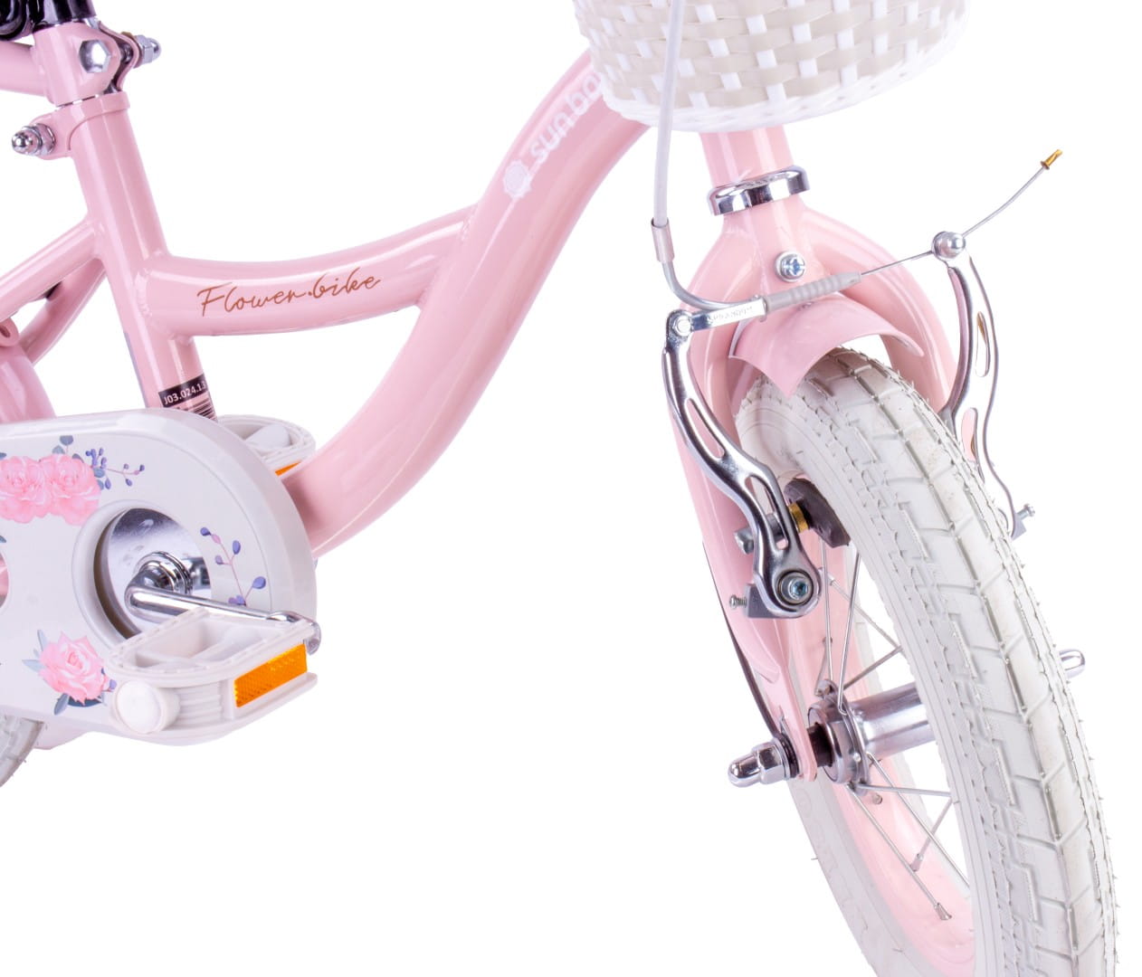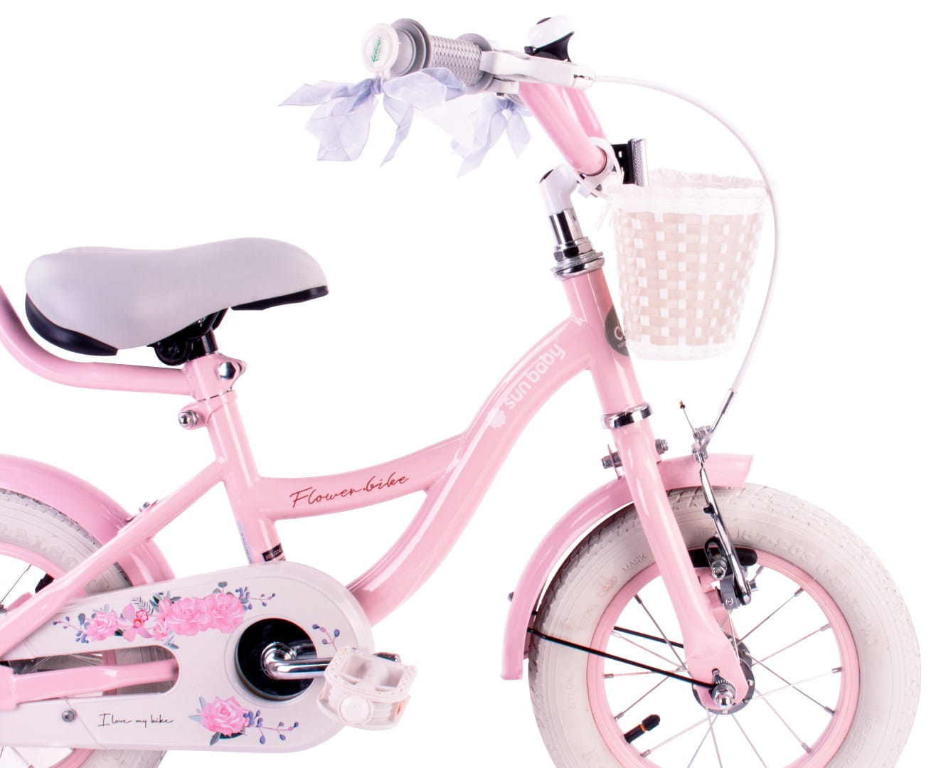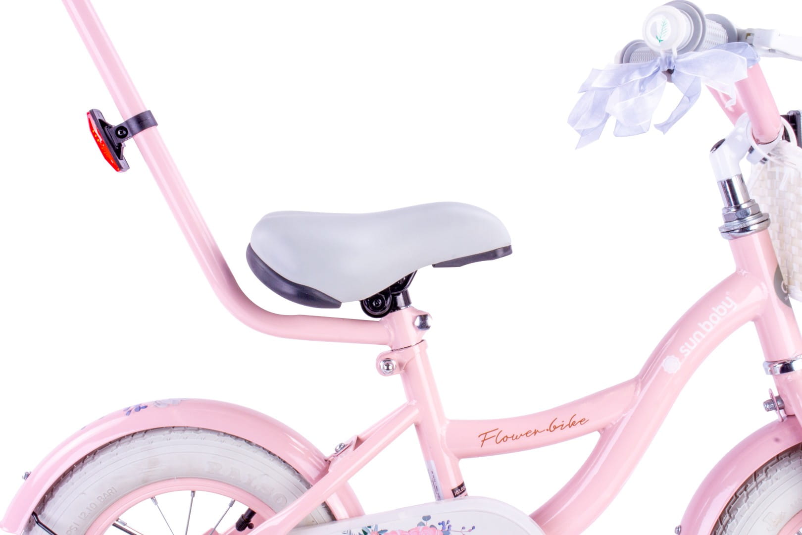 Sun Baby Rowerek dziecięcy 12 cali Flower Bike różowy z koszykiem, pchaczem i kółkami bocznymi