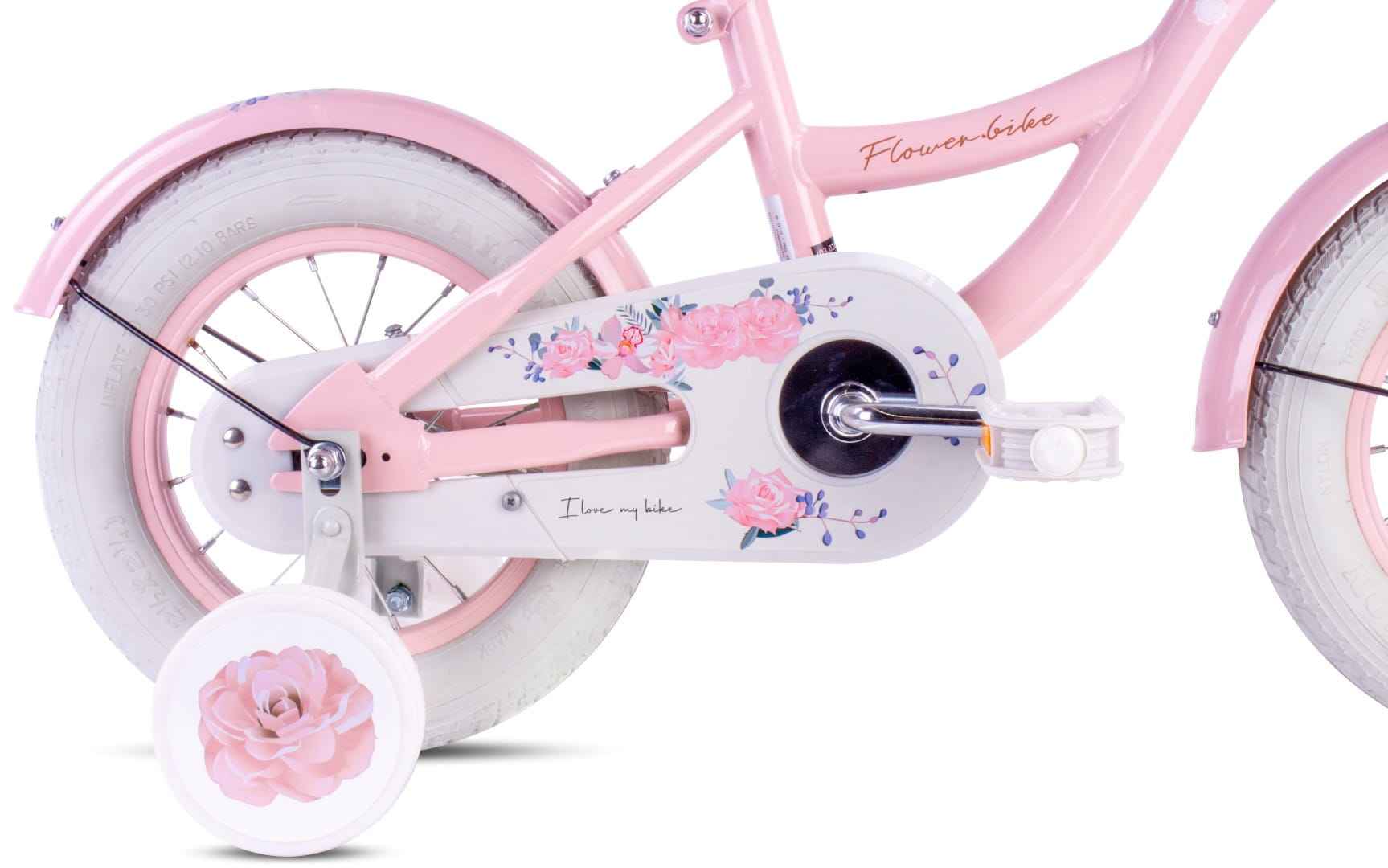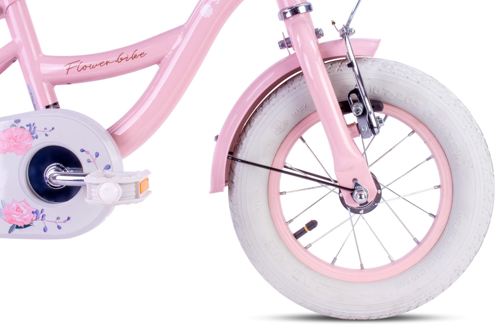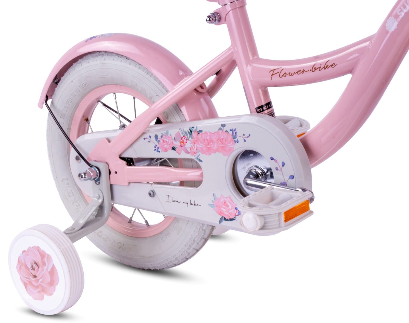 - rowerek zawiera: hamulec V-brake przedniego koła, pełne błotniki, osłonę na łańcuch, dzwonek, kółka boczne, prowadnik, koszyczek