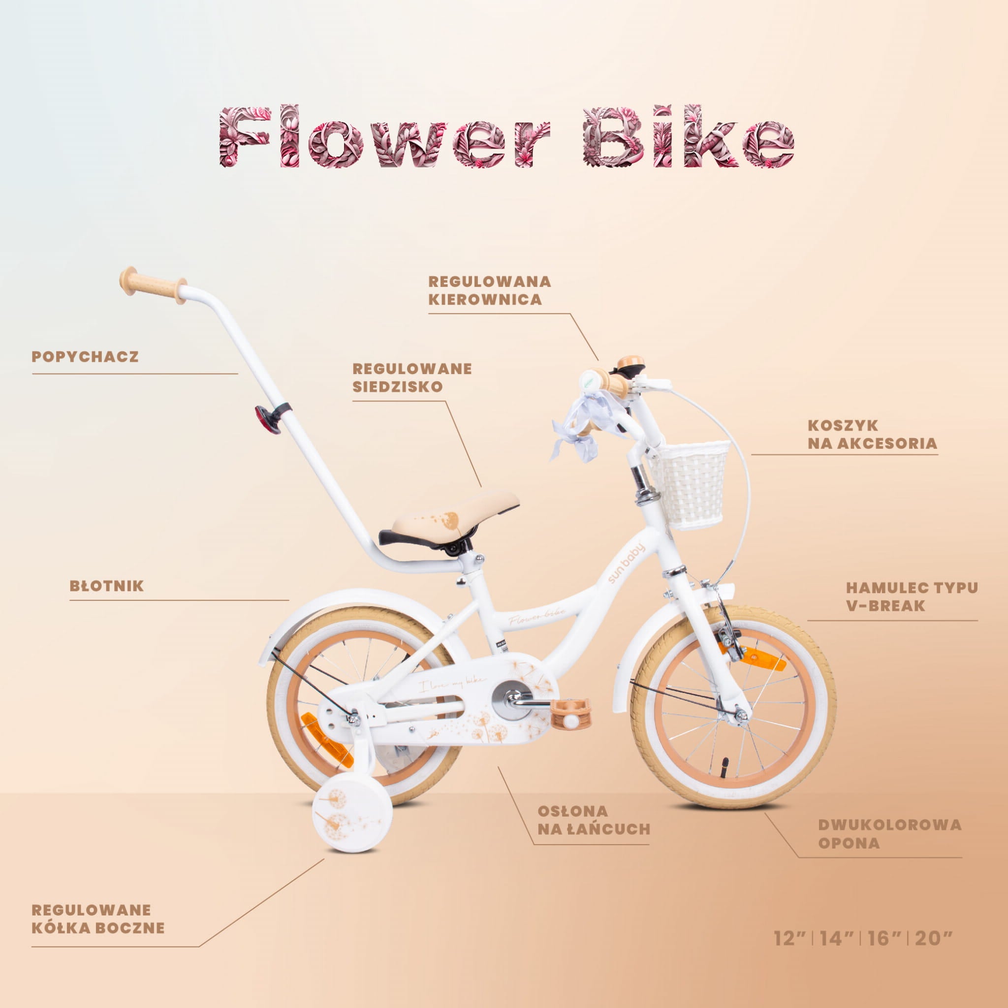 Flower Bike – elegancki rowerek dziecięcy 14 cali w kolorze biało-beżowym, przeznaczony dla dziewczynek w wieku 3–5 lat. Wyposażony w kółka boczne, prowadnik, koszyk i dzwonek. Solidna stalowa rama, regulowane siodełko i kierownica oraz hamulce V-brake gwarantują wygodę i bezpieczeństwo podczas nauki jazdy.