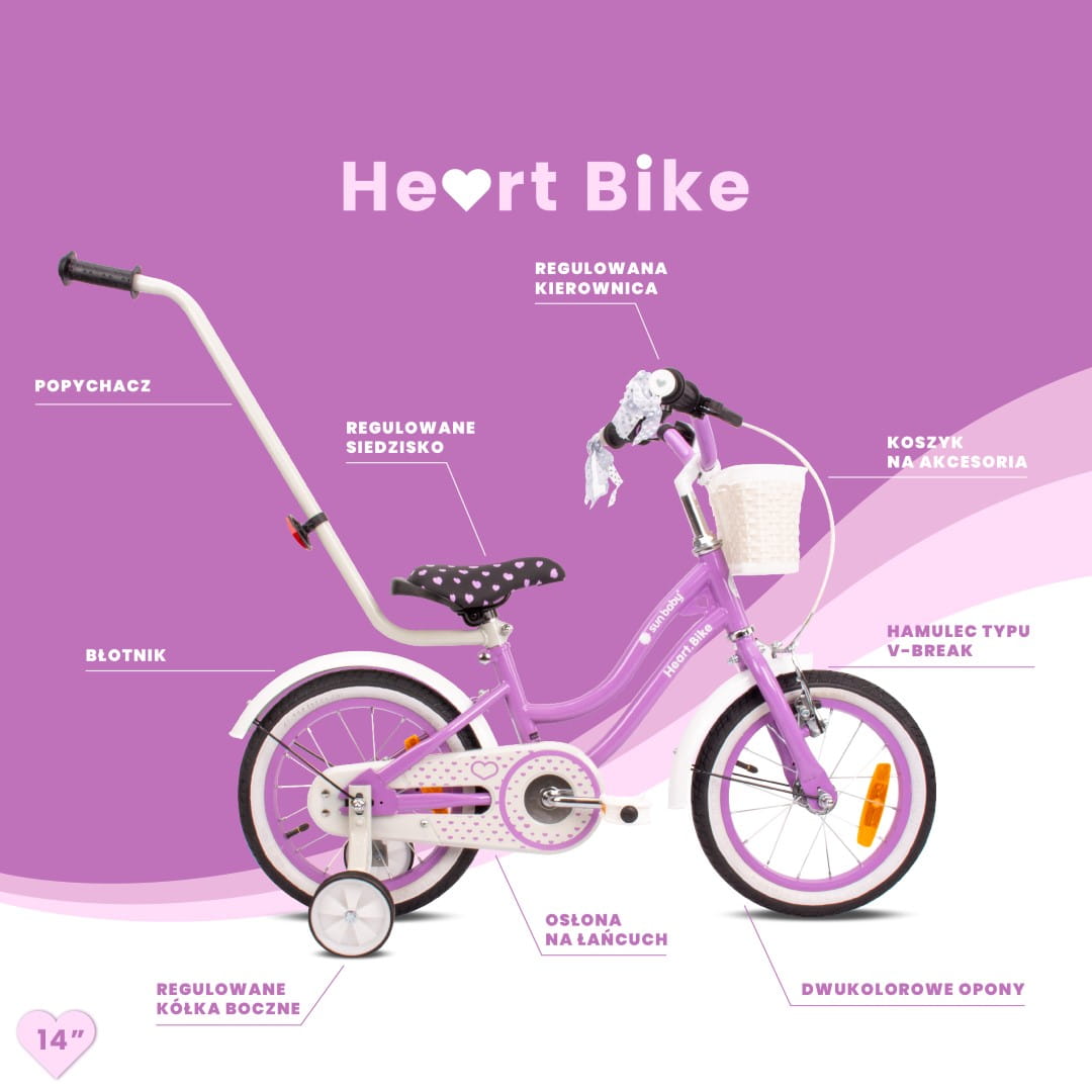 Heart Bike – rower dziecięcy 14 cali w kolorze fioletowym. Wyposażony w boczne kółka, pchacz, koszyczek i dzwonek, to idealny model dla dziewczynki w wieku 3–5 lat. Solidna stalowa rama, regulowane siodełko i kierownica oraz pełne błotniki gwarantują wygodę i bezpieczeństwo podczas nauki jazdy.