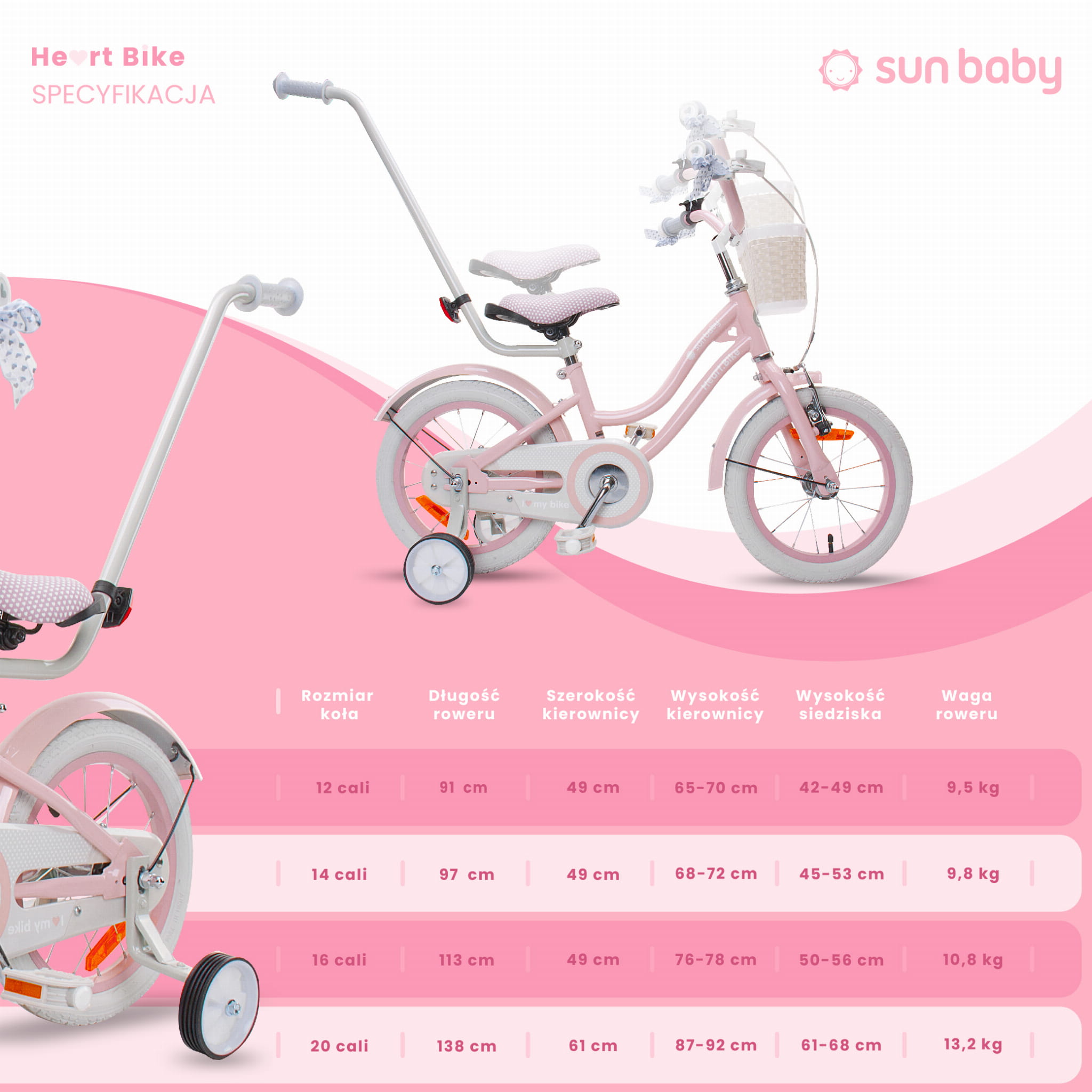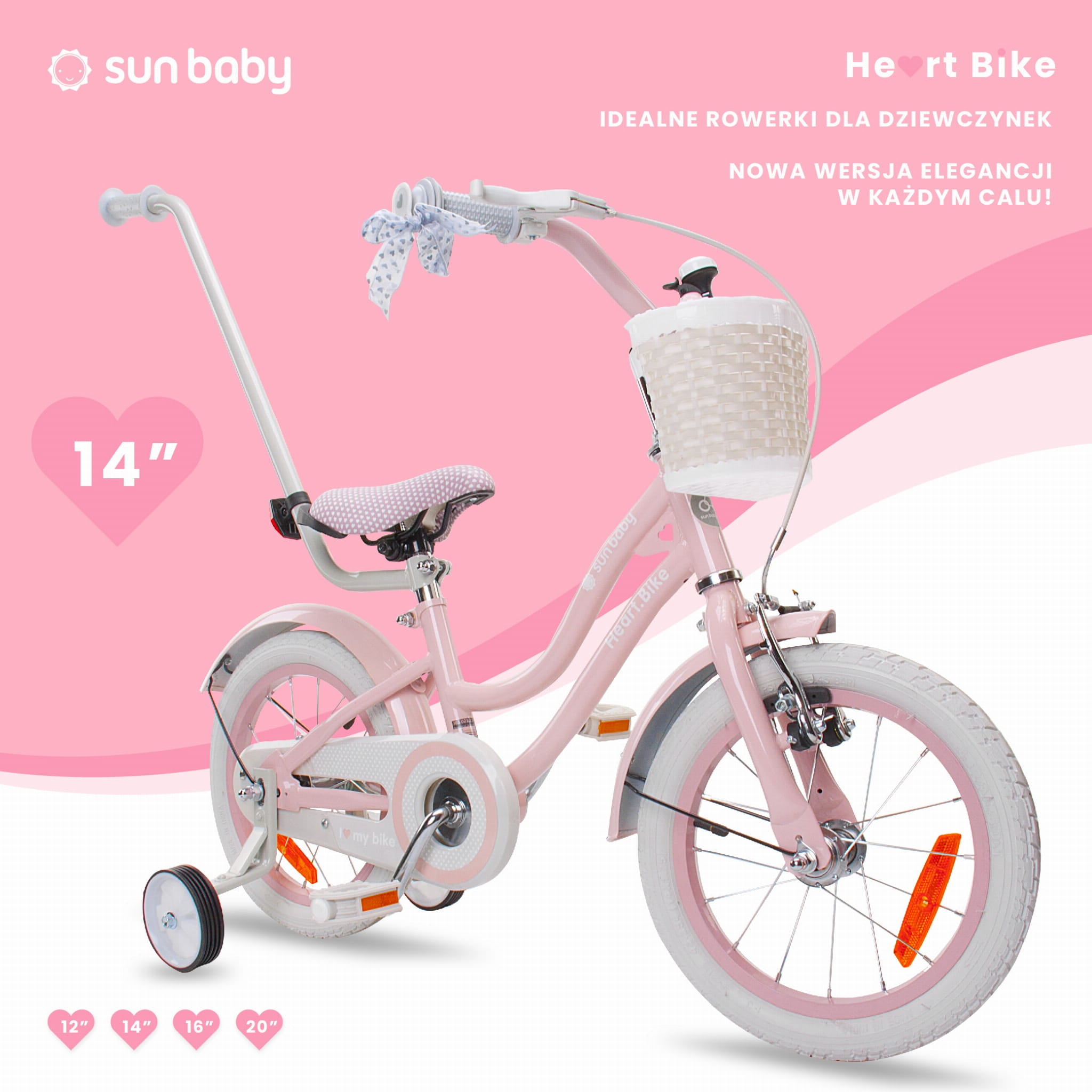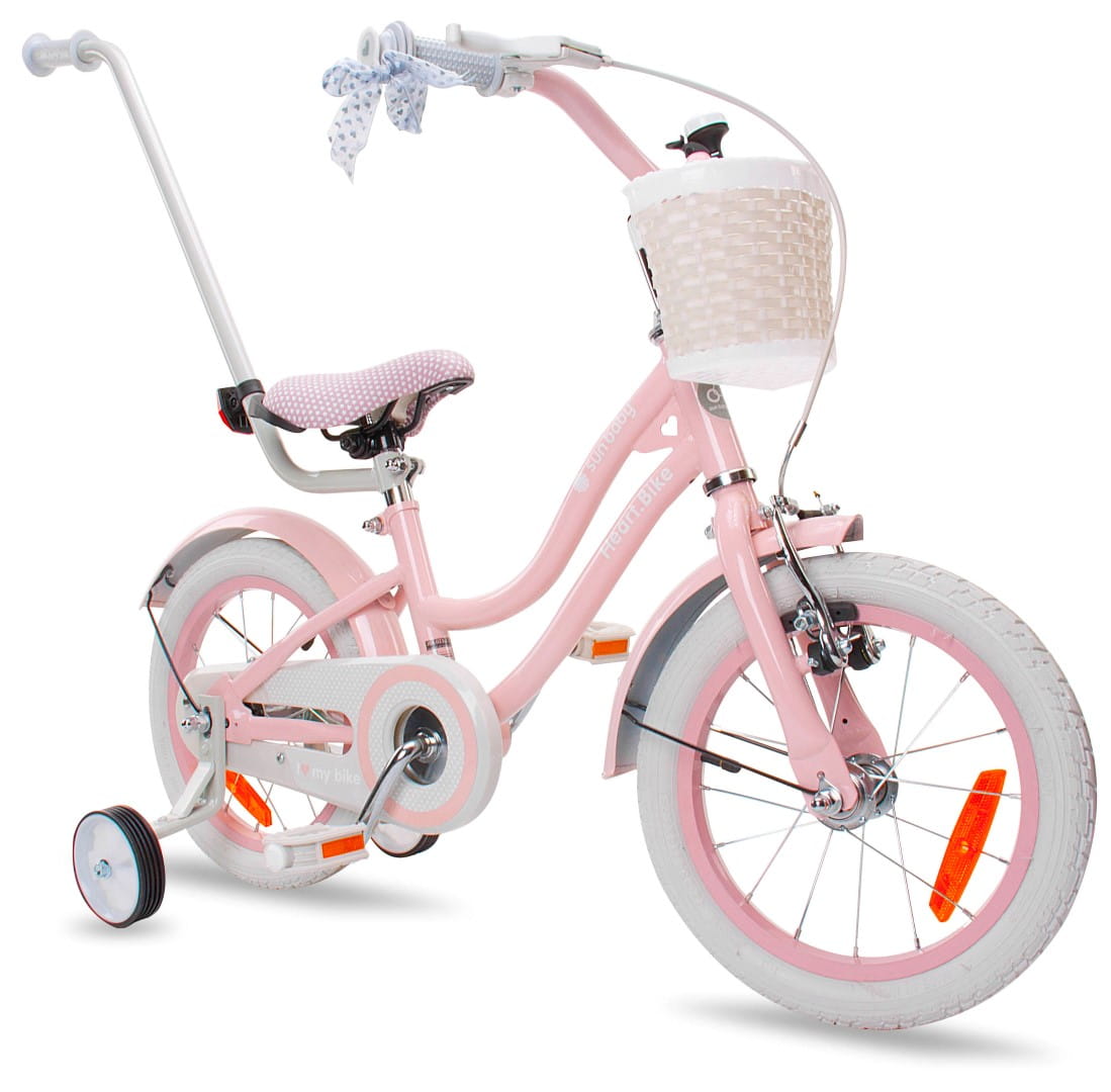 Sun Baby Rower dla dziewczynki 14 cali Silver Moon różowy z kółkami bocznymi i koszykiem