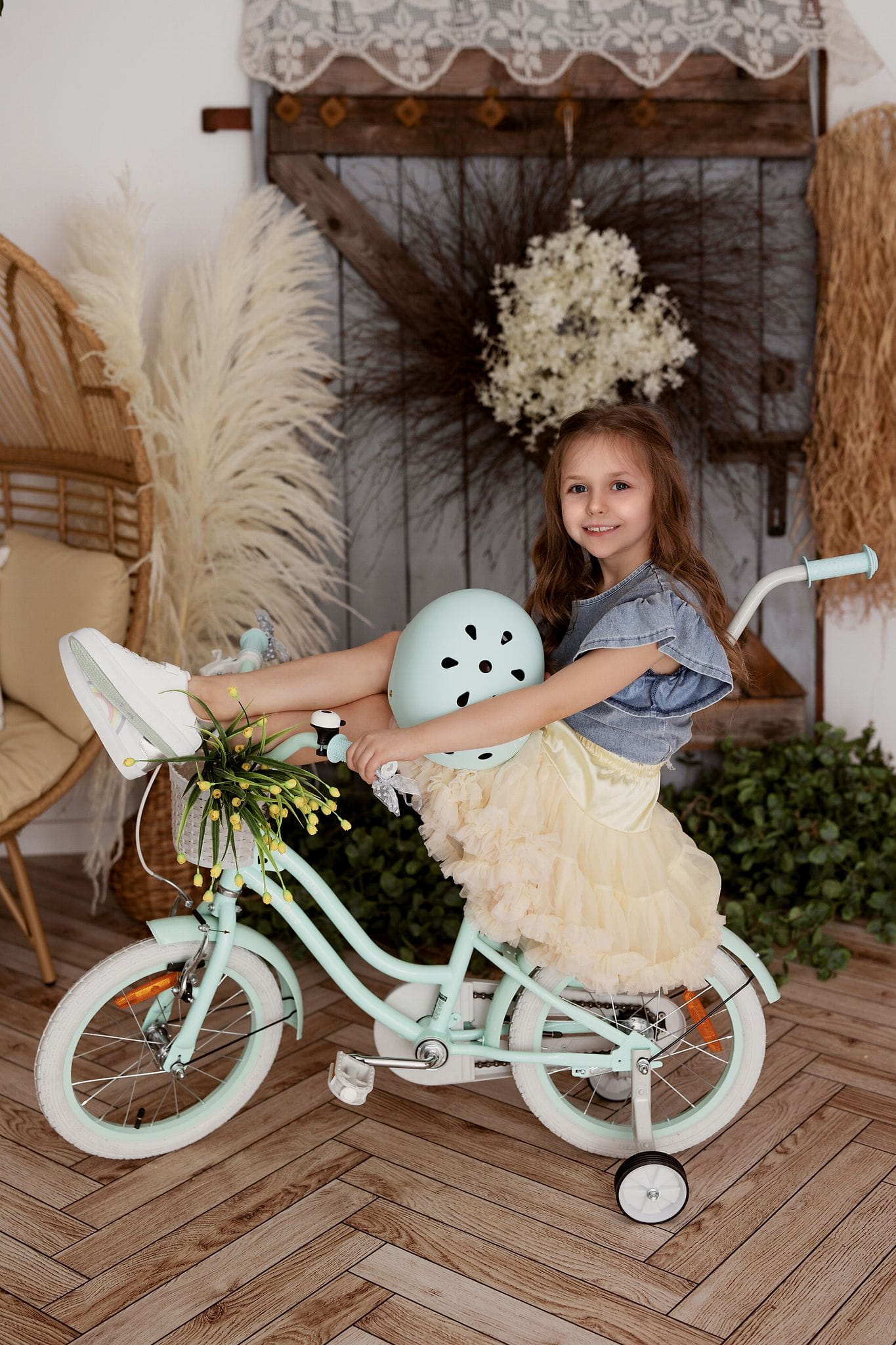 - Wyposażenie: hamulce V-brake przedniego koła, metalowe błotniki, pełna osłona łańcucha, reflektory odblaskowe, prowadnik, boczne kółka, dzwonek, koszyk