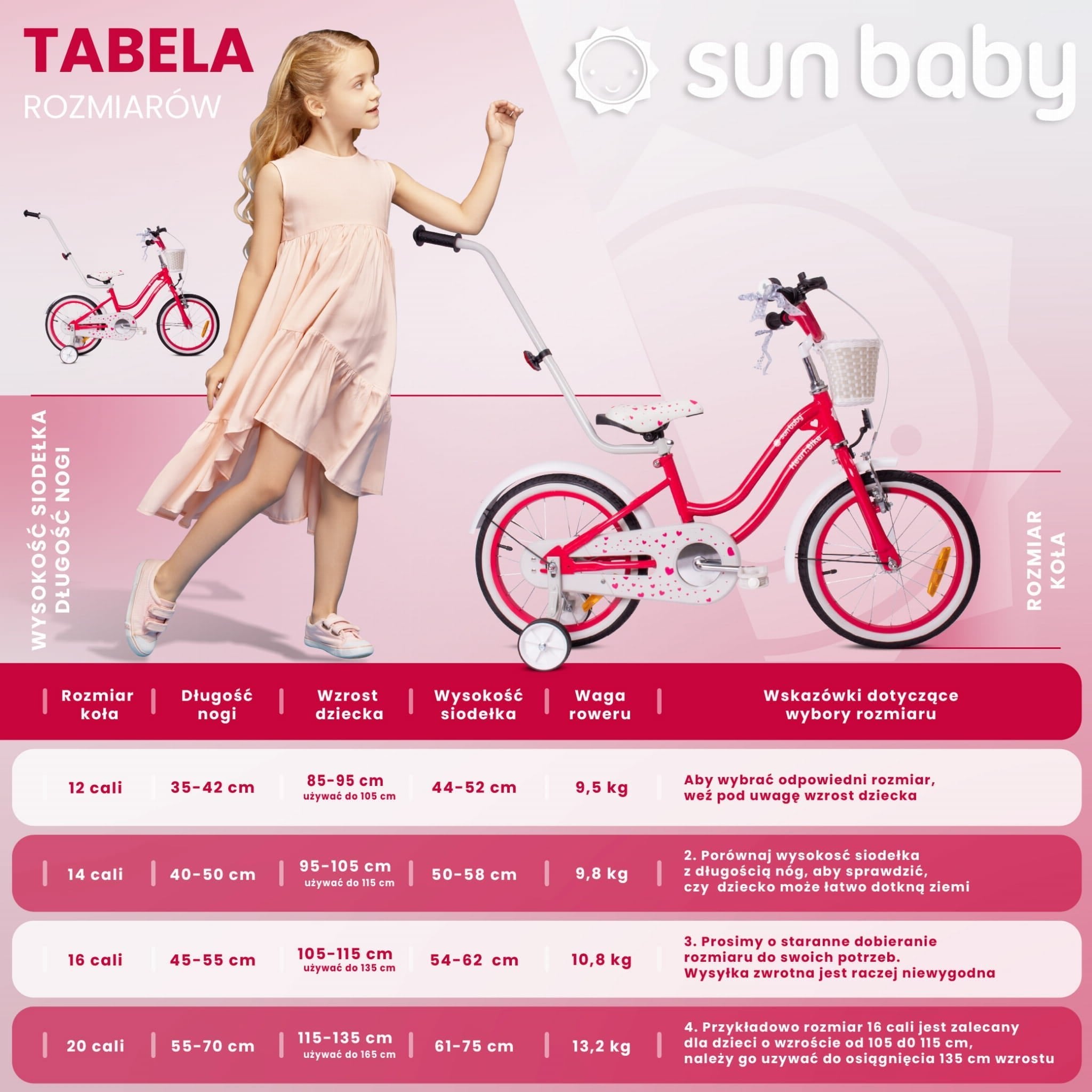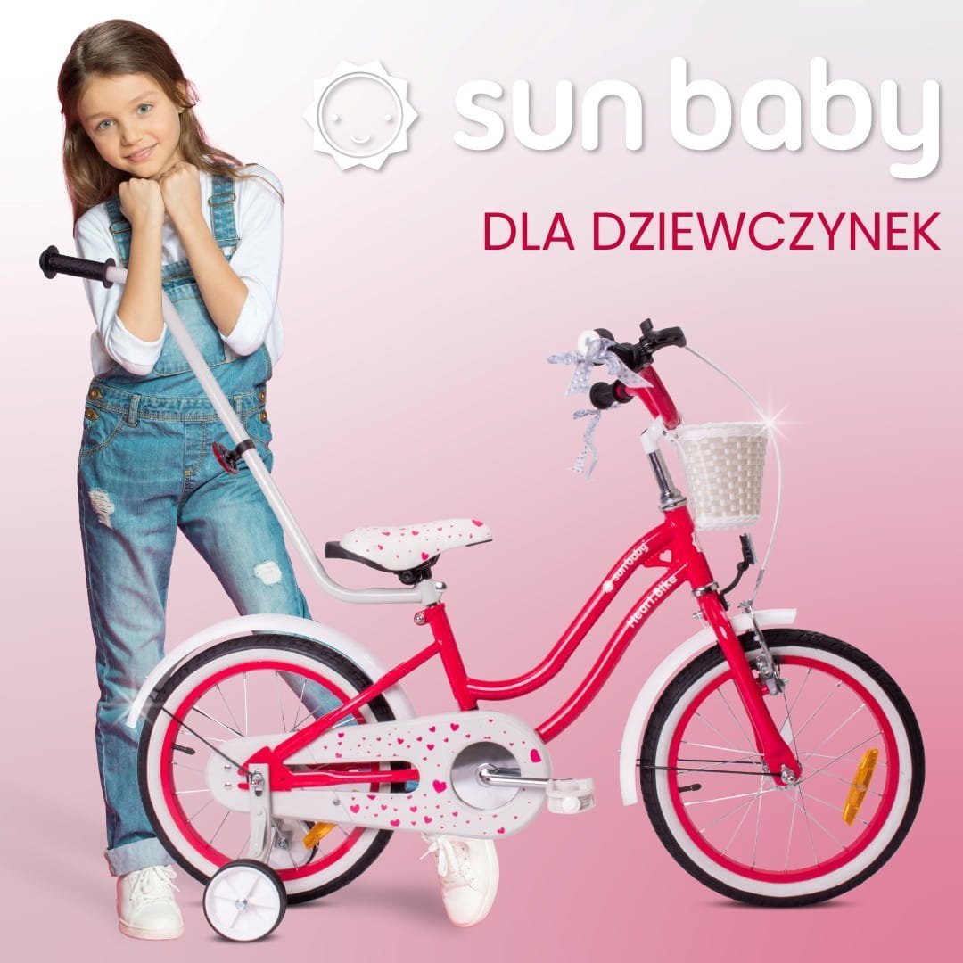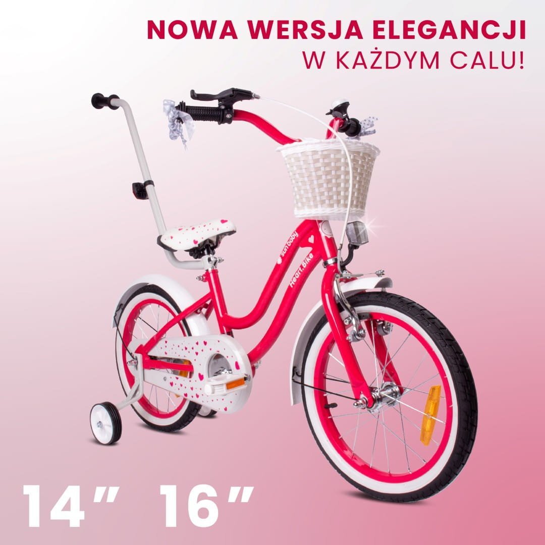 Rower dziecięcy 16 cali dla dziewczynki Pchacz Koszyk Kółka boczne 4-6 lat Heart Bike malina Sun Baby