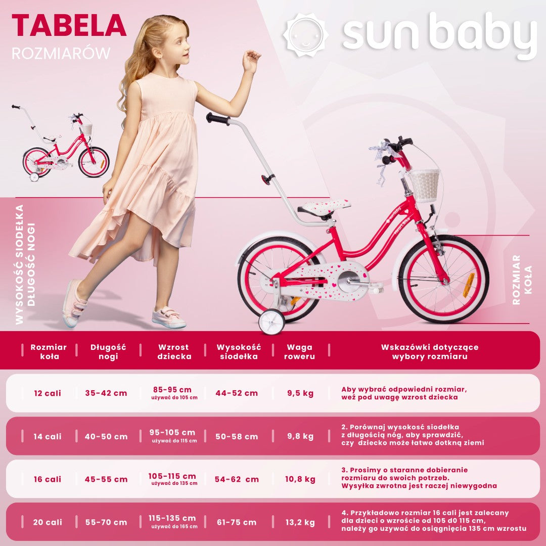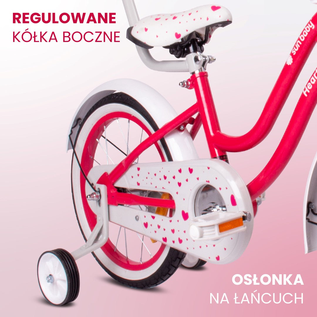 Sun Baby Rower dziecięcy 16 cali dla dziewczynki Pchacz Koszyk Kółka boczne 4-6 lat Heart Bike malina
