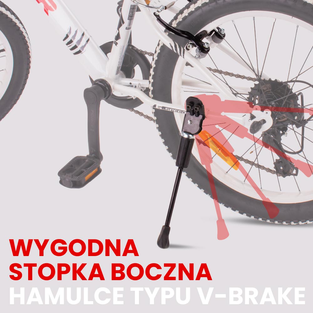 - Szerokie opony terenowe BMX 2.4” na aluminiowych obręczach