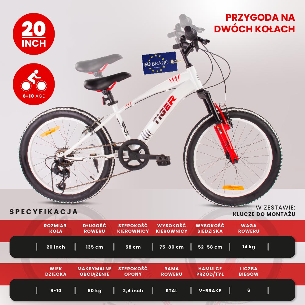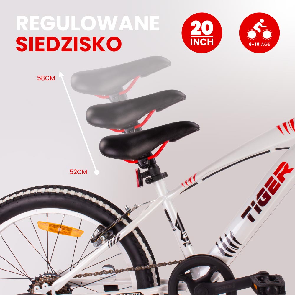 - Rowerek 20” – wzrost 115–135 cm, wiek 6–10 lat