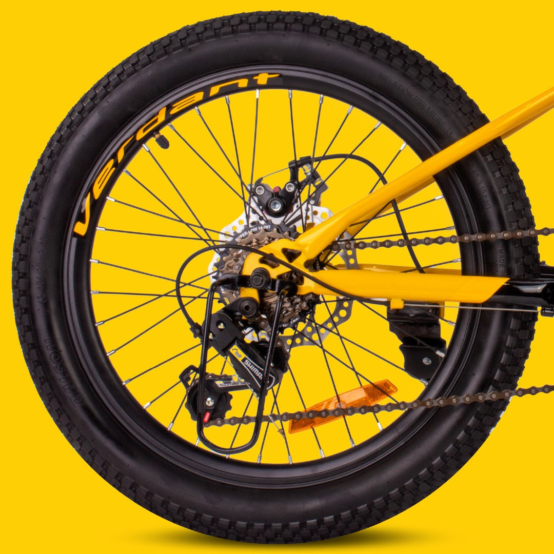 Rower dziecięcy 20 cali dla chłopca dziewczynki MTB Shimano 6 biegów amortyzator szerokie opony Verdant Calix czarny żółty II gatunek